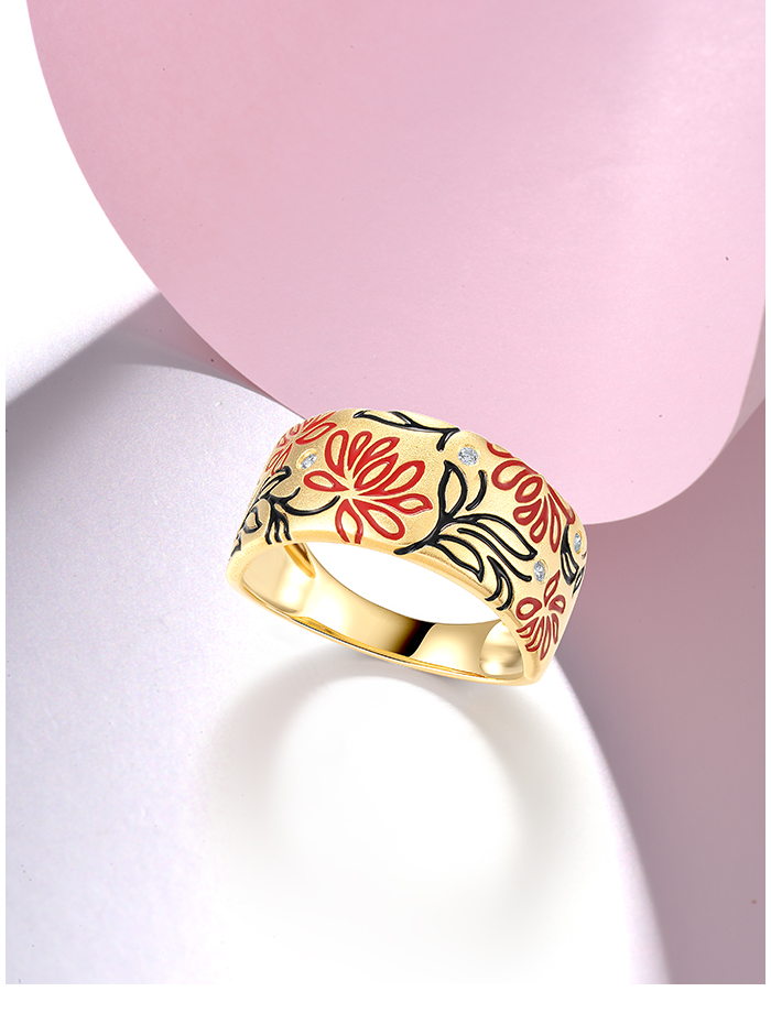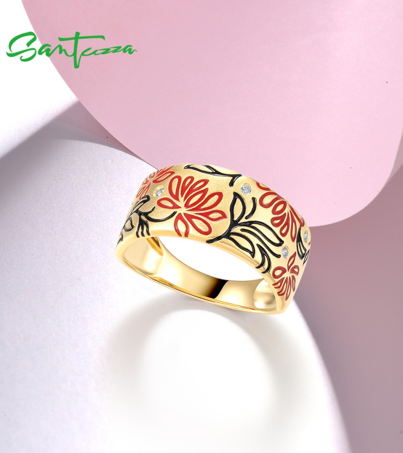 SANTUZZA 925 Sterling Silver Rings Enamel Flower Creative Birthday Daily Gifts Fine Jewelry - Yellow Gold Plating/US 8
