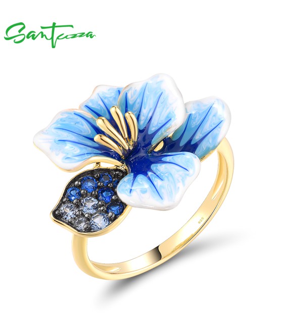 SANTUZZA 925 Sterling Silver Ring Blue Spinel Enamel Flower Chic Wedding Gifts Fine Jewelry