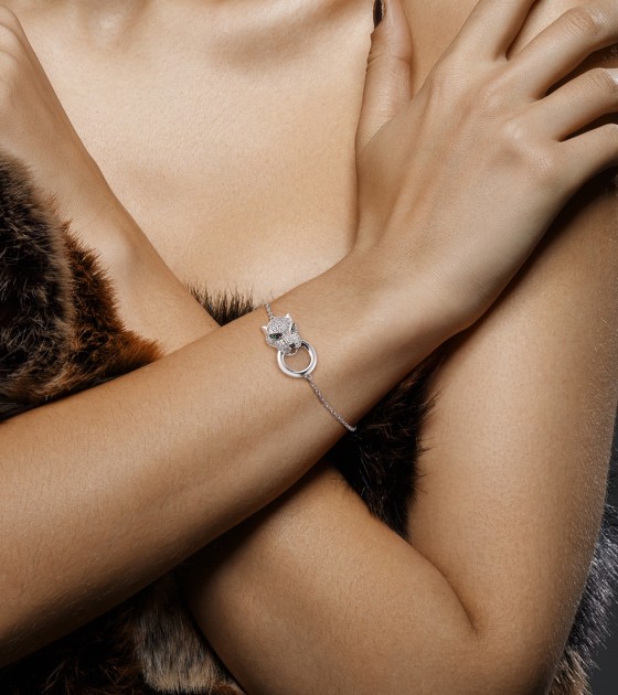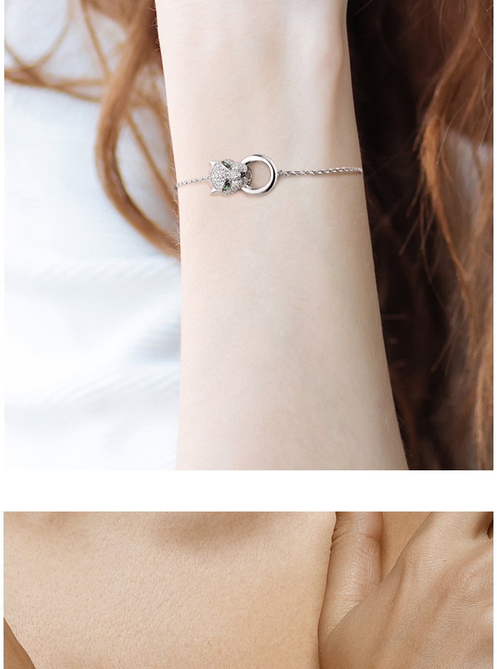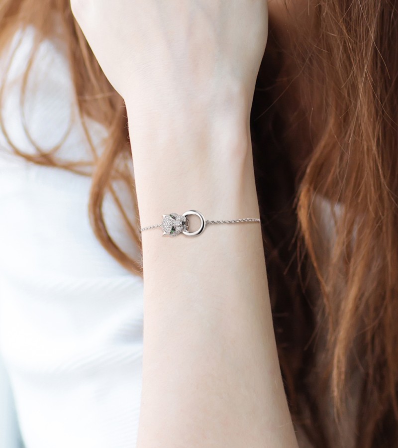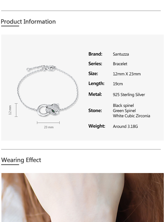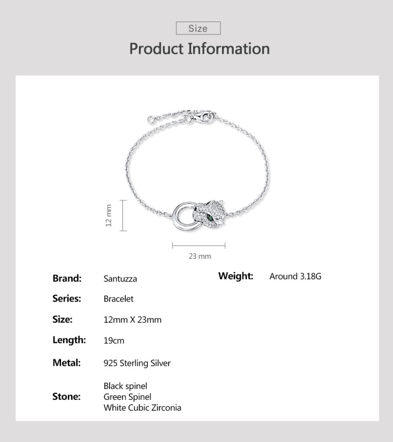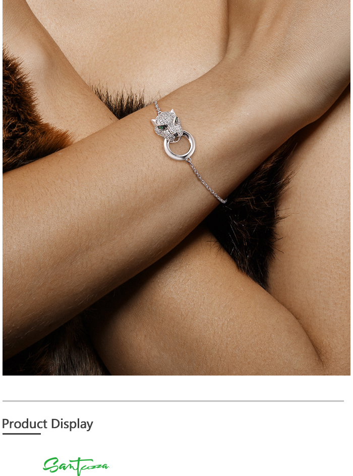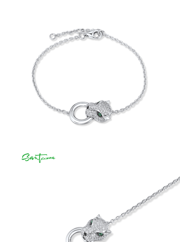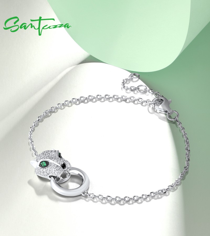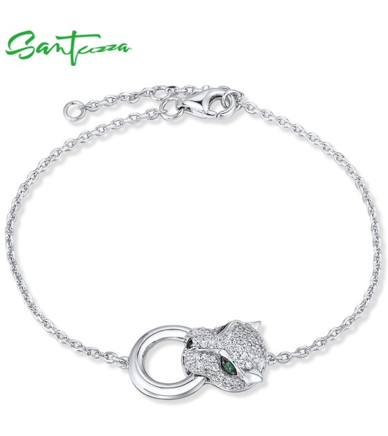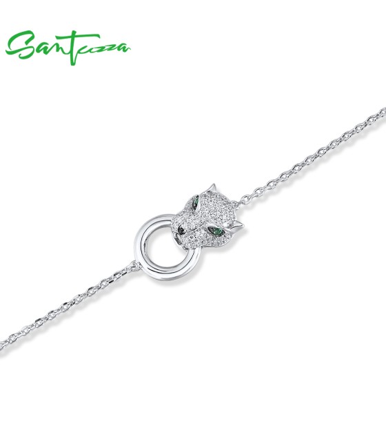 SANTUZZA 925 Sterling Silver Bracelet Leopard Panther Green Black Spinel White Zirconia Animal Jewelry