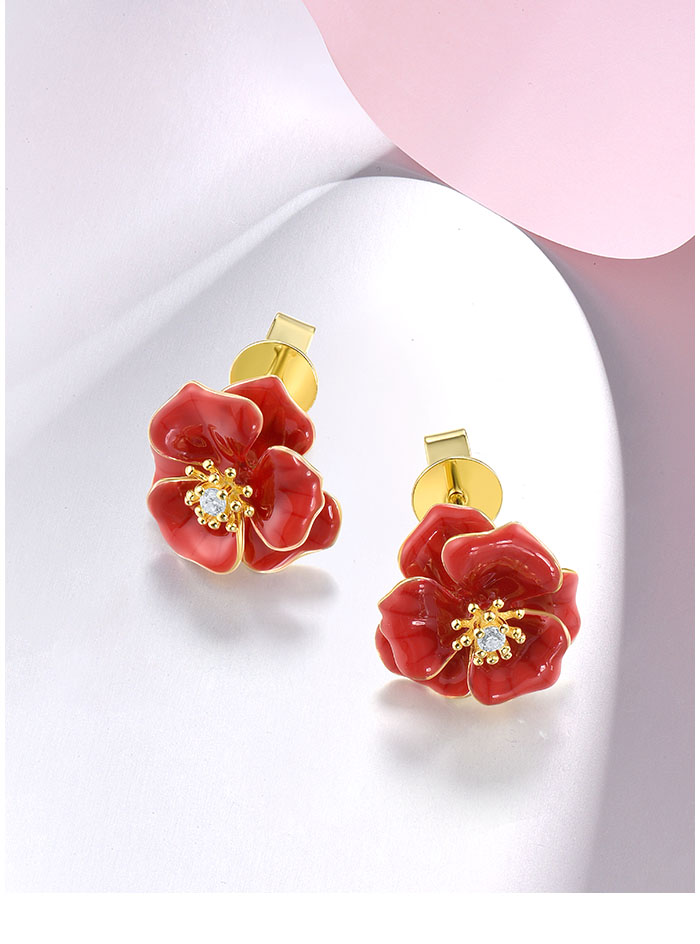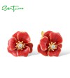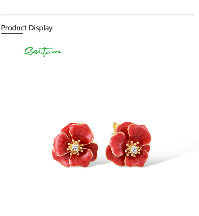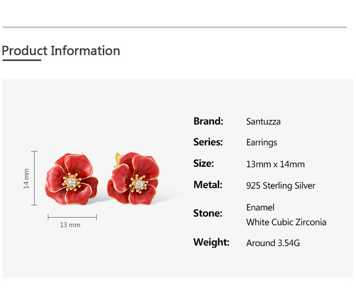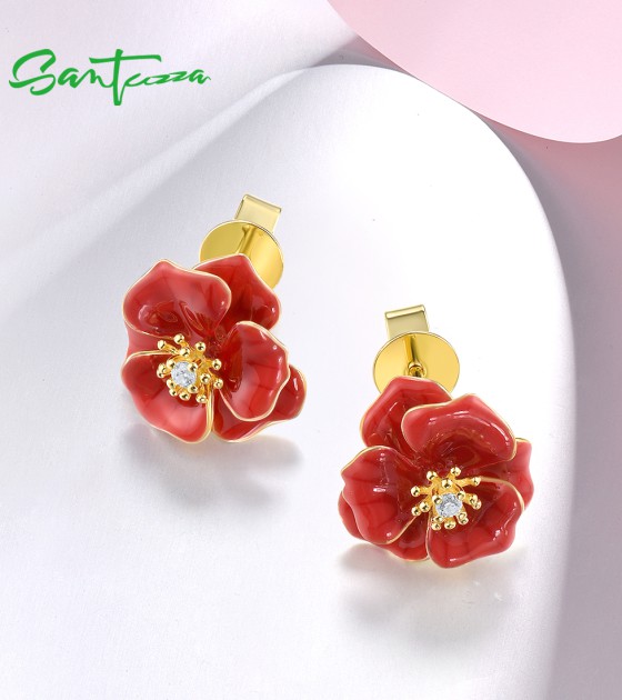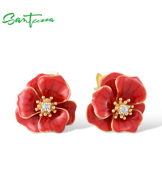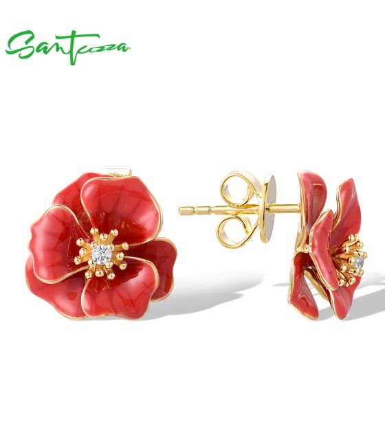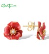 SANTUZZA 925 Sterling Silver Earrings White CZ Red Enamel Blossom Flower Fine Jewelry