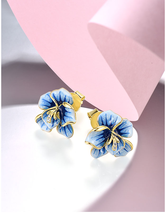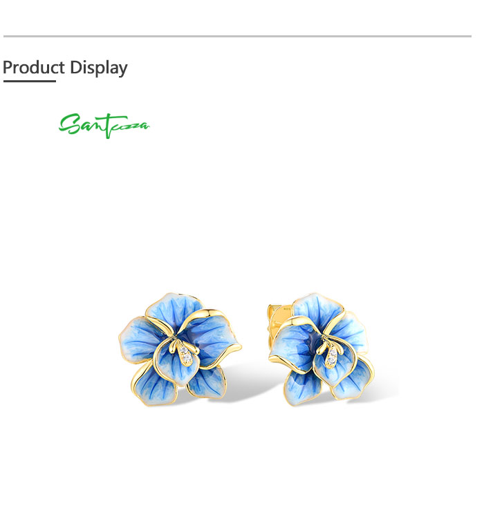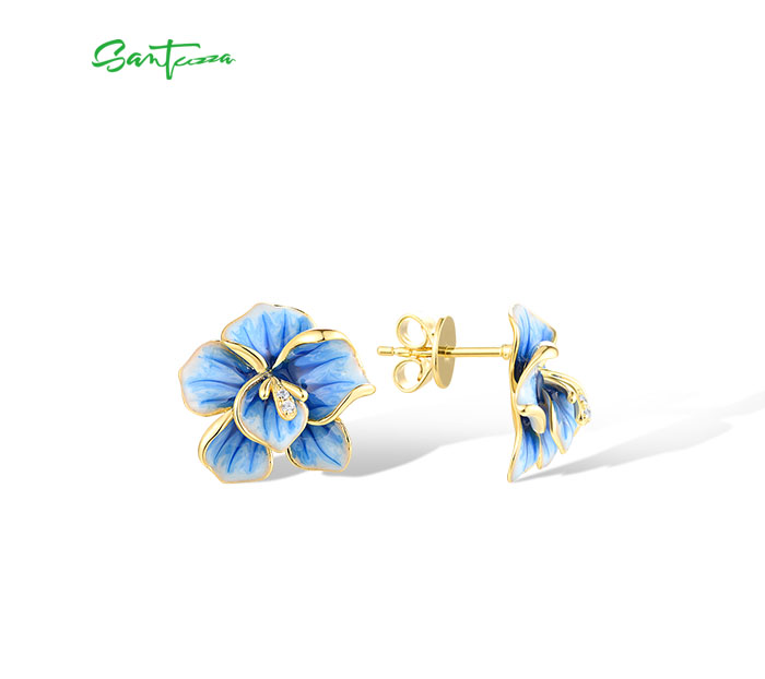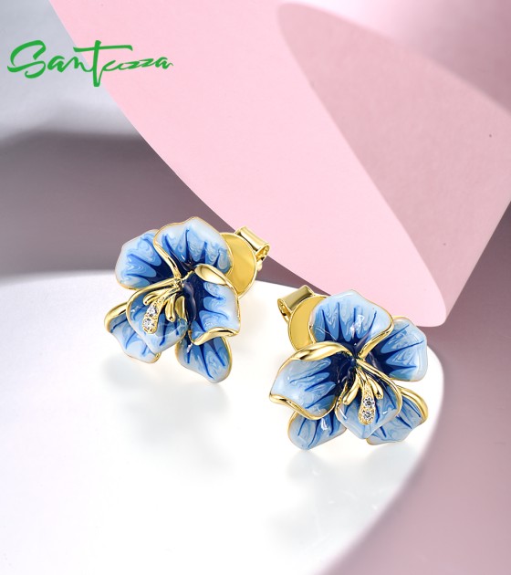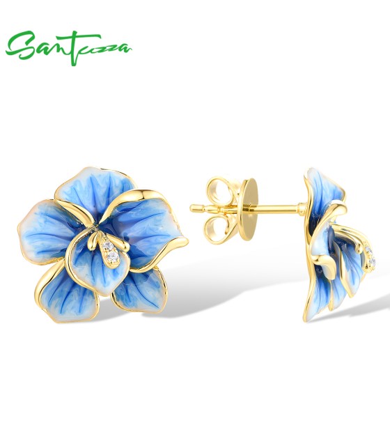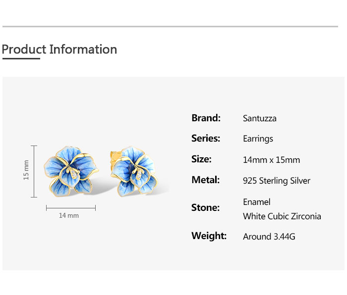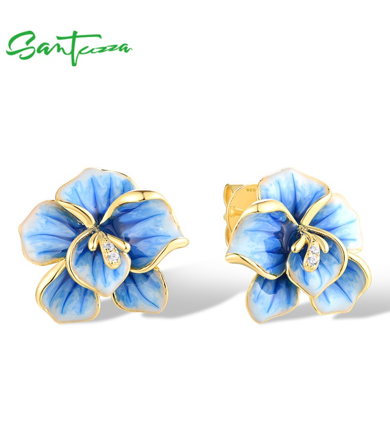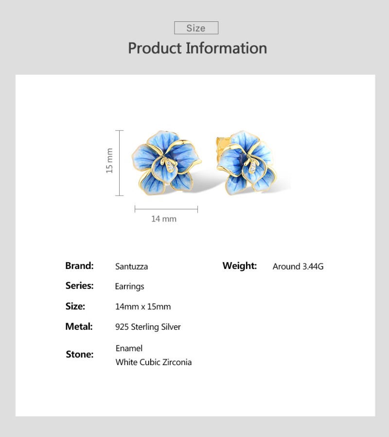 SANTUZZA 925 Sterling Silver Earrings White CZ Blue Enamel Blossom Flower Fine Jewelry