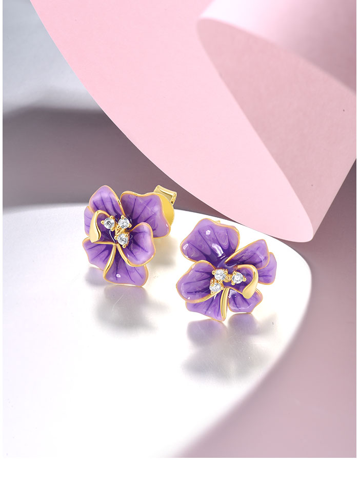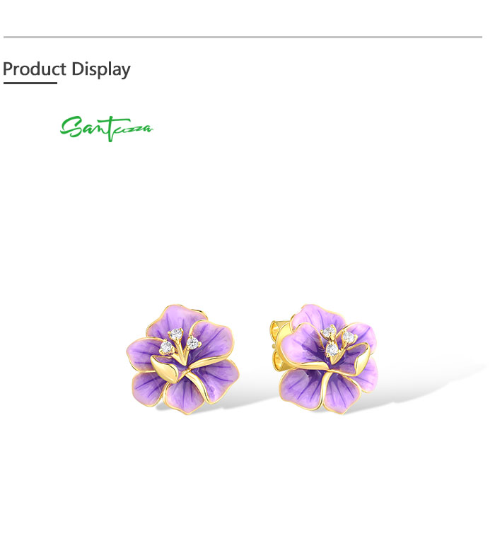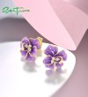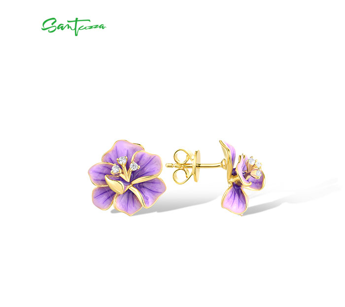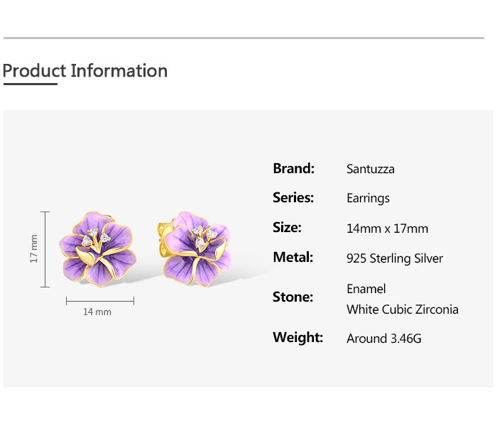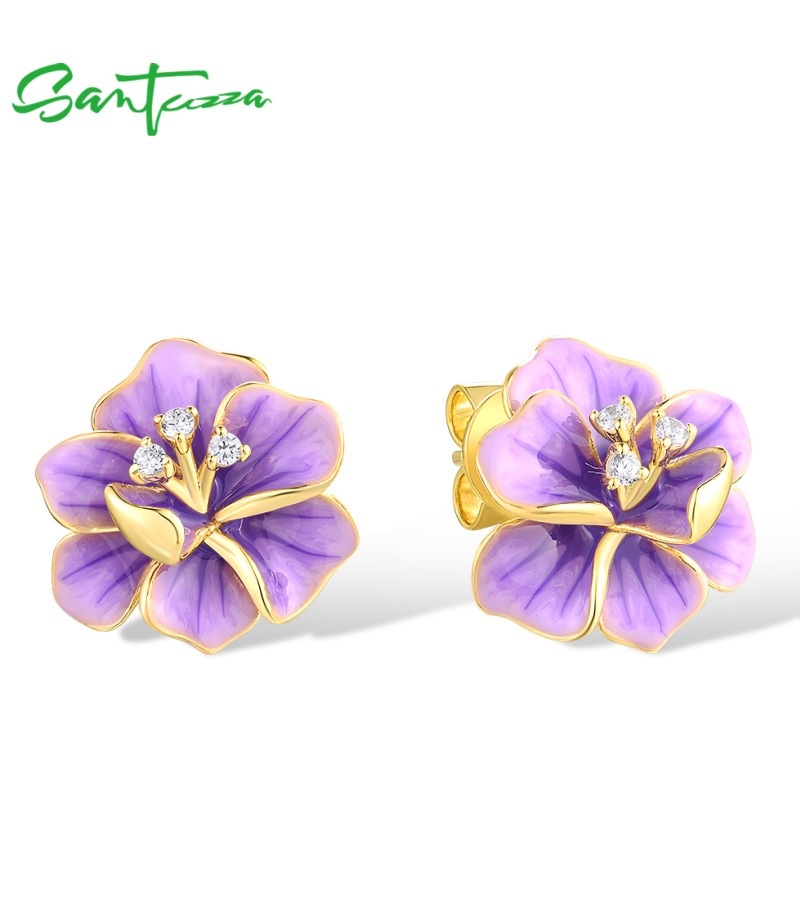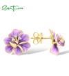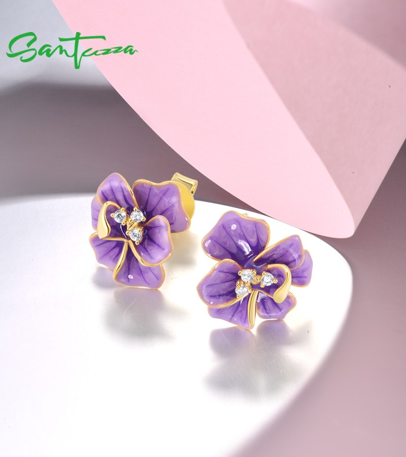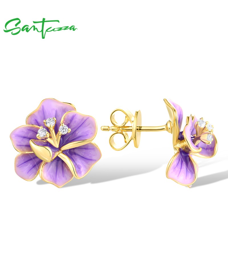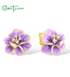 SANTUZZA 925 Sterling Silver Earrings White CZ Purple Enamel Flower Fine Jewelry