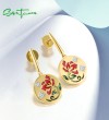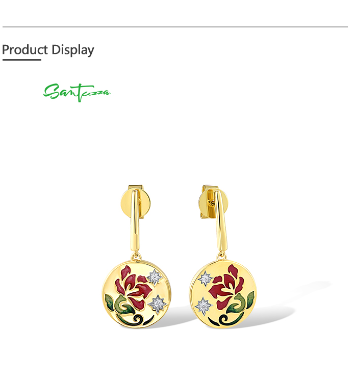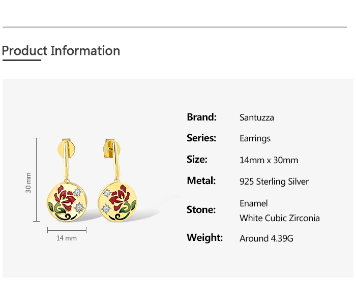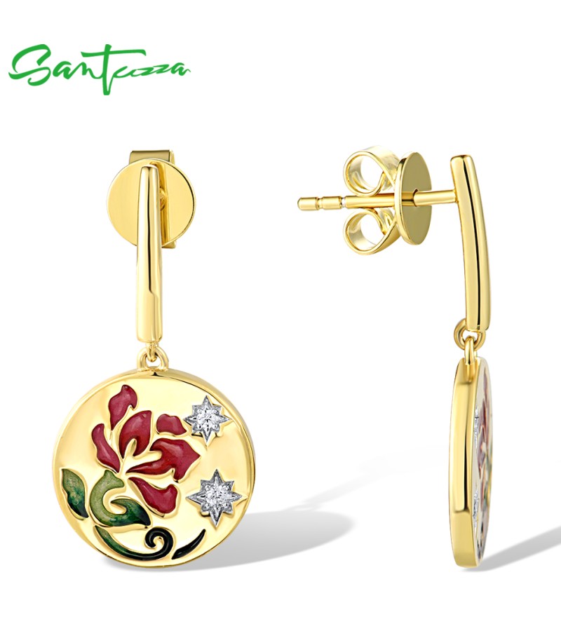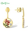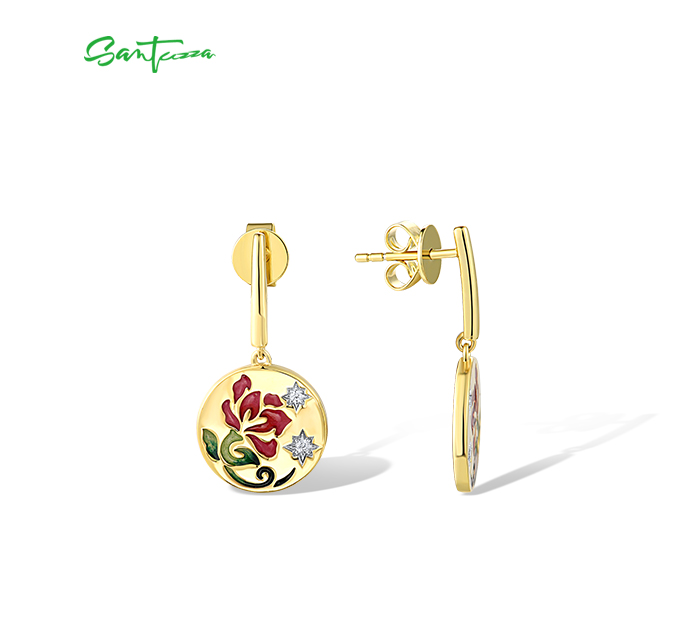 SANTUZZA 925 Sterling Silver Drop Earrings Sparkling White CZ Red Flower Enamel Jewelry