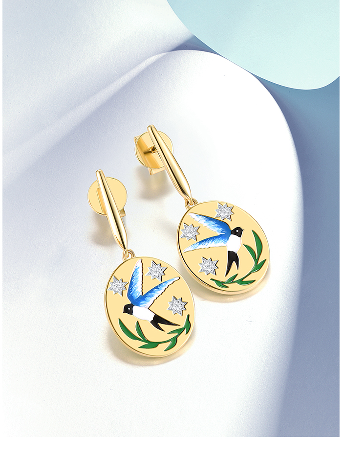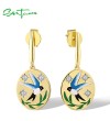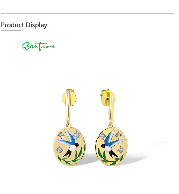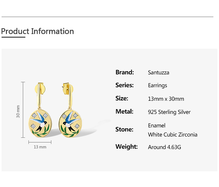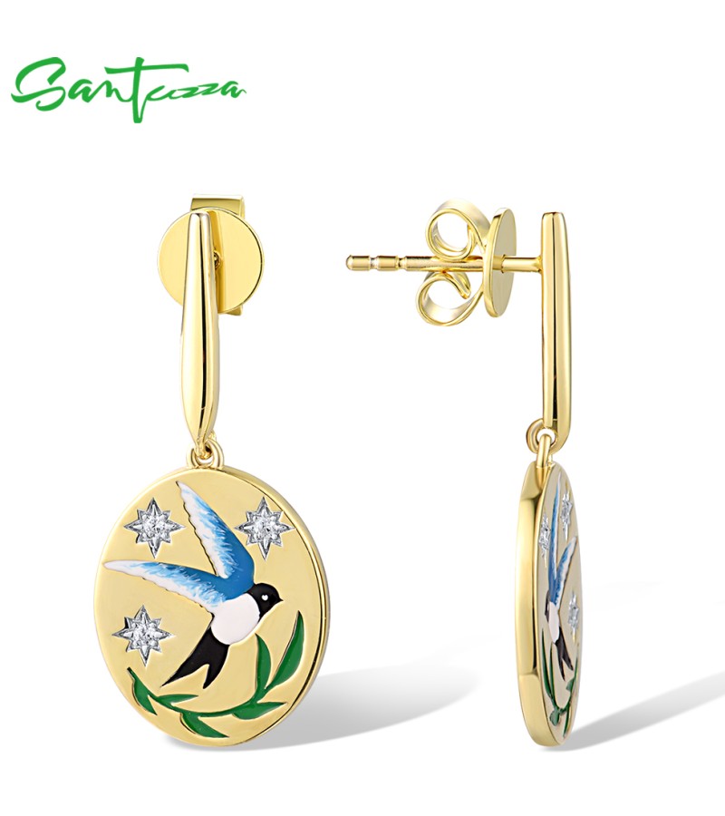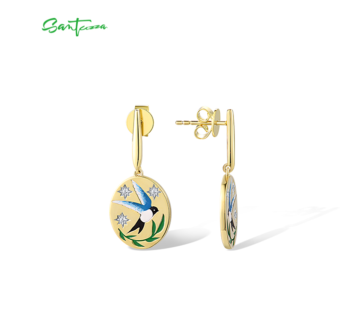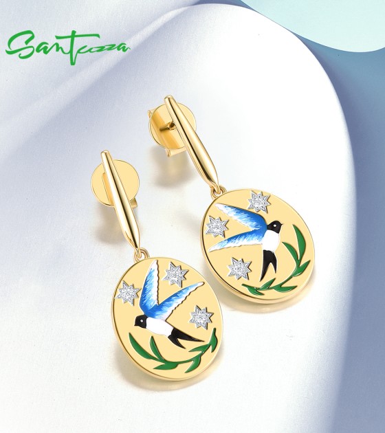 SANTUZZA 925 Sterling Silver Drop Earrings White Blue Bird Enamel Jewelry