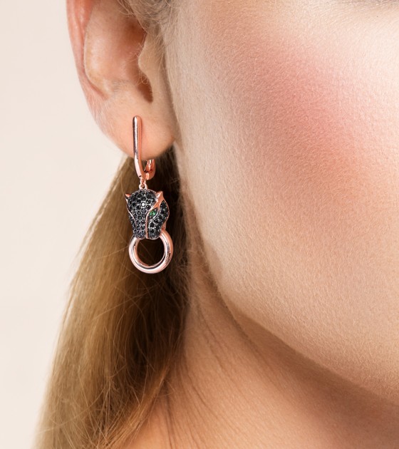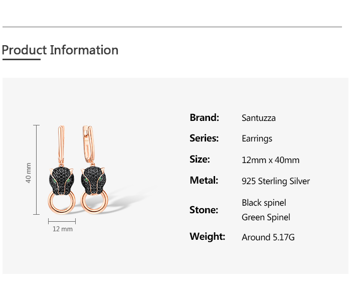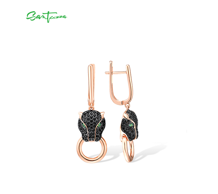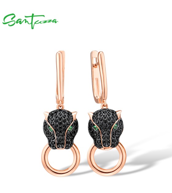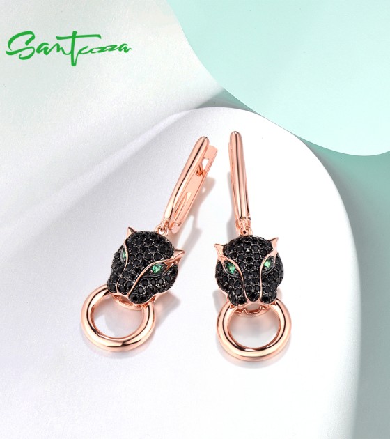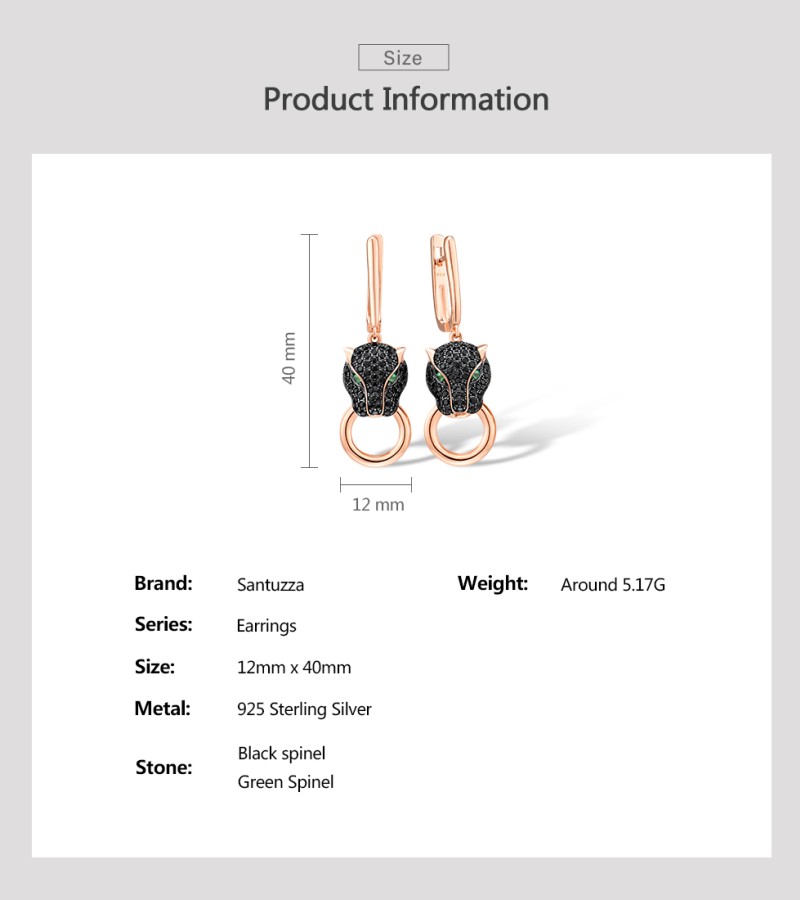 SANTUZZA 925 Sterling Silver Drop Earrings Black Spinel Leopard Panther Animal Jewelry