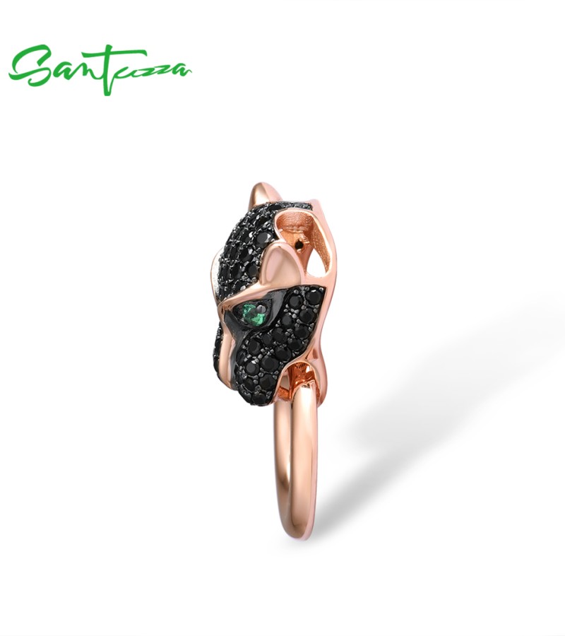 SANTUZZA 925 Sterling Silver Ring Dazzling Black Green Spinel Leopard Panther Animal Jewelry - US 8.5