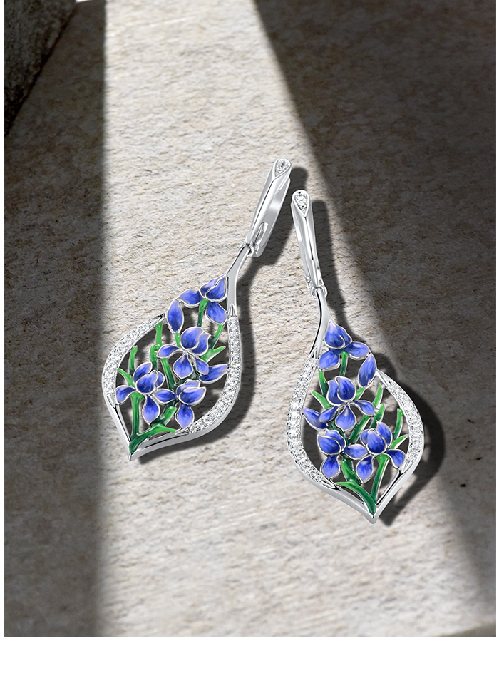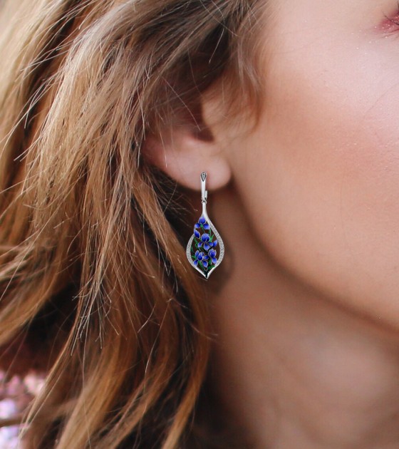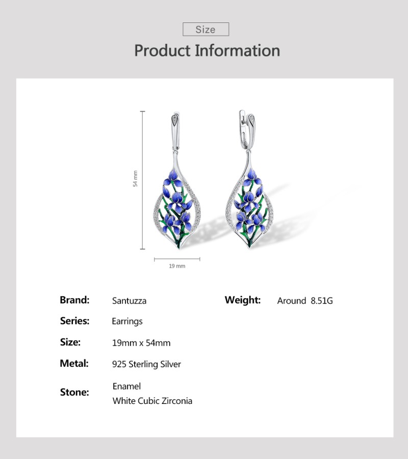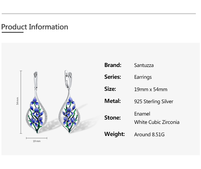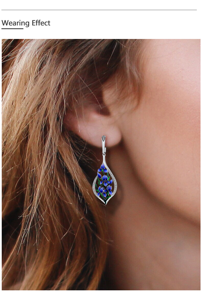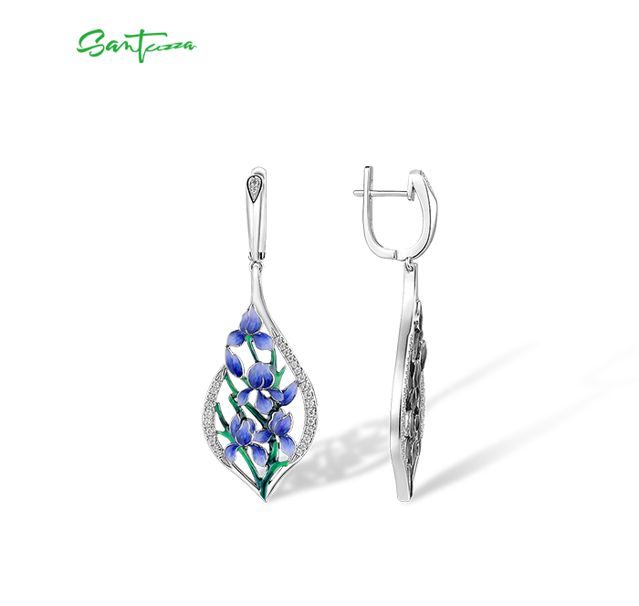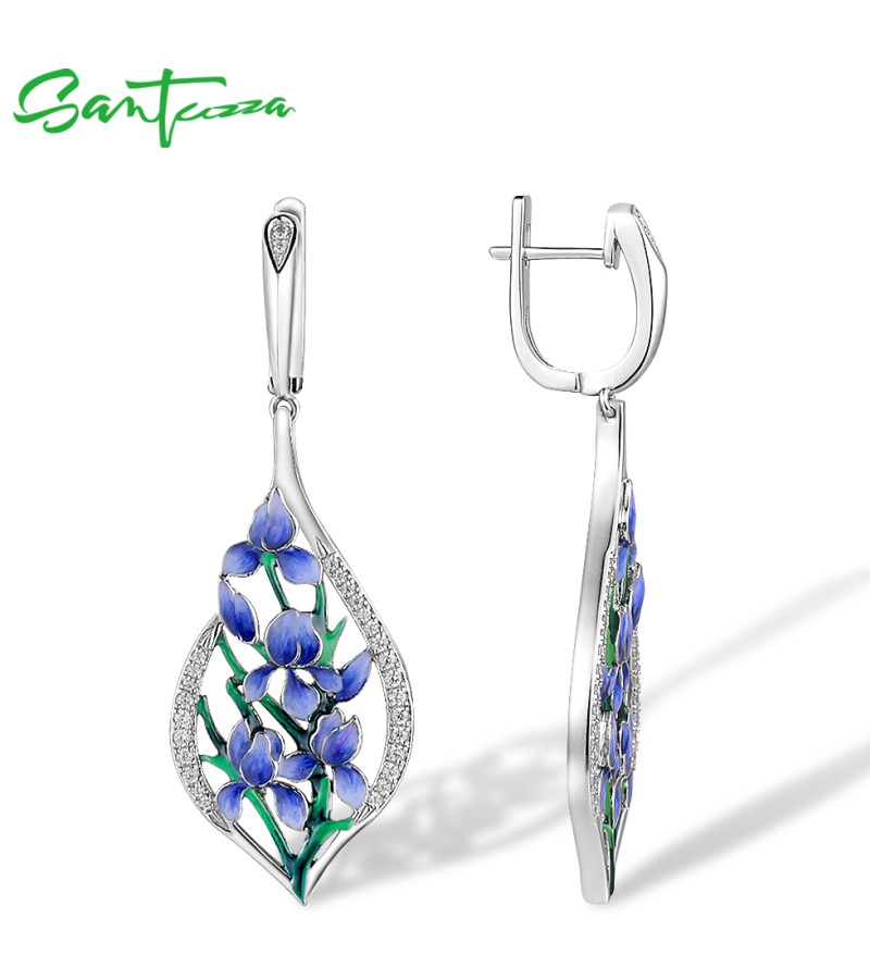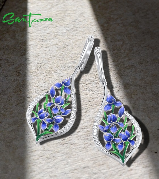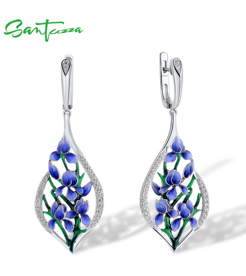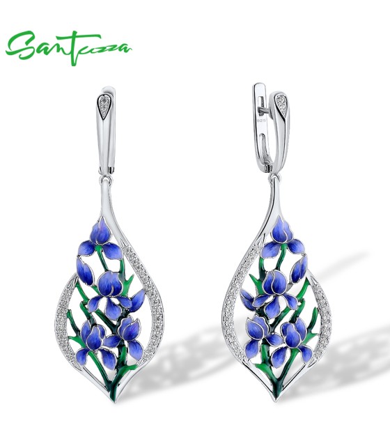 SANTUZZA 925 Sterling Silver Earrings White CZ Blue Orchid Flower Dangling Enamel Jewelry