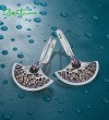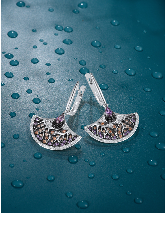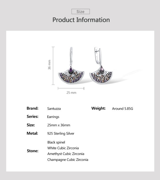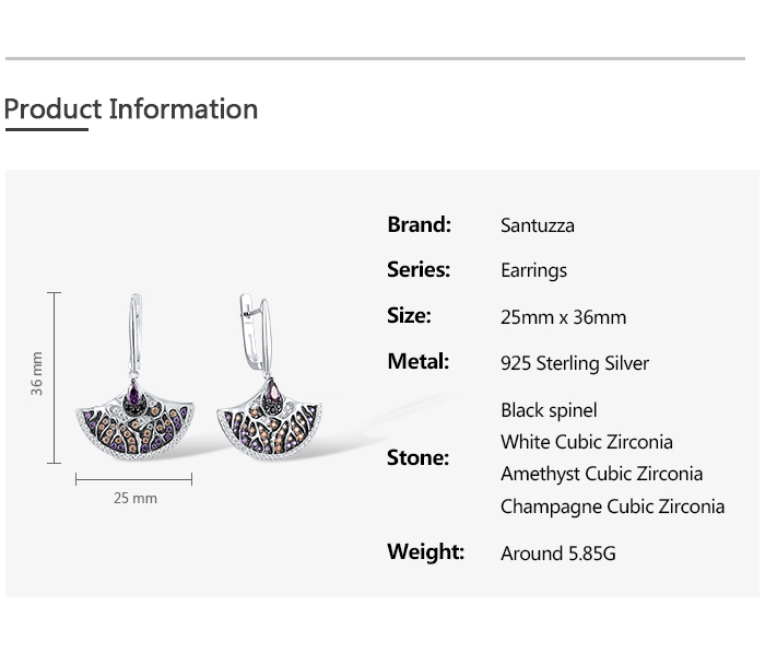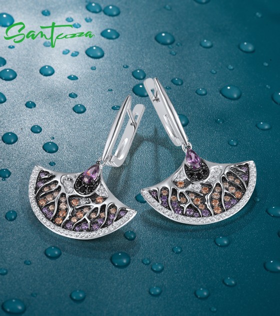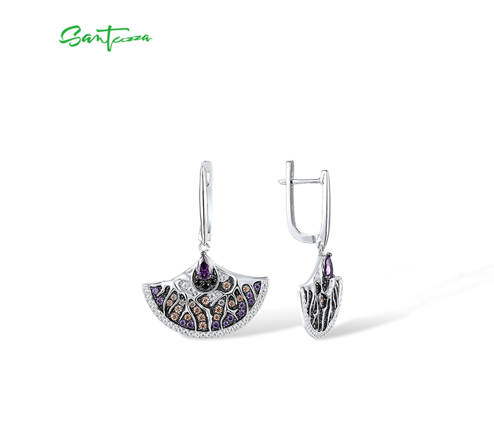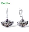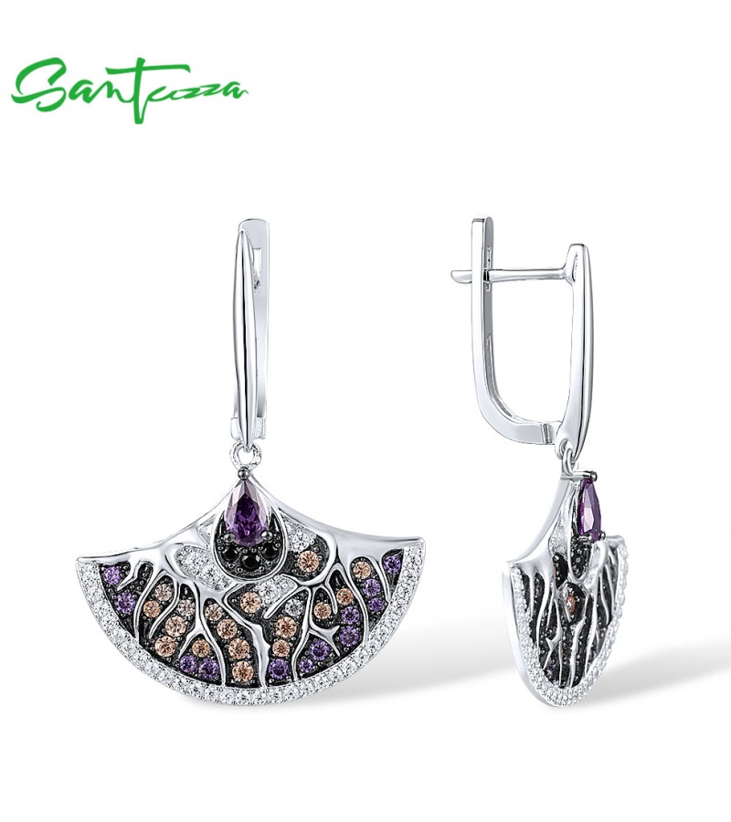 SANTUZZA Fan Shape Earrings 925 Sterling Silver Black White Amethyst CZ Jewelry