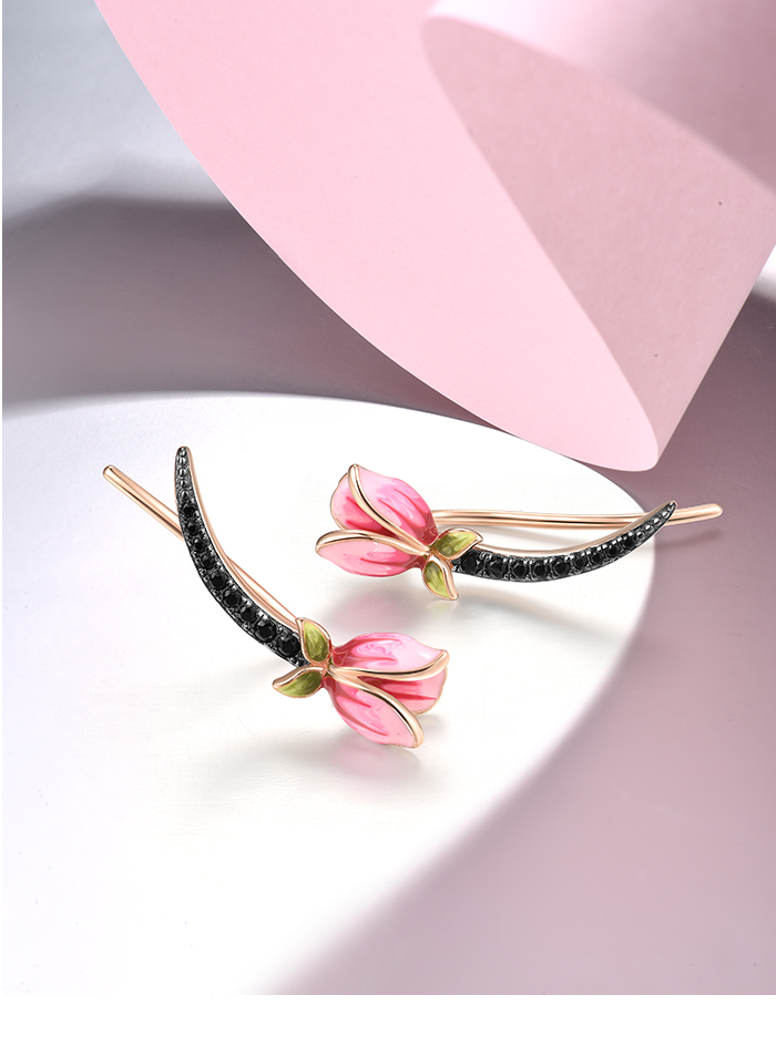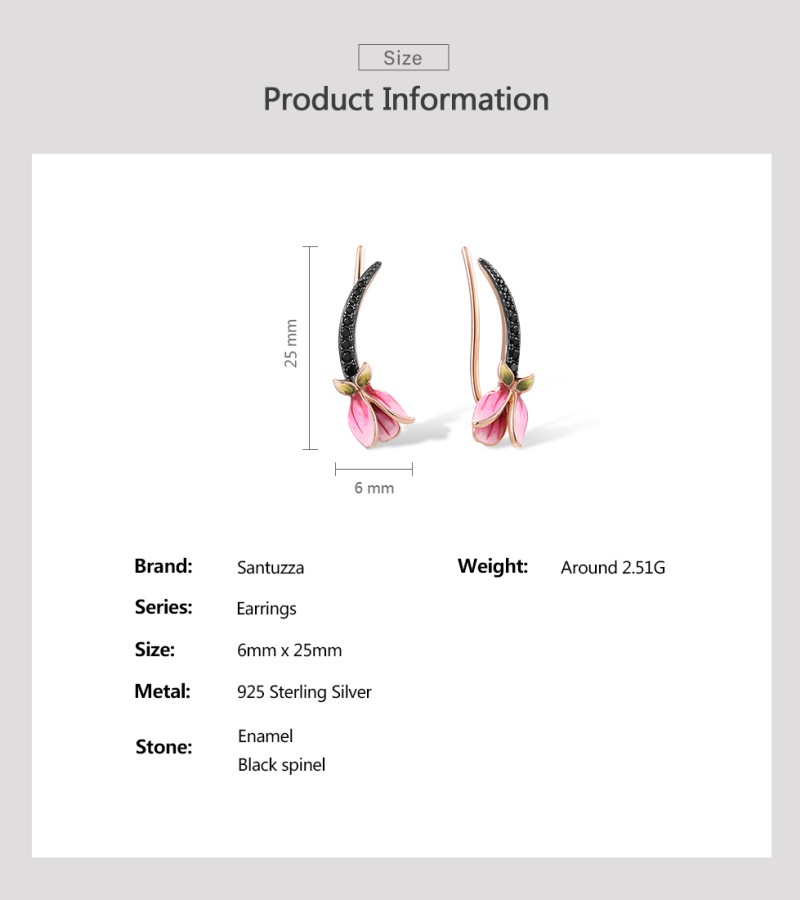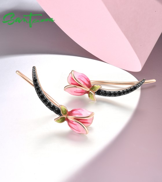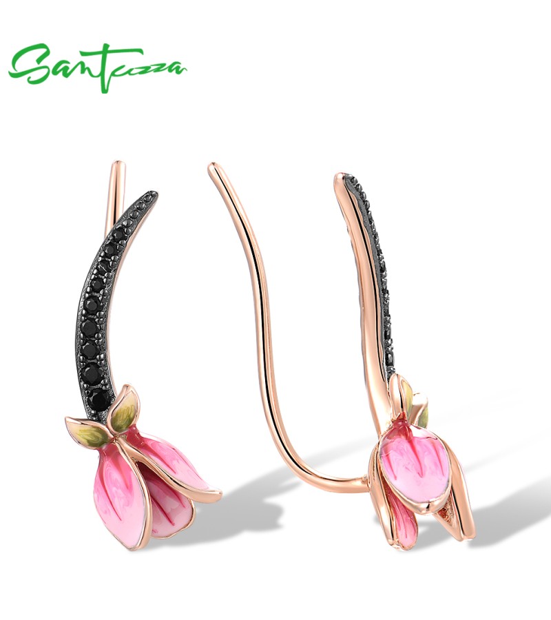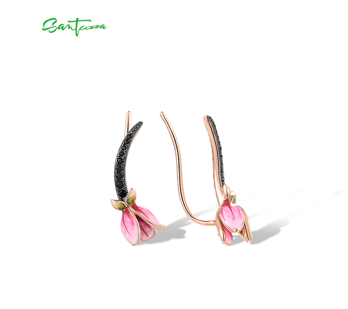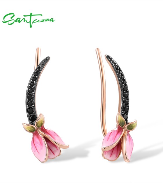 SANTUZZA 925 Sterling Silver Earrings Climber Black Spinel Tulip Flower Pierce Jewelry Enamel