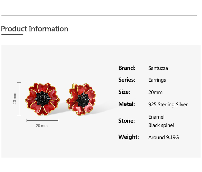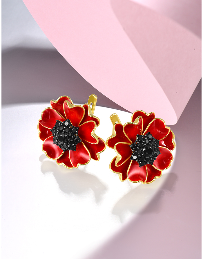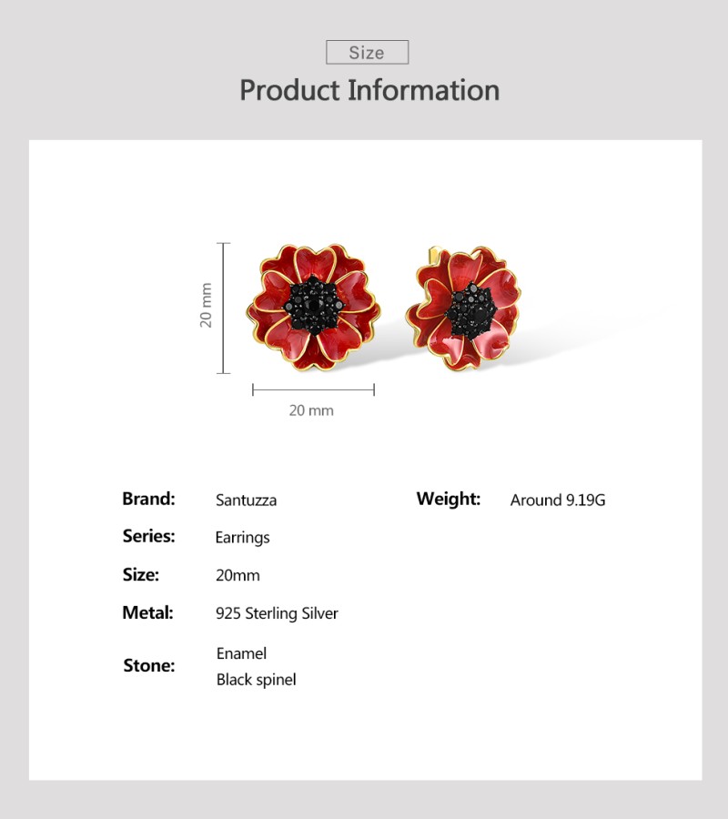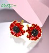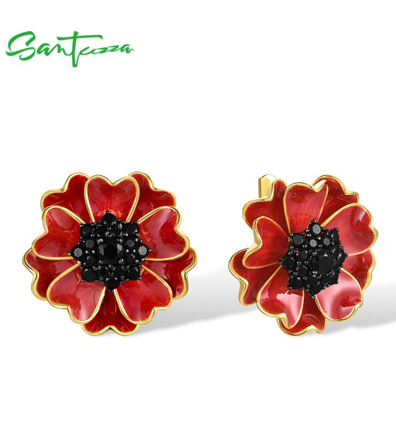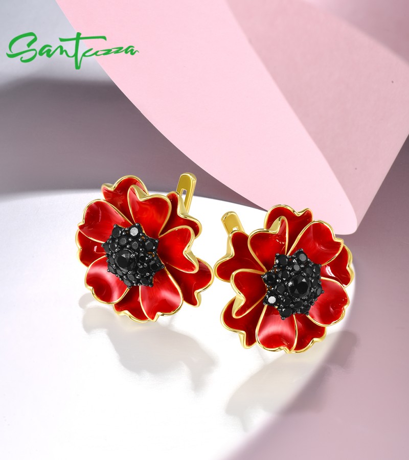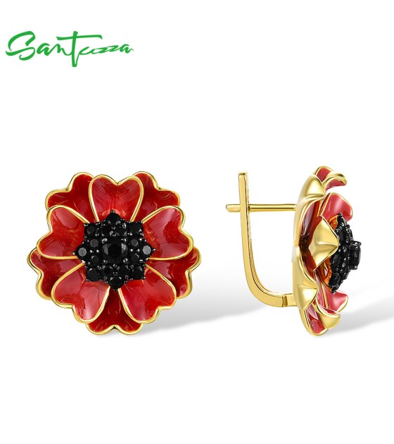 SANTUZZA 925 Sterling Silver Earrings Black Spinel Red Enamel Blossom Flower Jewelry
