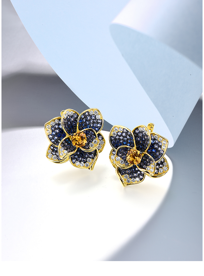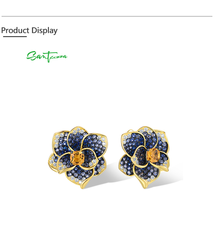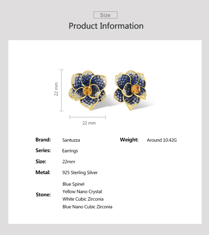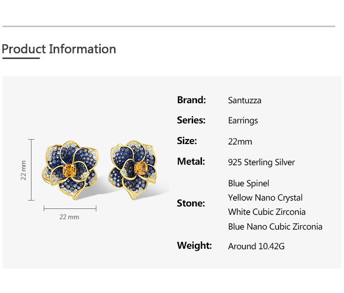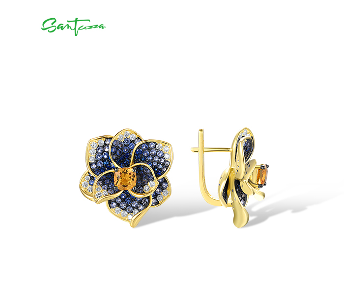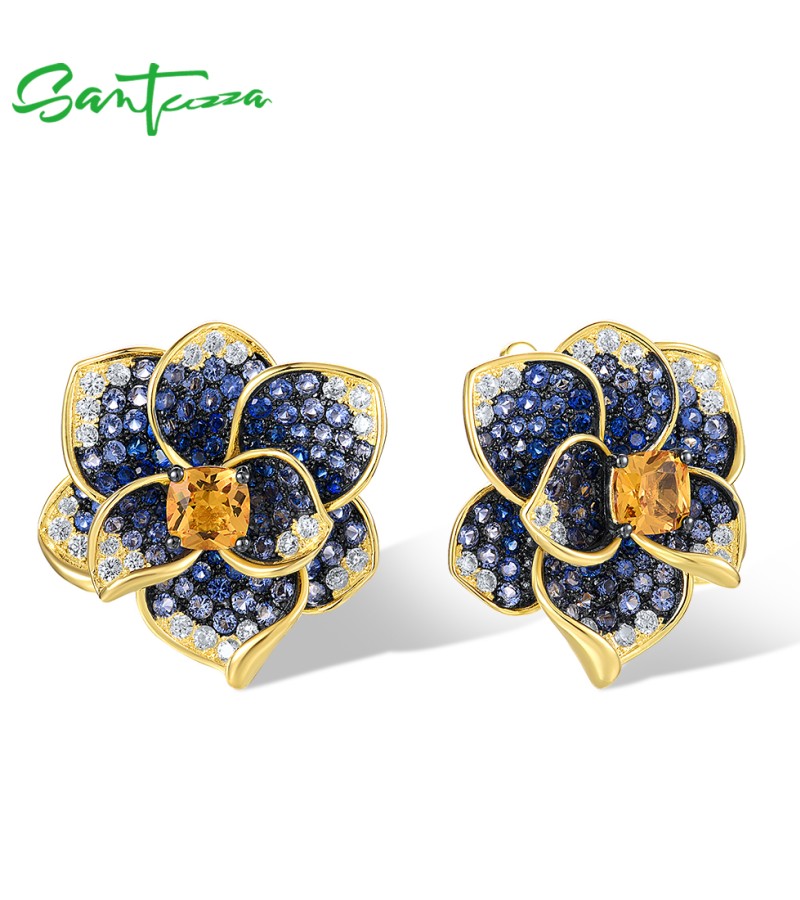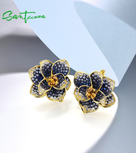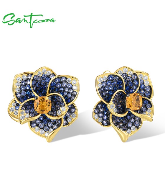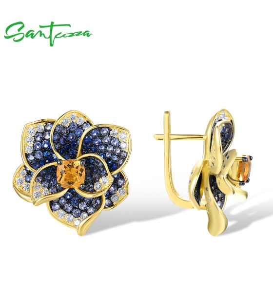 SANTUZZA 925 Sterling Silver Earrings Blue Spinel Yellow Crystal Blooming Flower Fine Jewelry