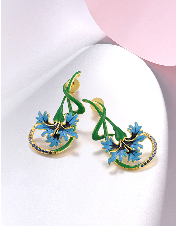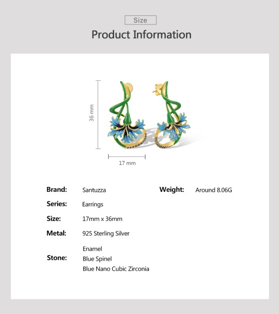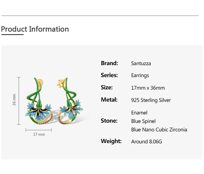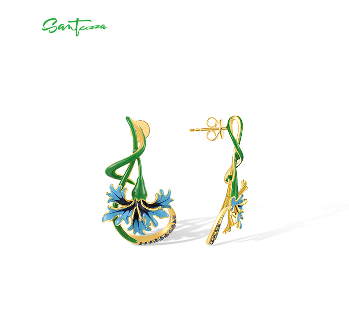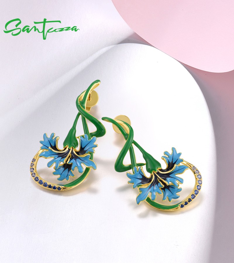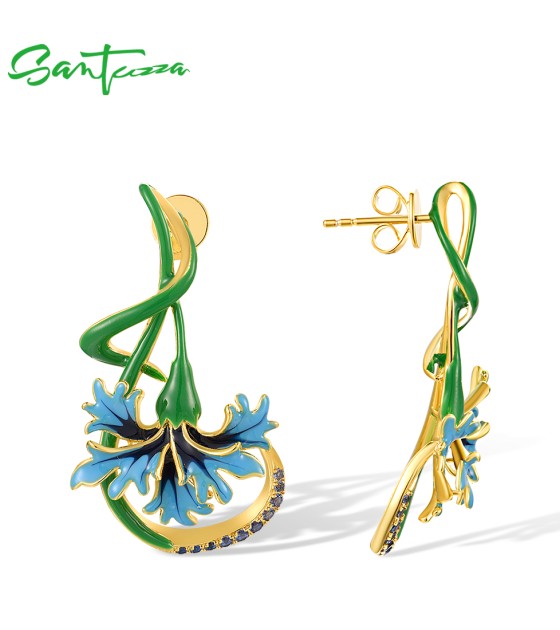 SANTUZZA 925 Sterling Silver Dangling Earrings Blue Stone Green Flower Enamel Jewelry