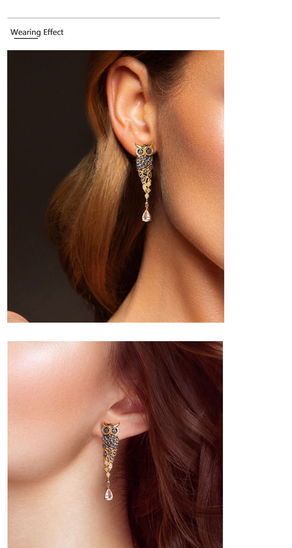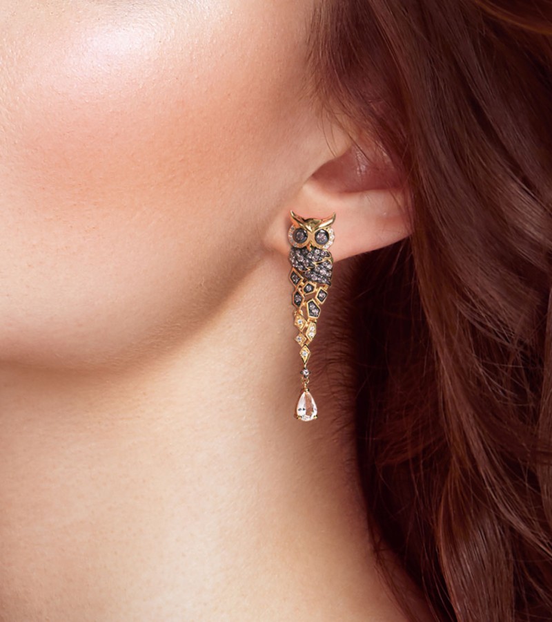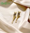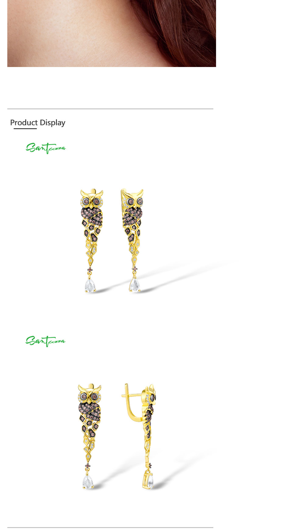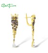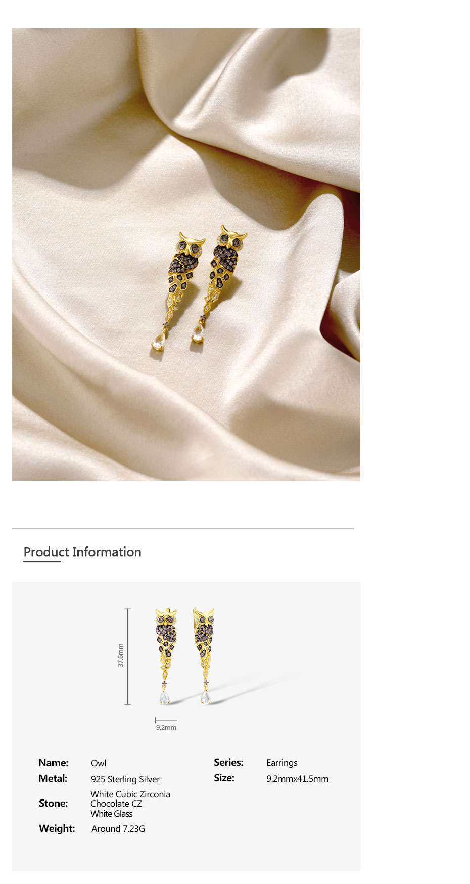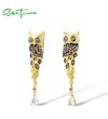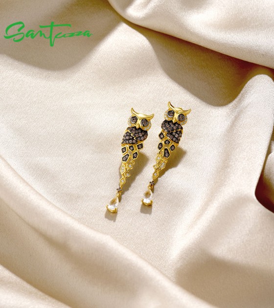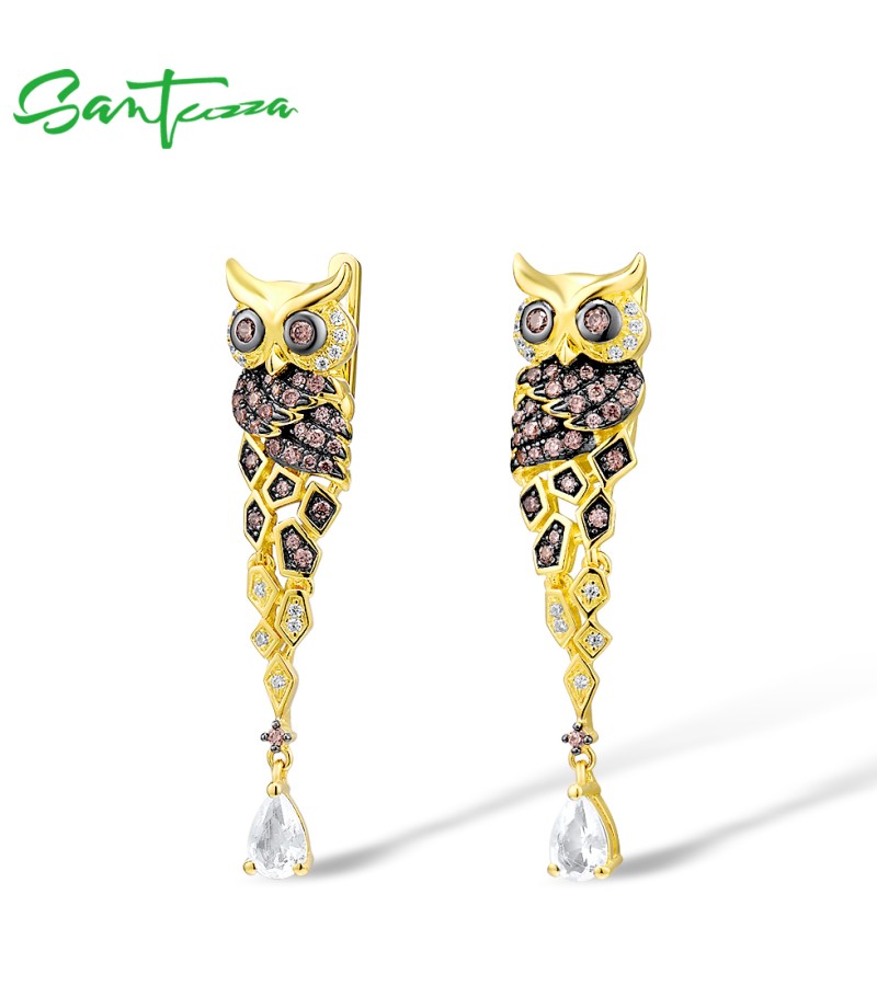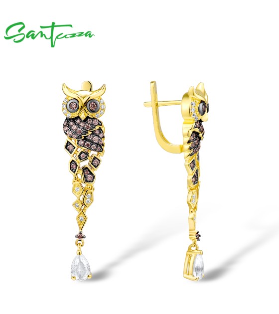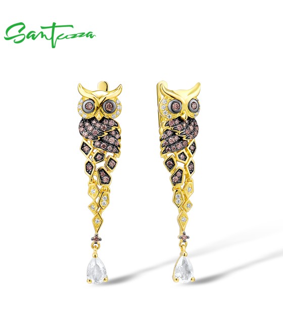 SANTUZZA 925 Sterling Silver Earrings Gold Color Chocolate CZ Owl Drop Earrings Fine Jewelry