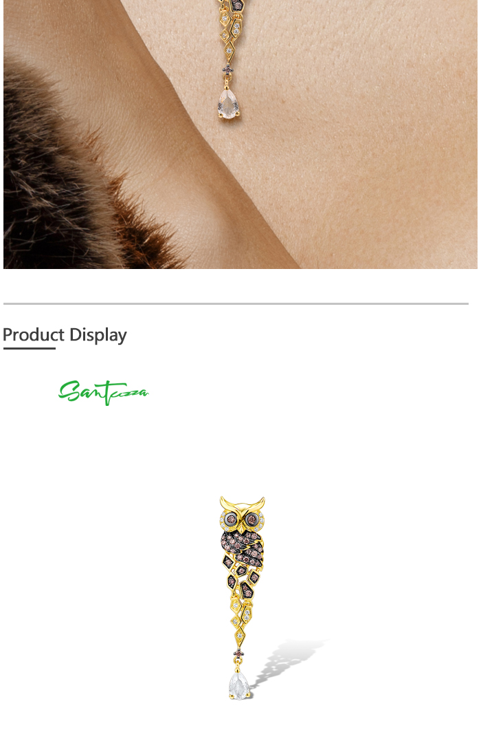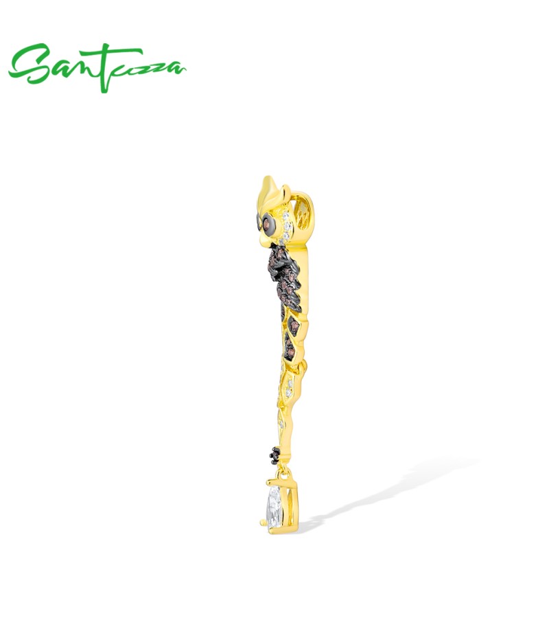 SANTUZZA 925 Sterling Silver Earrings Gold Color Chocolate CZ Owl Drop Earrings Fine Jewelry