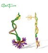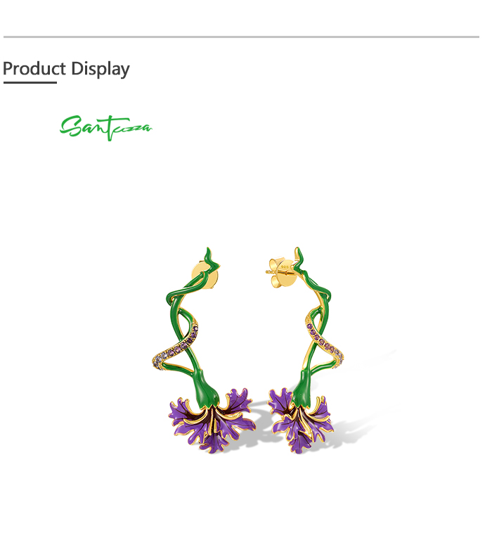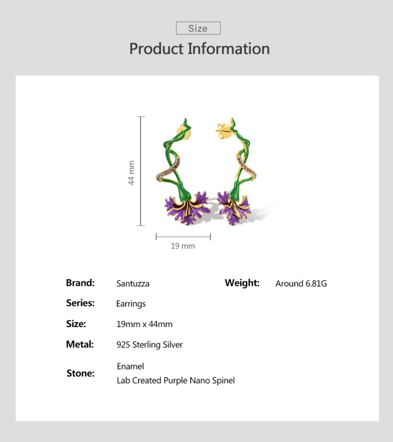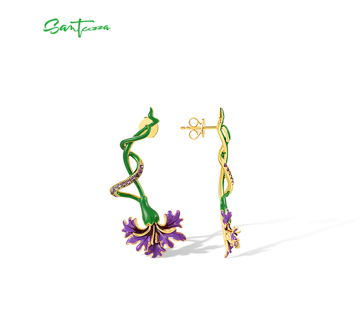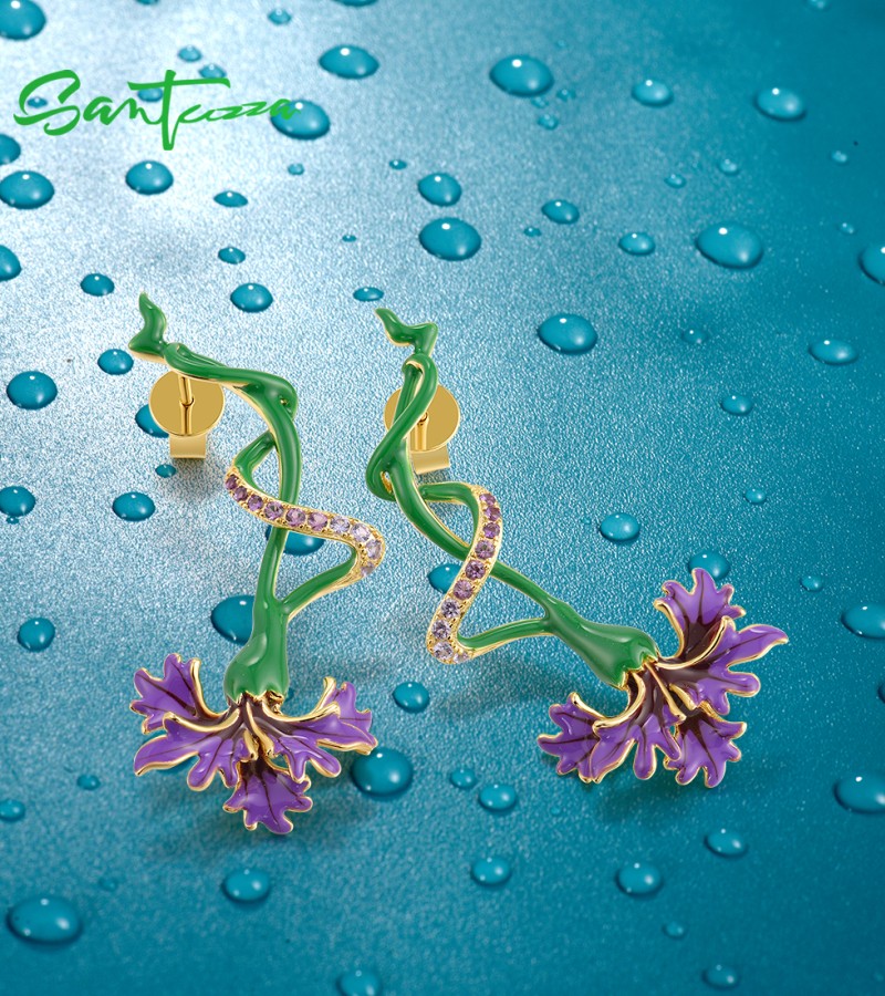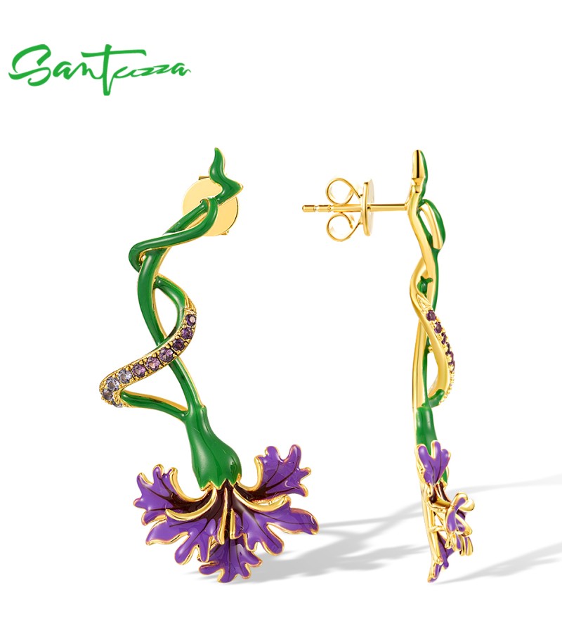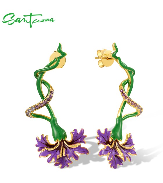 SANTUZZA 925 Sterling Silver Stud Earrings Purple Flower Created Spinel Green Enamel Jewelry