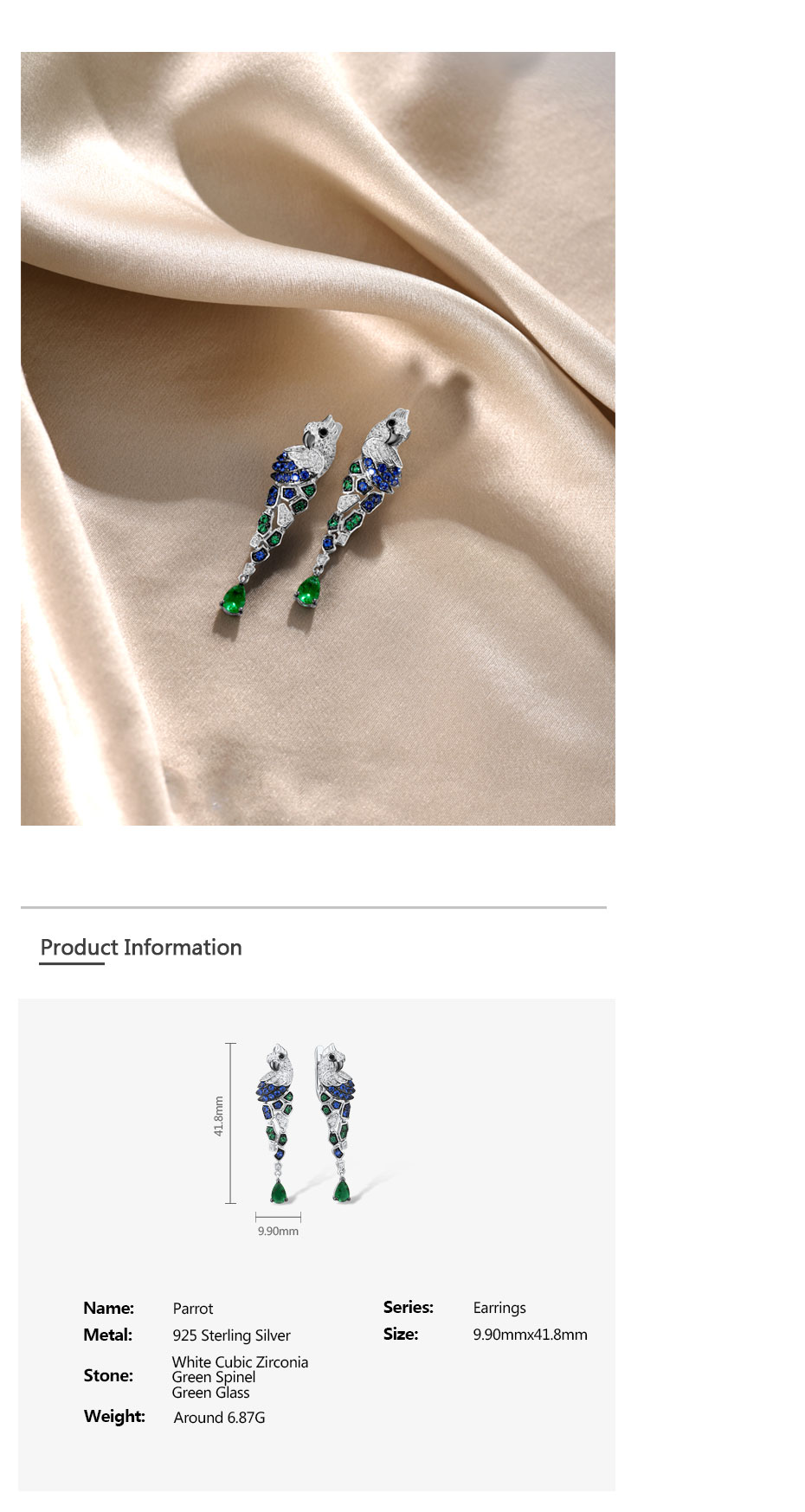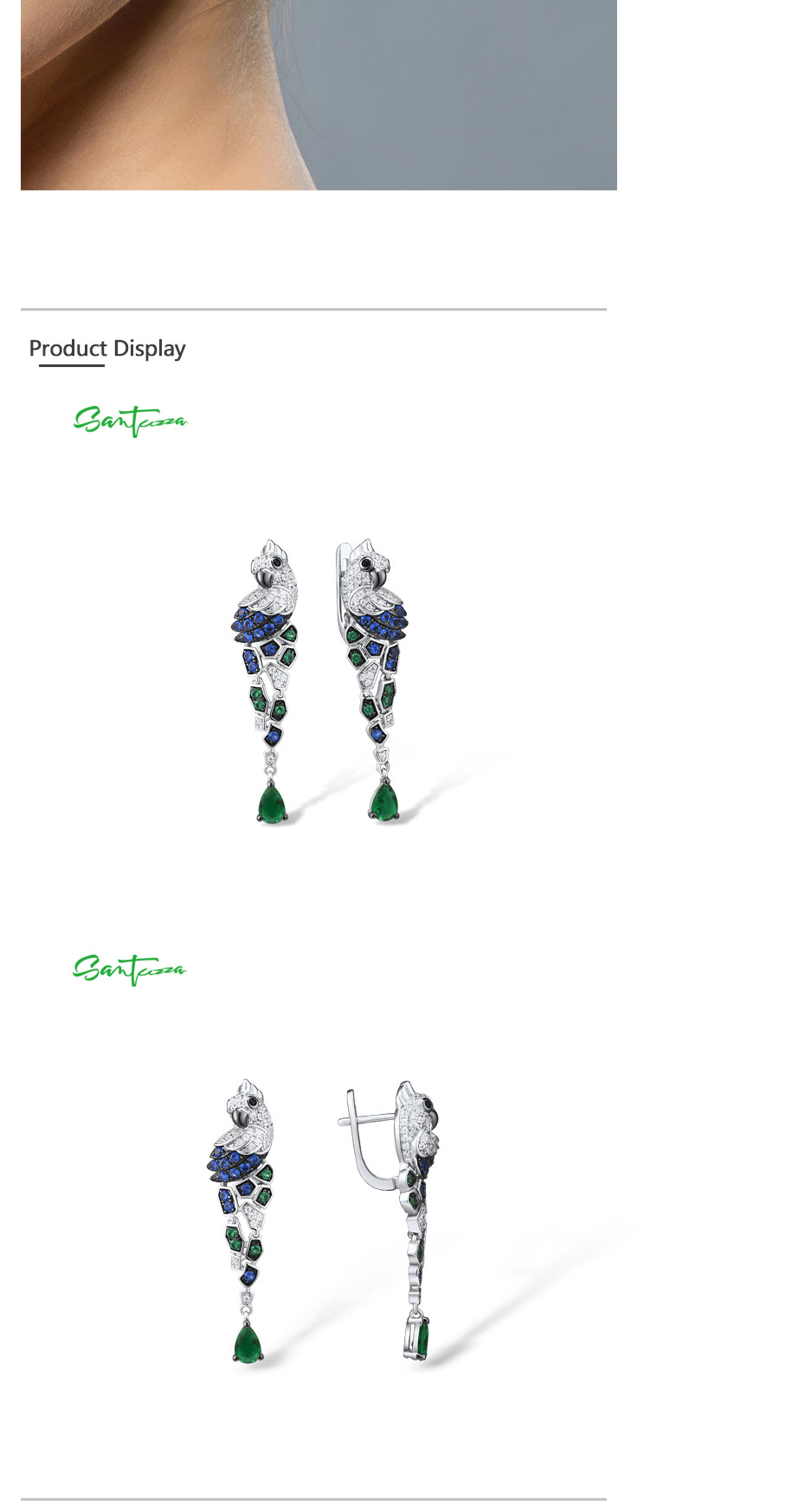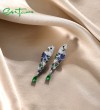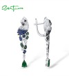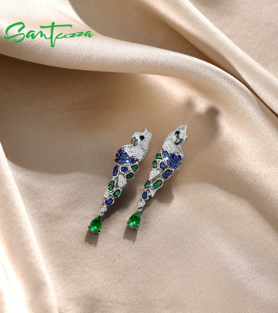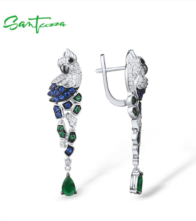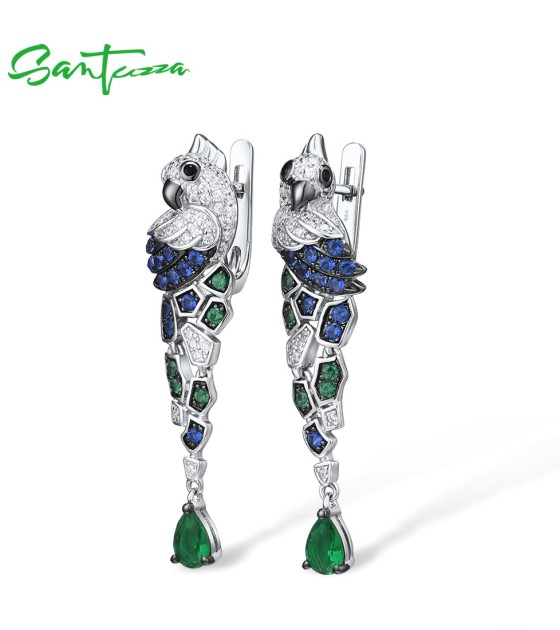 SANTUZZA 925 Sterling Silver Earrings Parrot Birds Blue Green CZ Drop Earrings Fine Jewelry