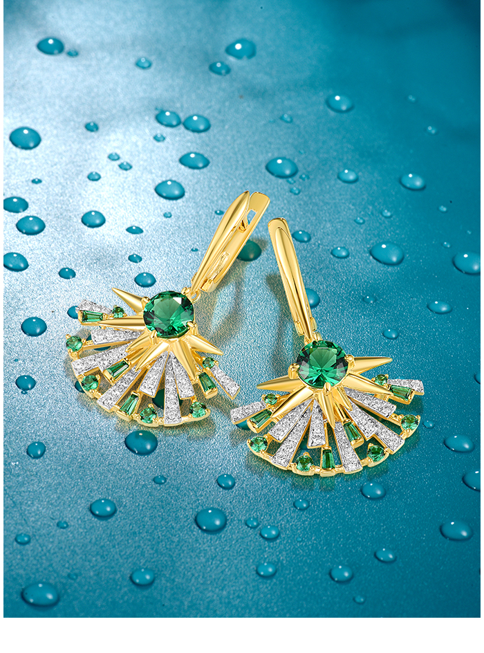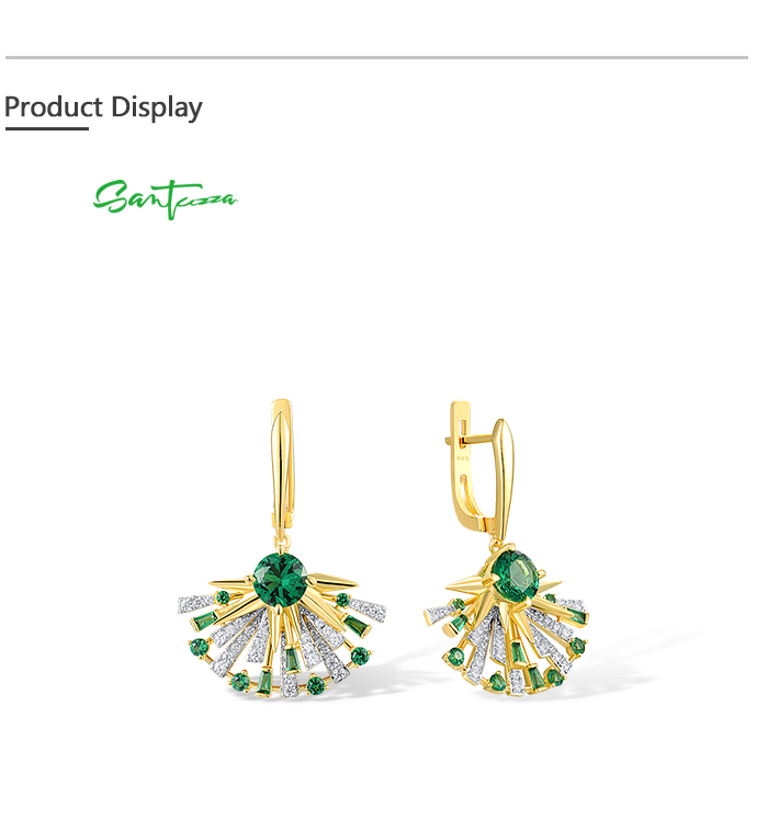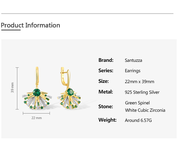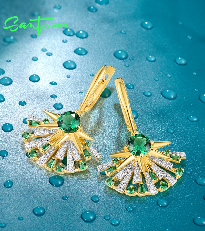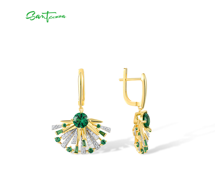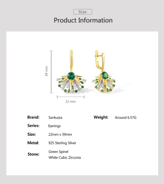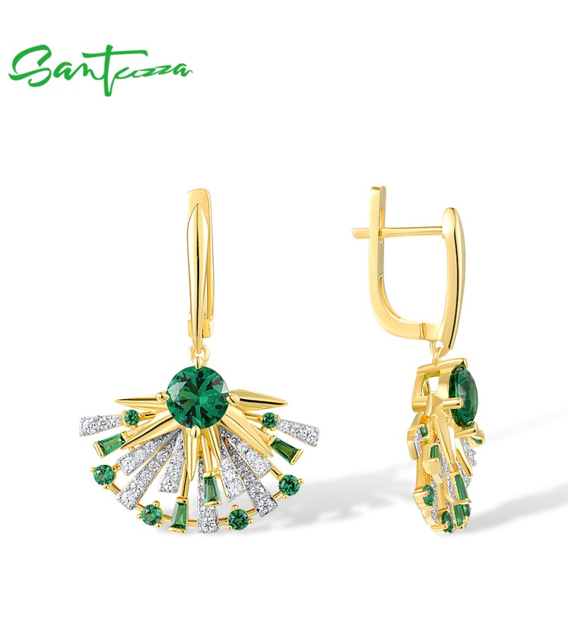 SANTUZZA Genuine 925 Sterling Silver Earrings Green Spinel White CZ Fan Shaped Jewelry