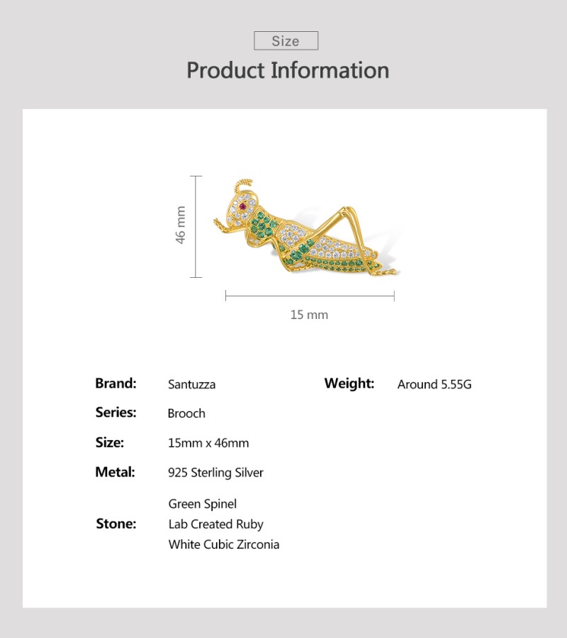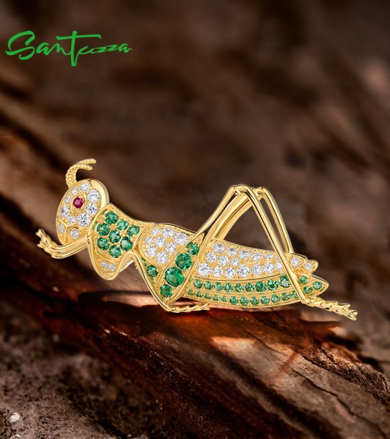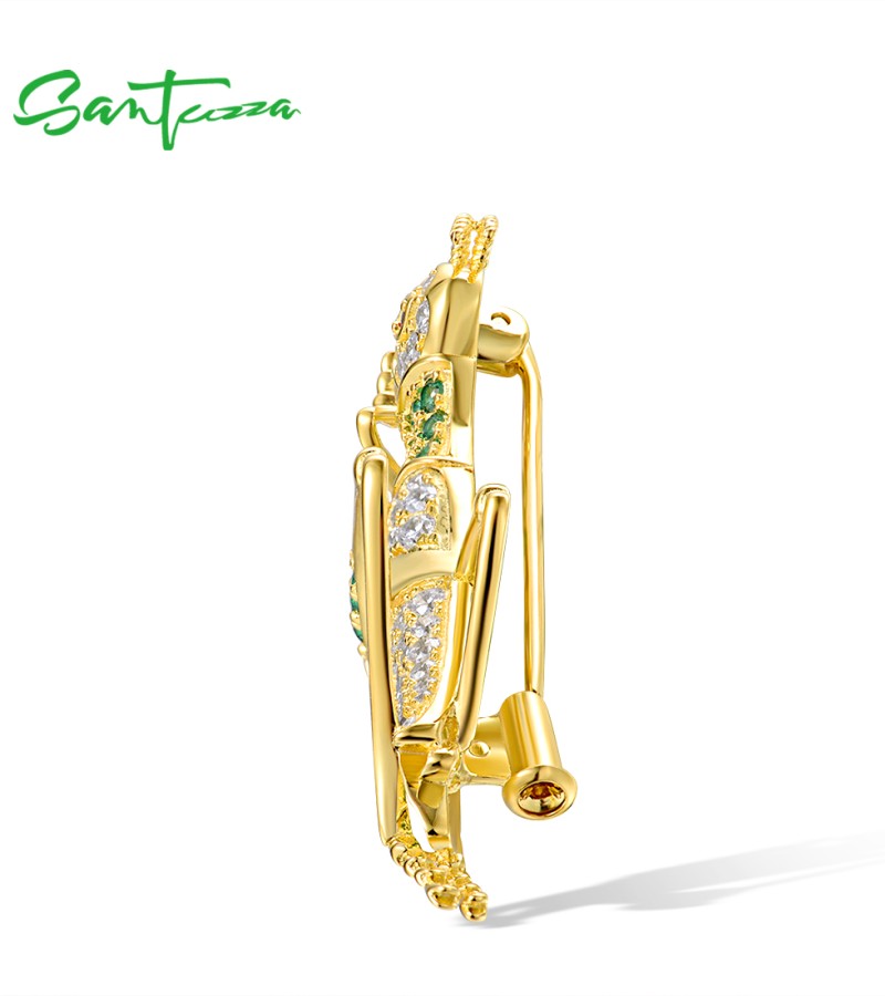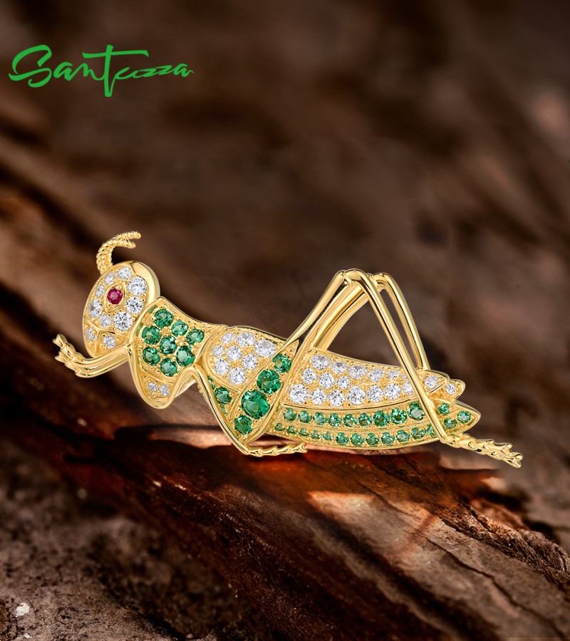 SANTUZZA 925 Sterling Silver Brooch White CZ Green Spinel Grasshopper Locust Fine Jewelry