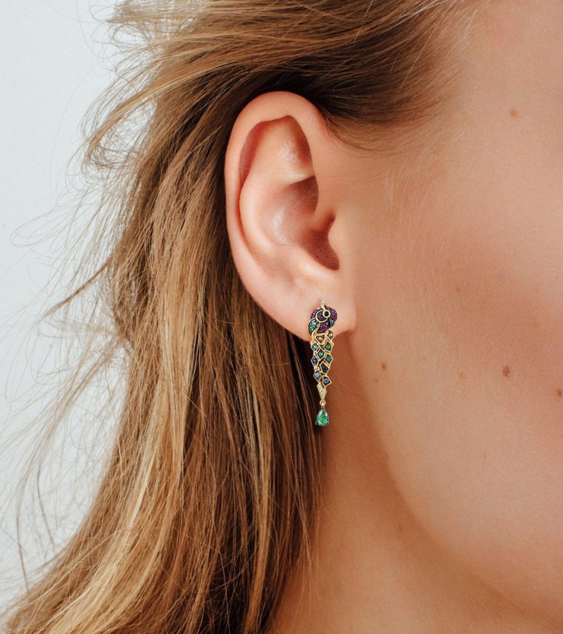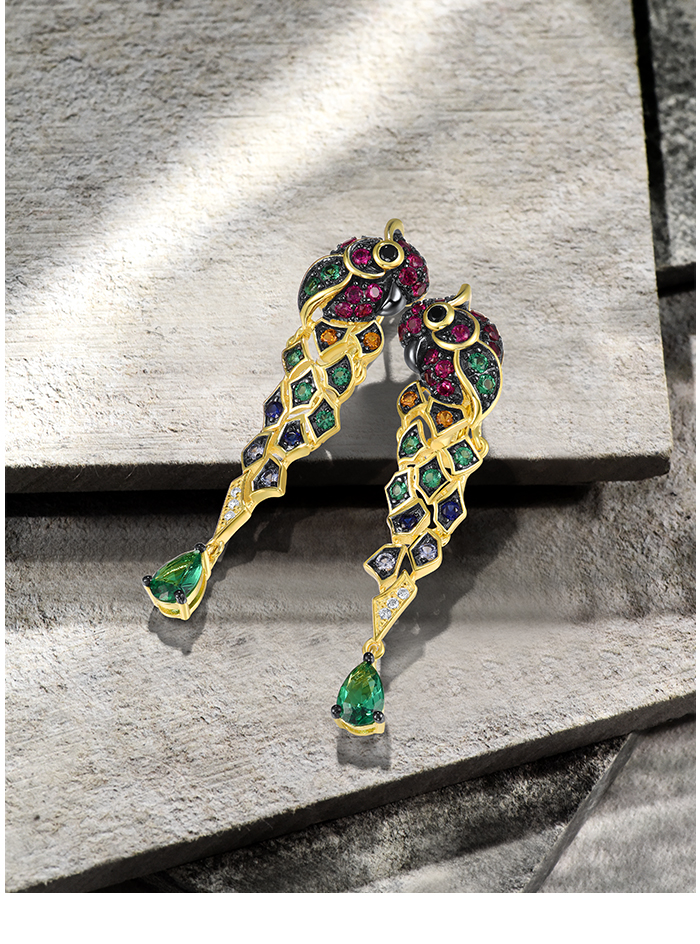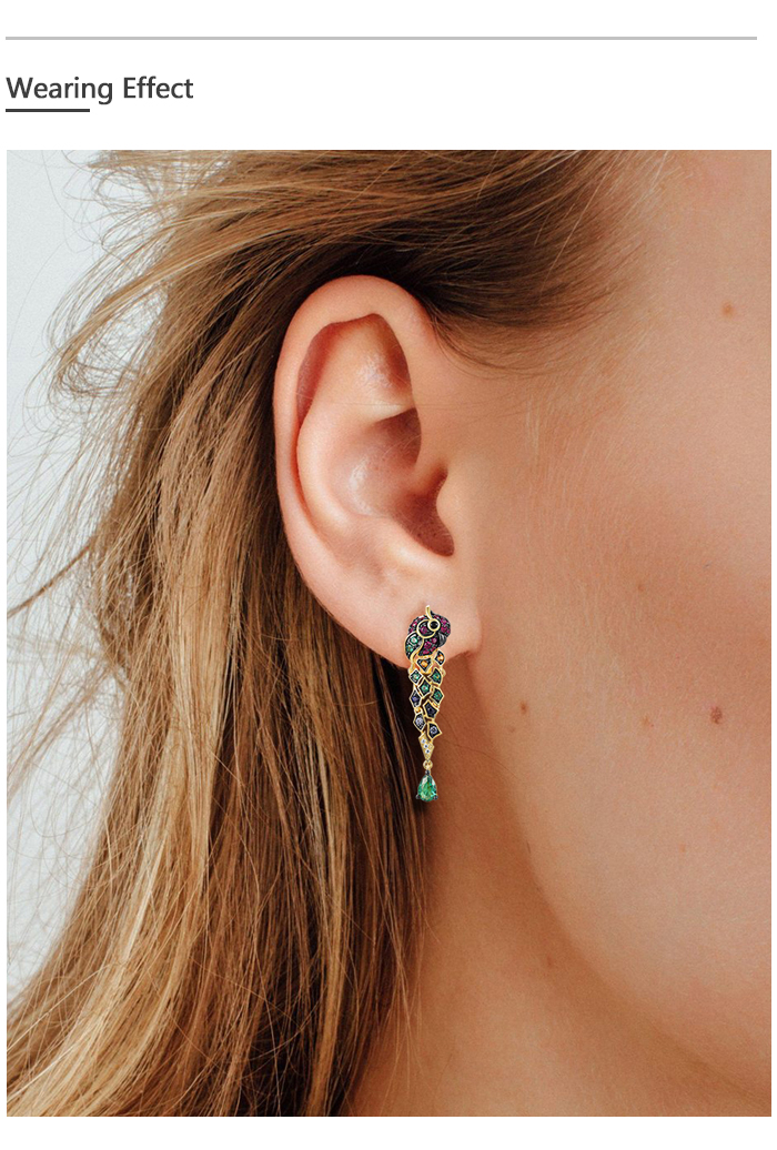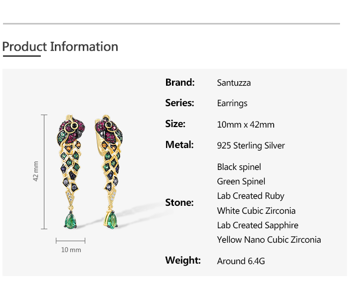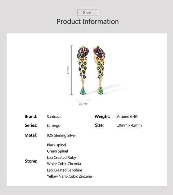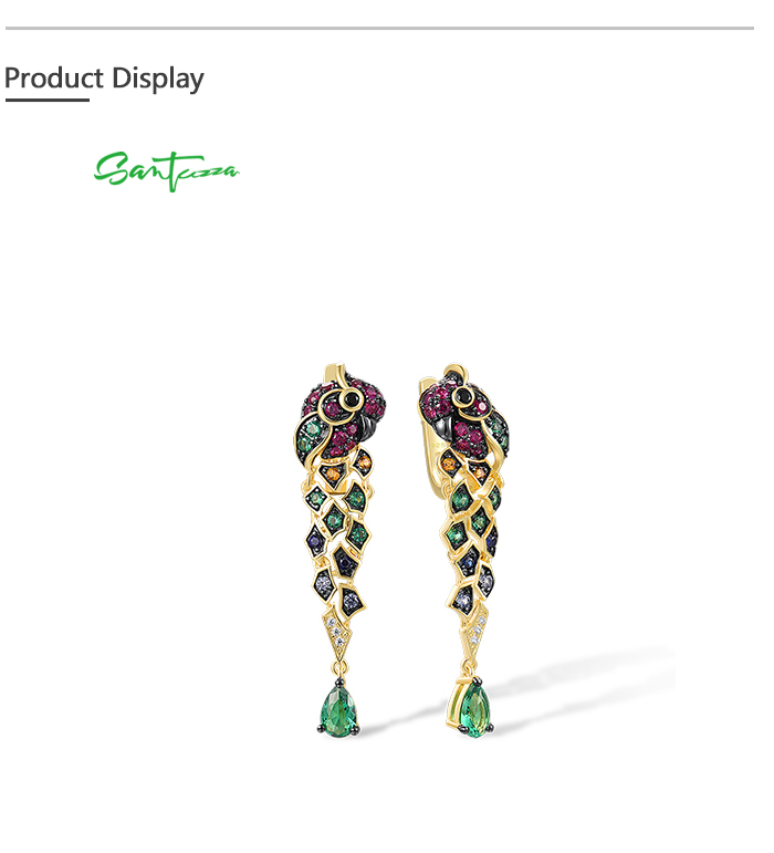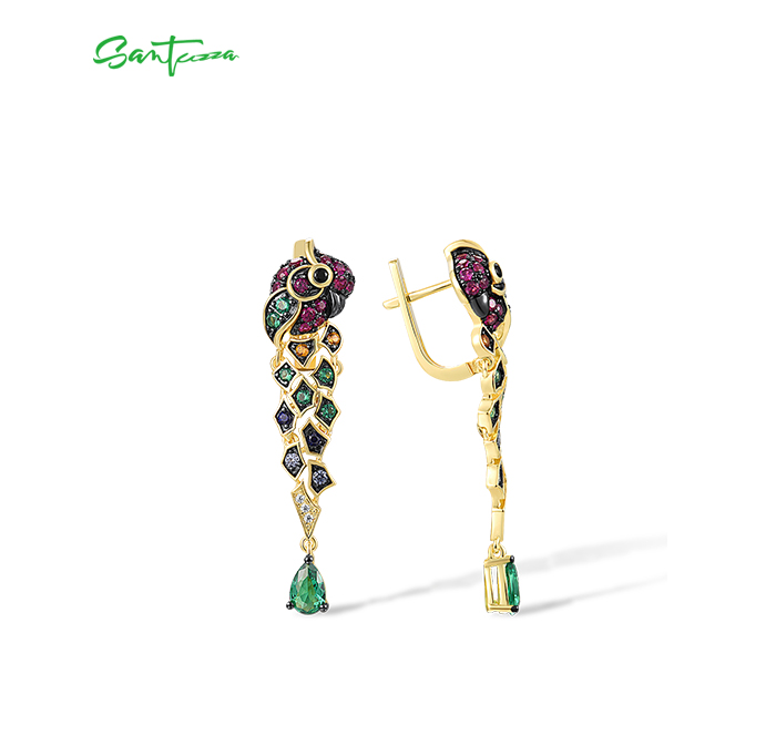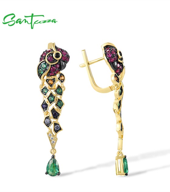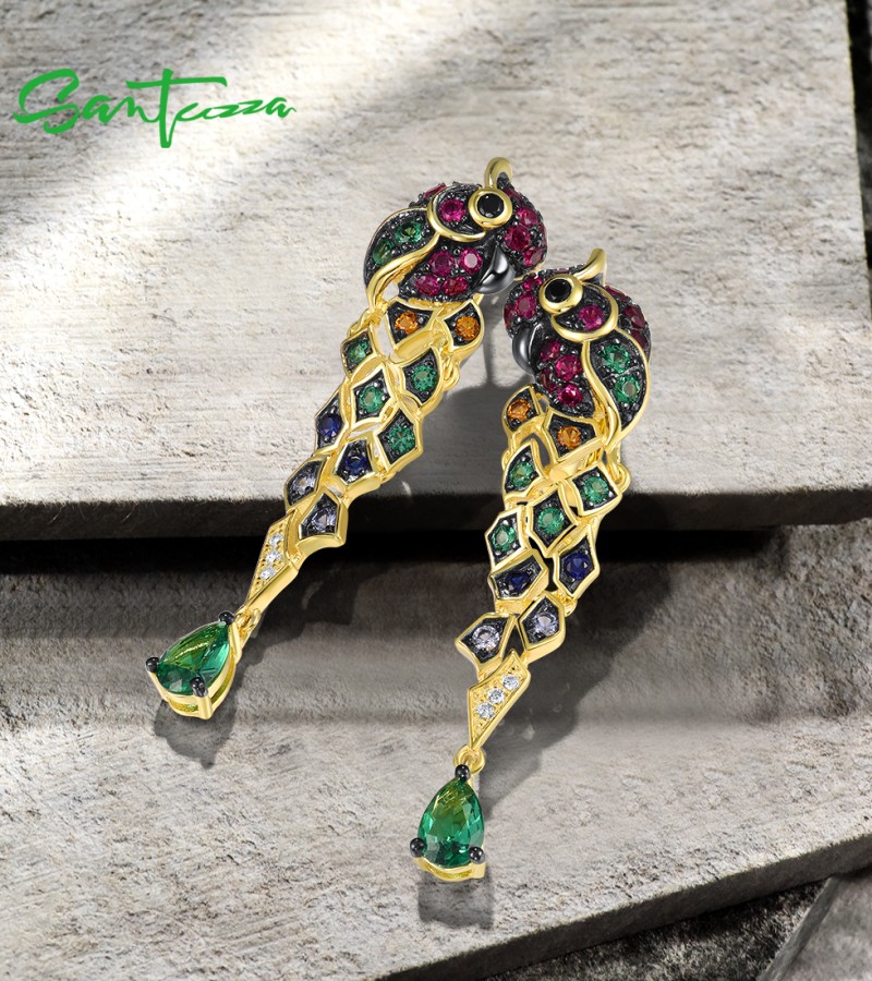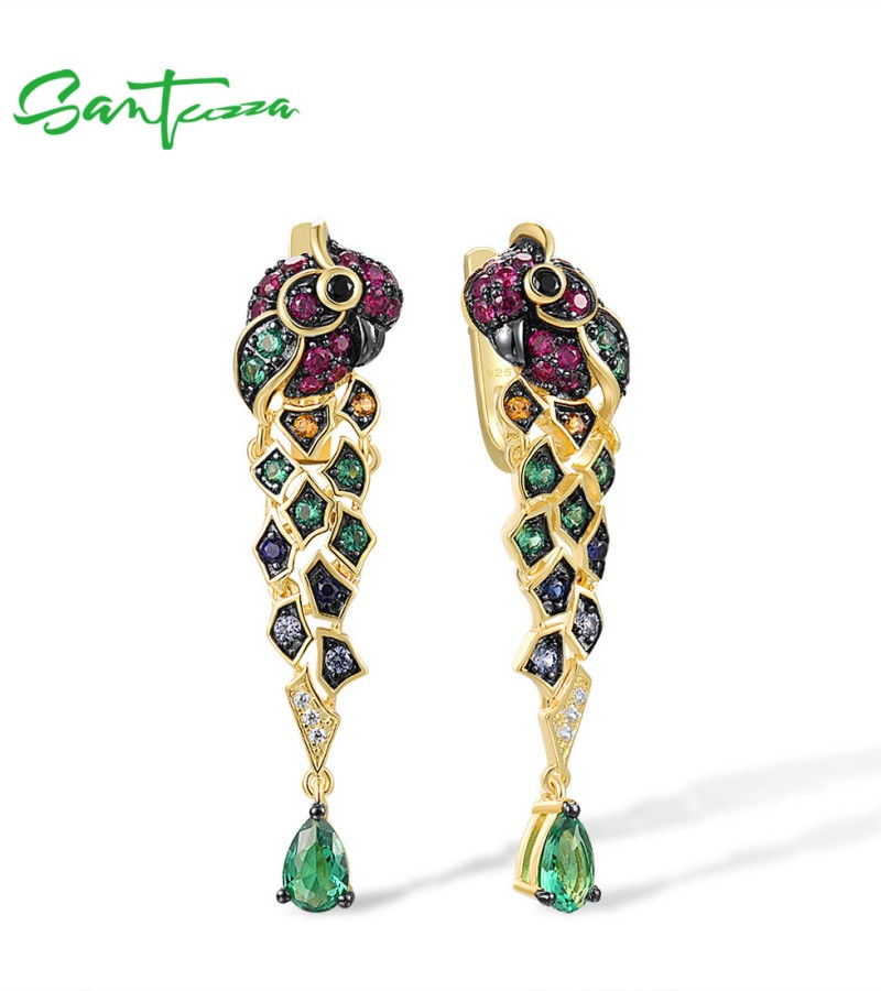 SANTUZZA 925 Sterling Silver Drop Earrings Gold Color Green Spinel Colorful Parrot Bird Animals Fine Jewelry