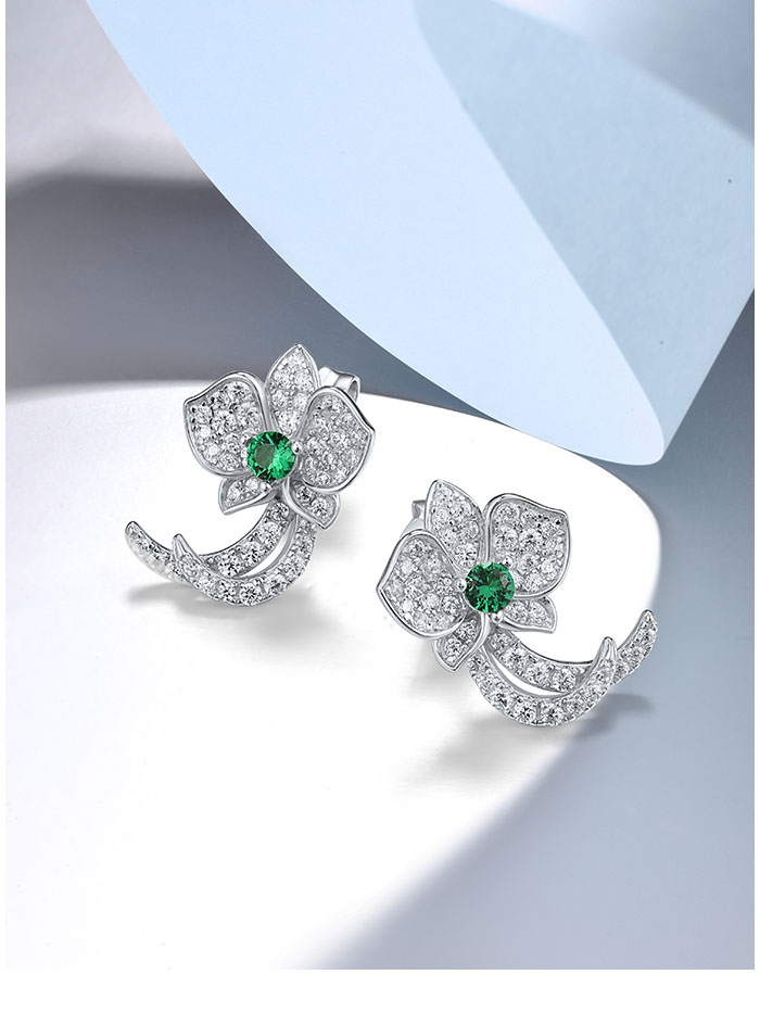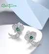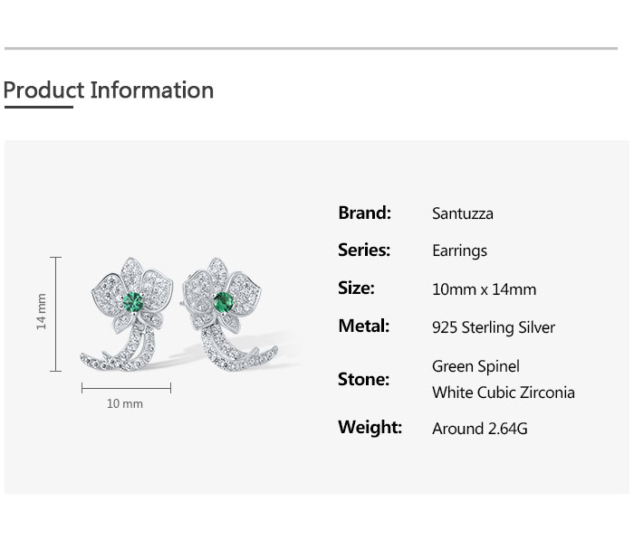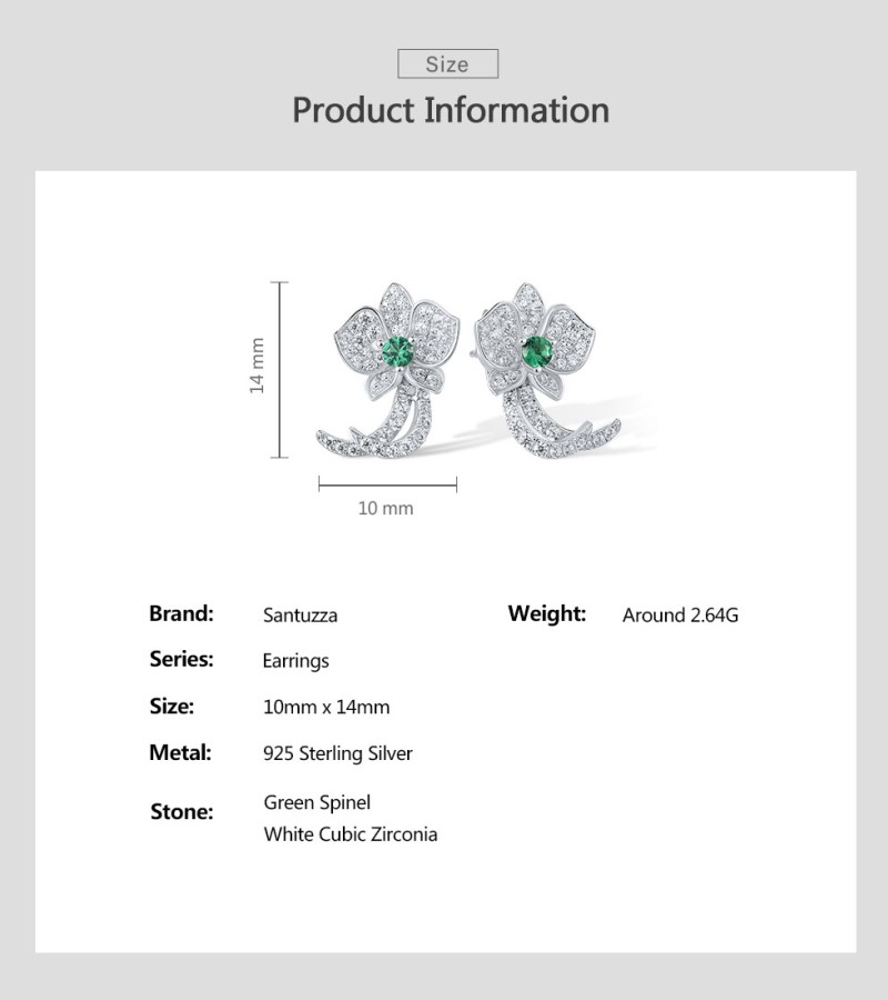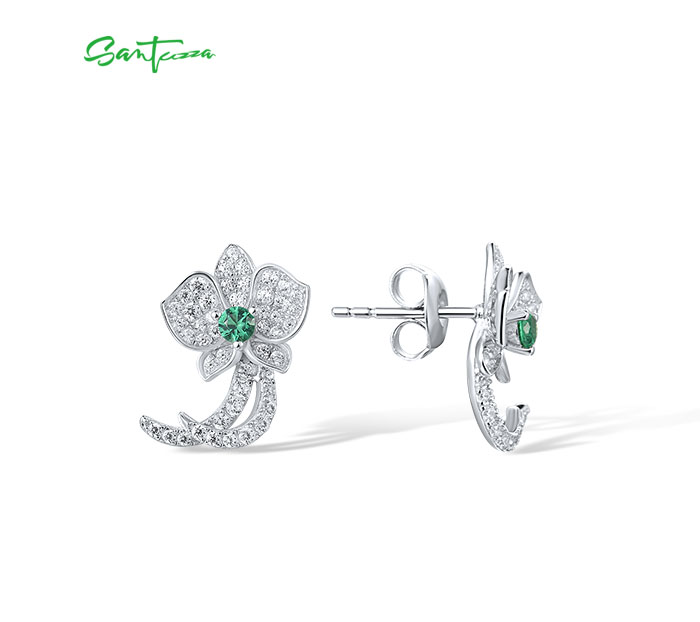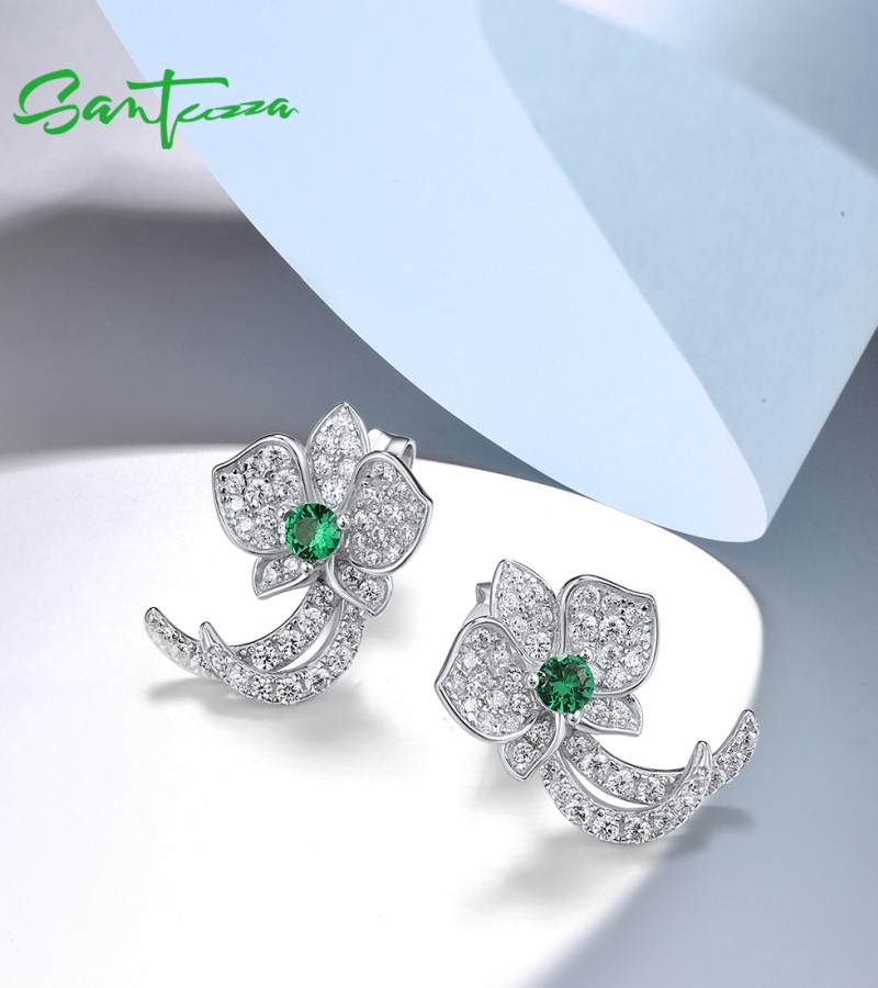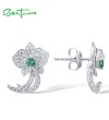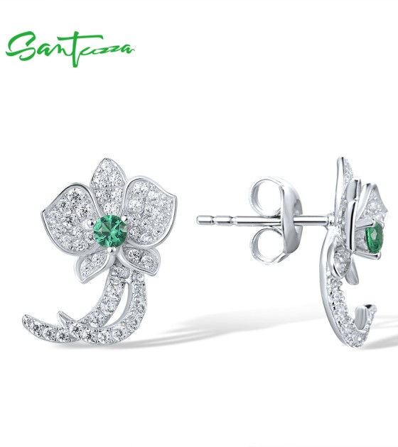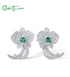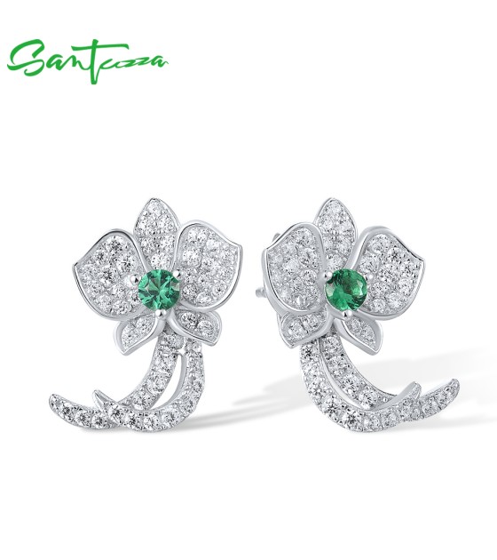 SANTUZZA 925 Sterling Silver Stud Earrings White CZ Green Spinel Orchid Flower Fine Jewelry