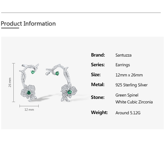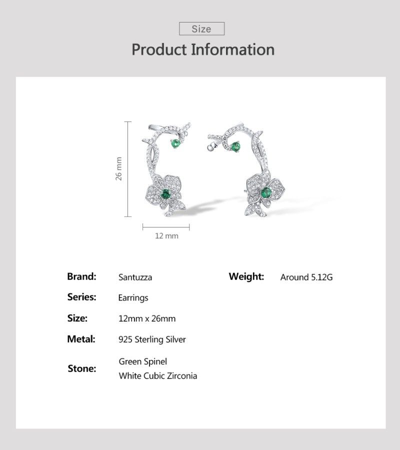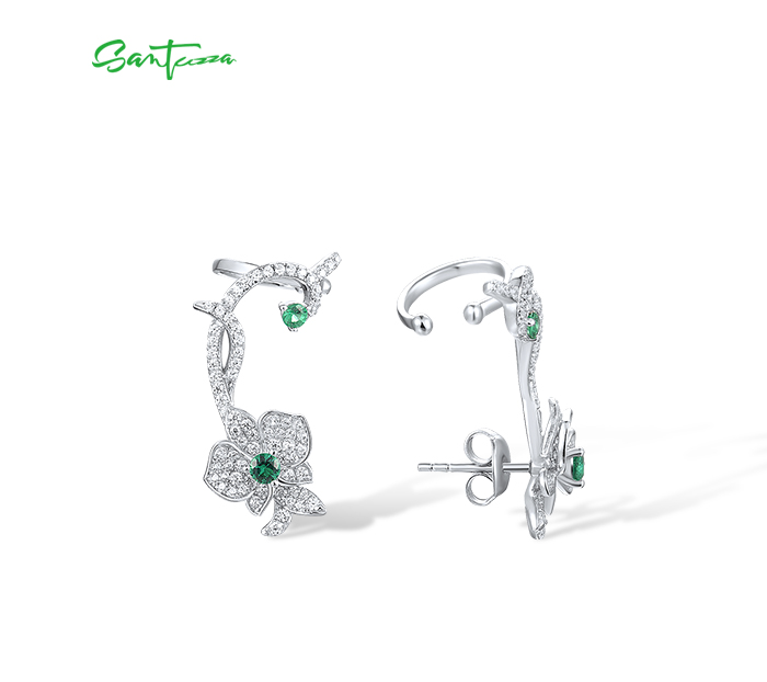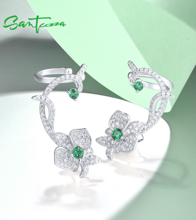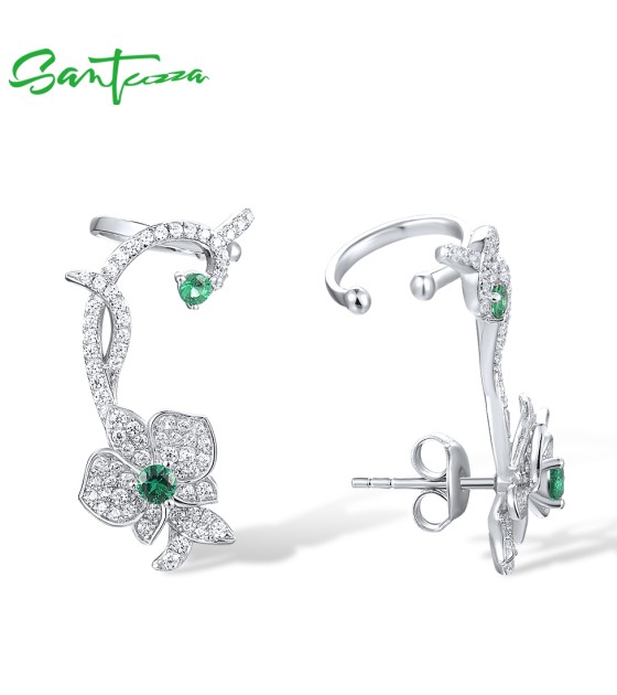 SANTUZZA 925 Sterling Silver Cuff Earrings White CZ Green Spinel Flower Fine Jewelry
