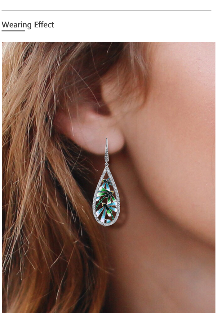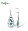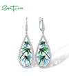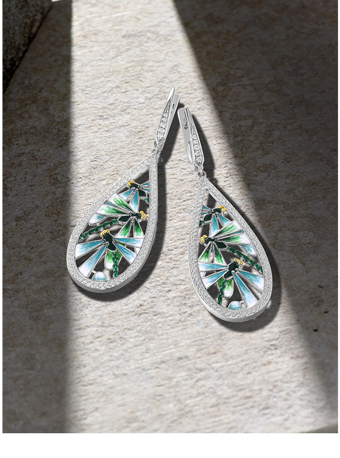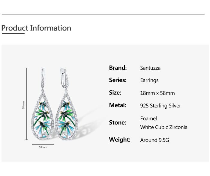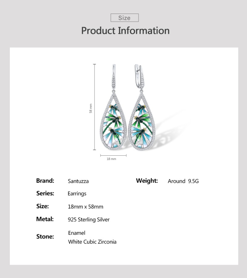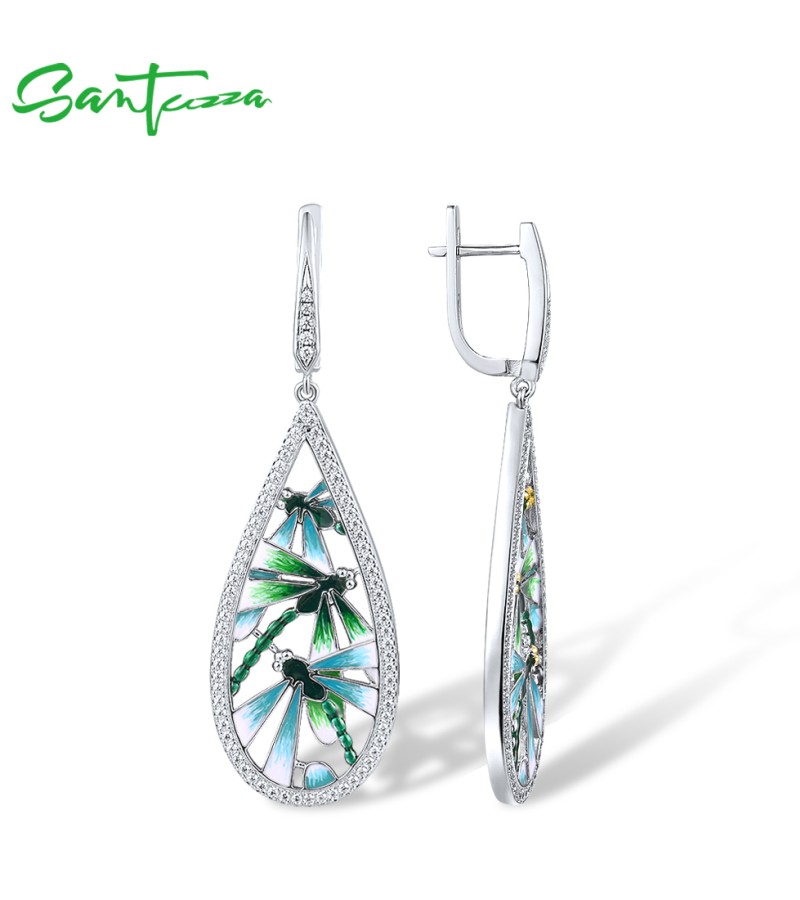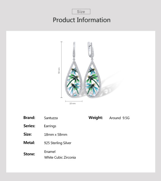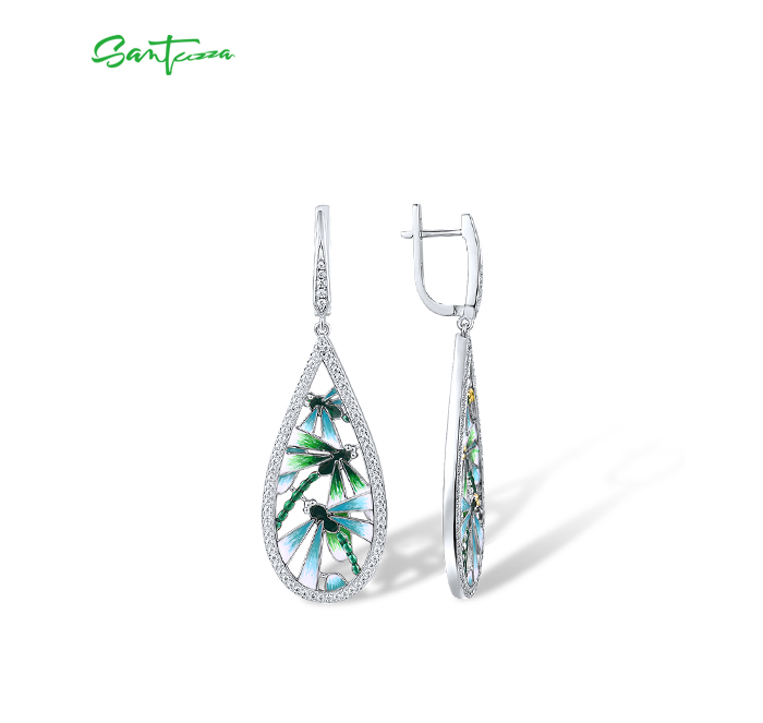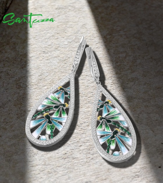 SANTUZZA 925 Sterling Silver Earrings White CZ Green Enamel Dragonfly Jewelry