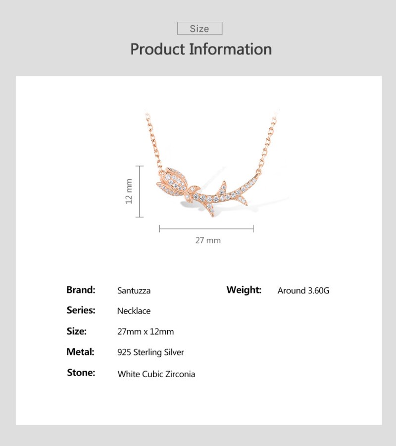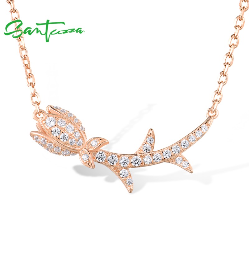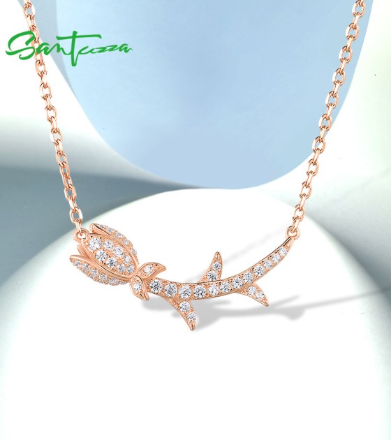 SANTUZZA 925 Sterling Silver Necklace White CZ Pink Tulip Flower Fine Jewelry