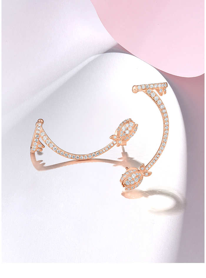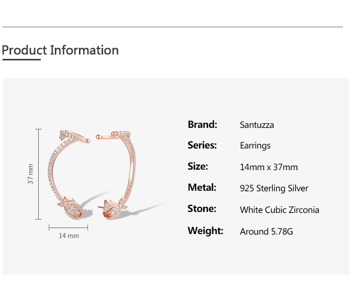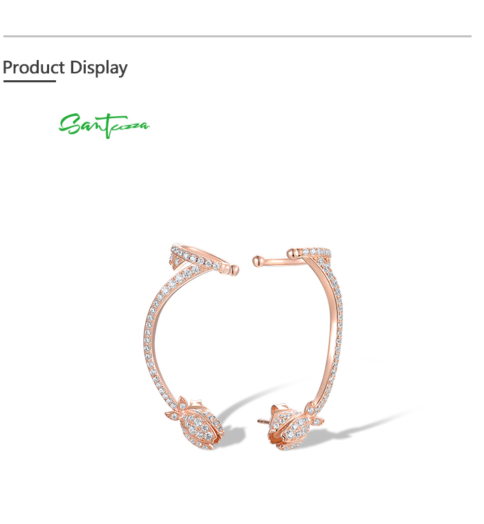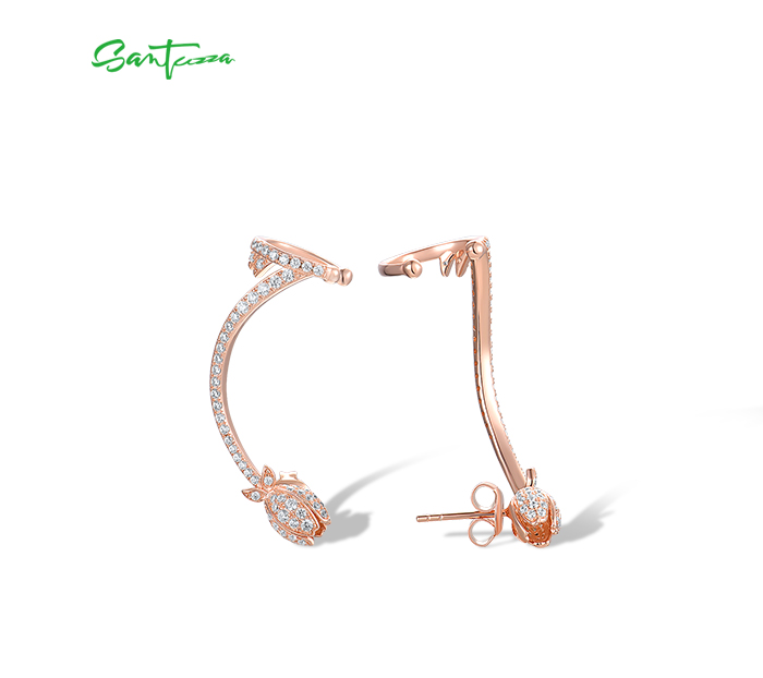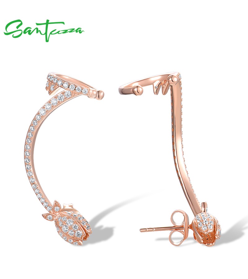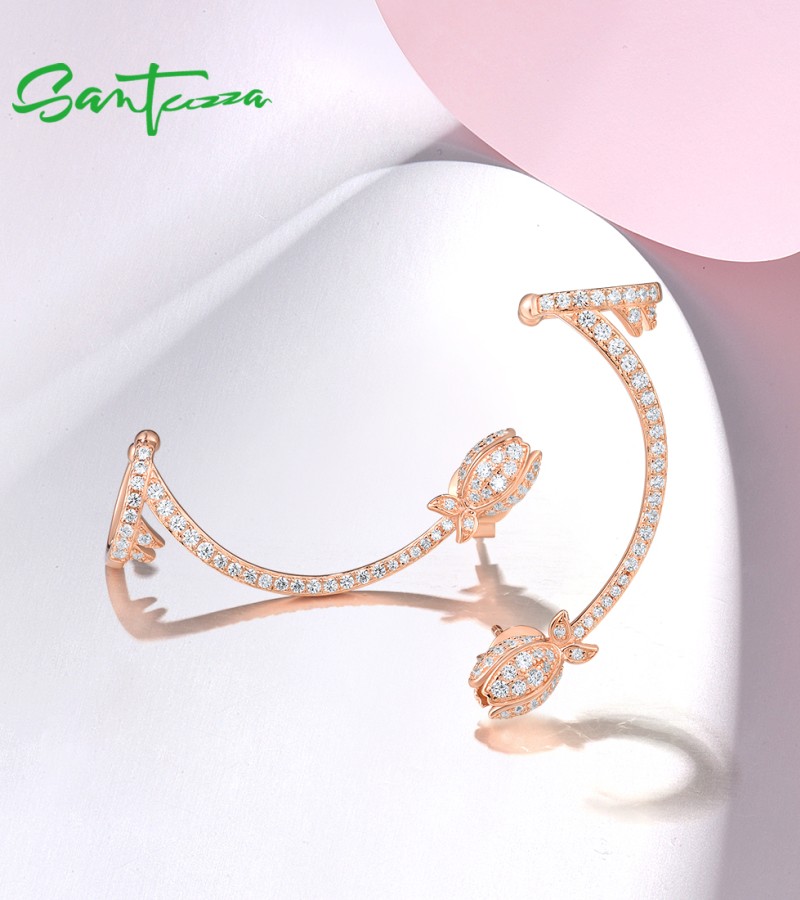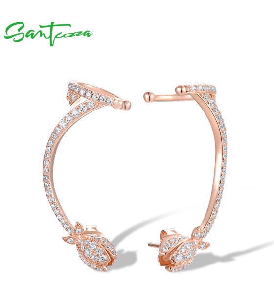 SANTUZZA 925 Sterling Silver Earrings White CZ Pink Tulip Flower Ear Cuff Fine Jewelry