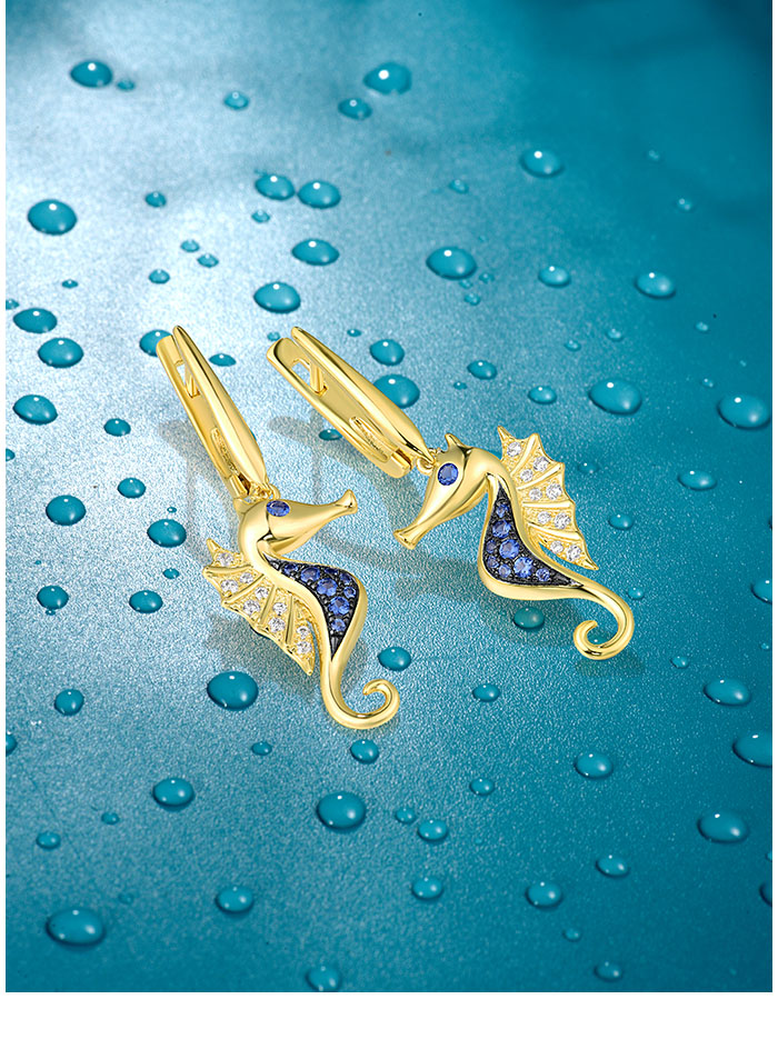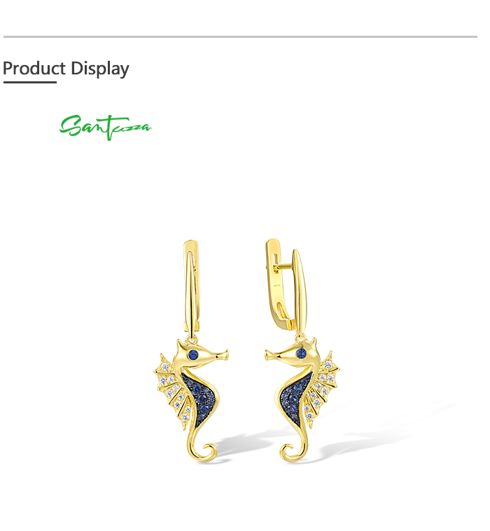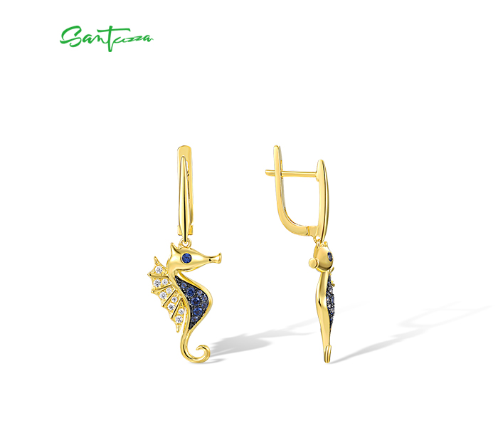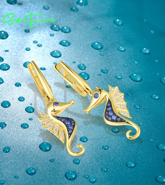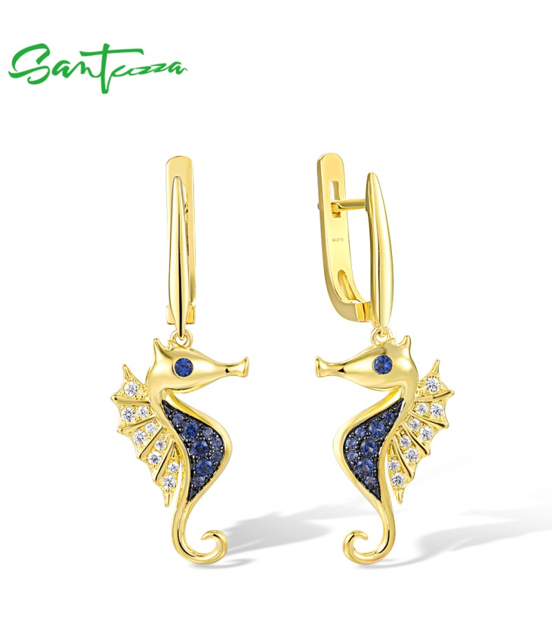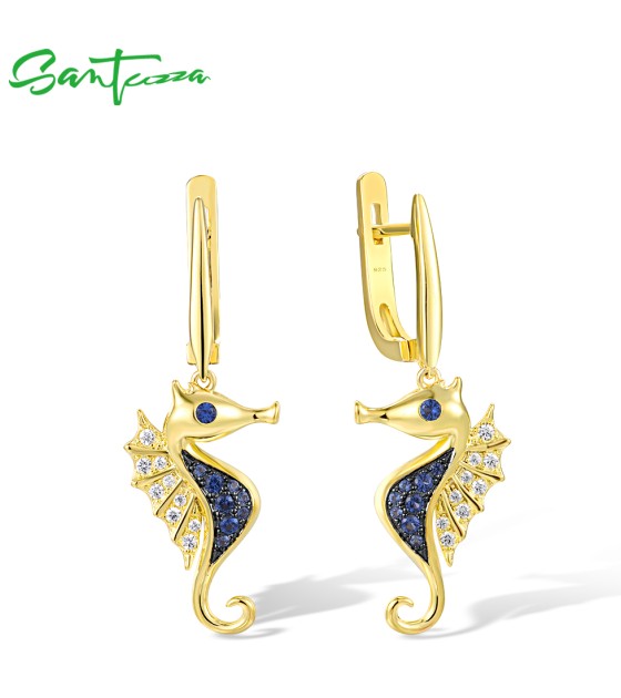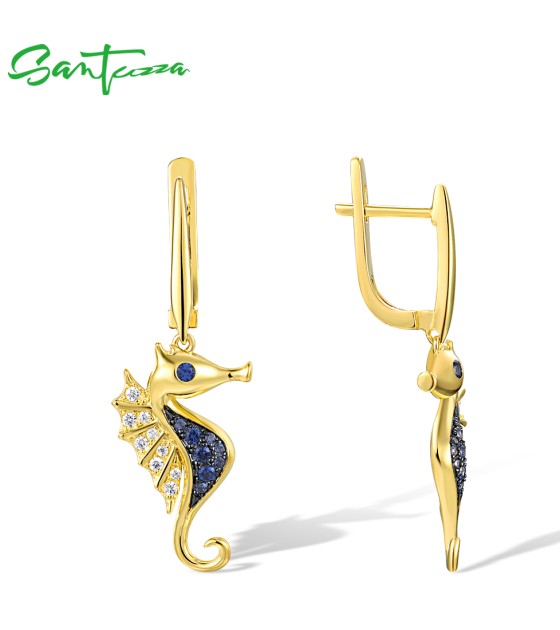SANTUZZA 925 Sterling Silver Dangling Earrings Blue Nano White CZ Sea Horse Ocean Fine Jewelry