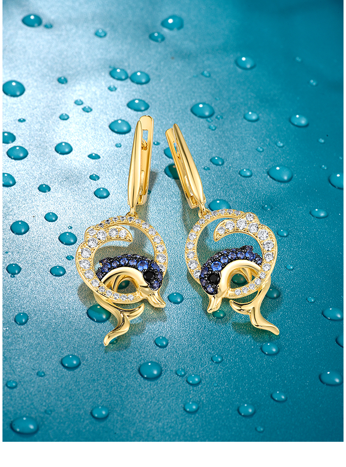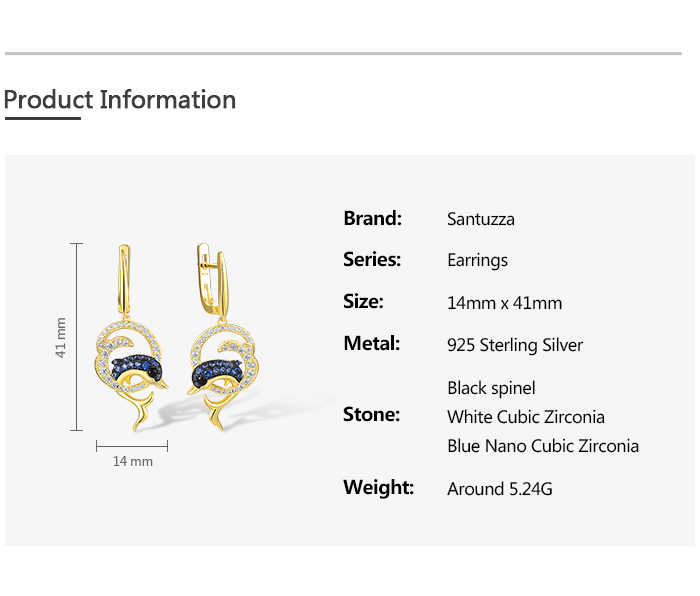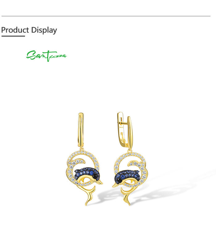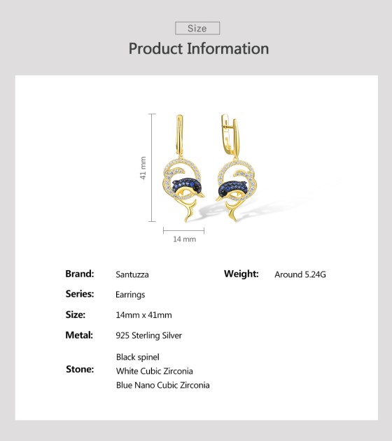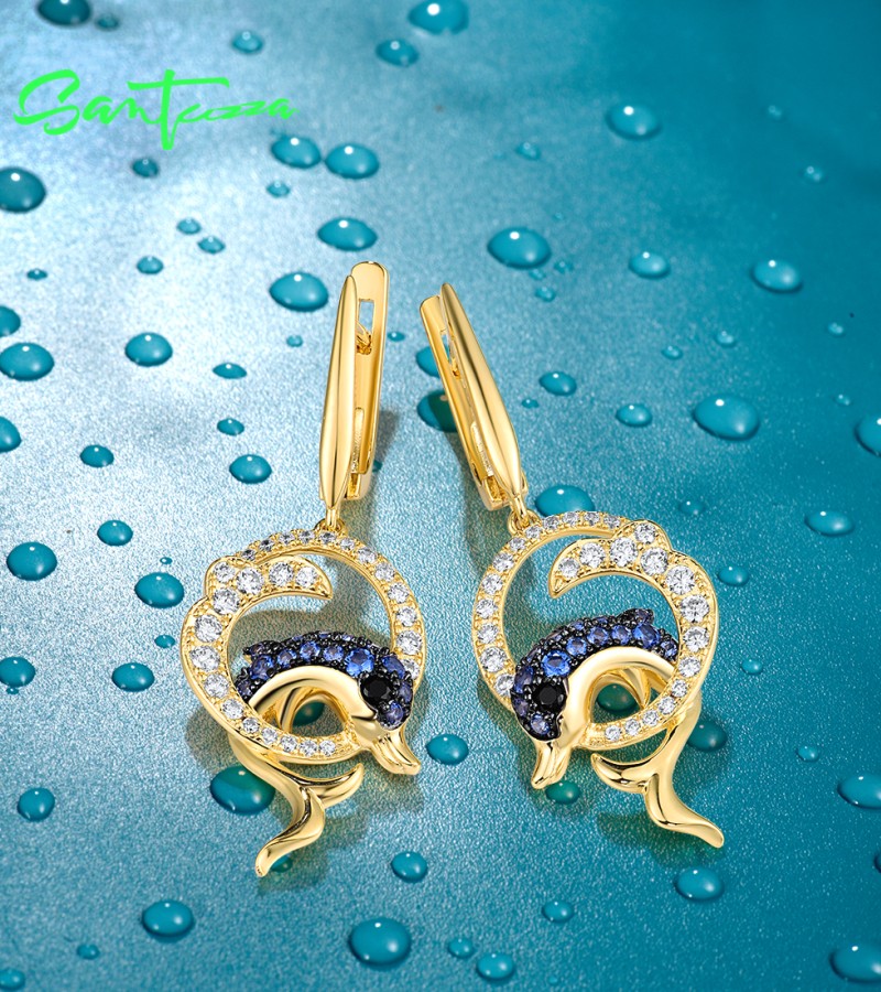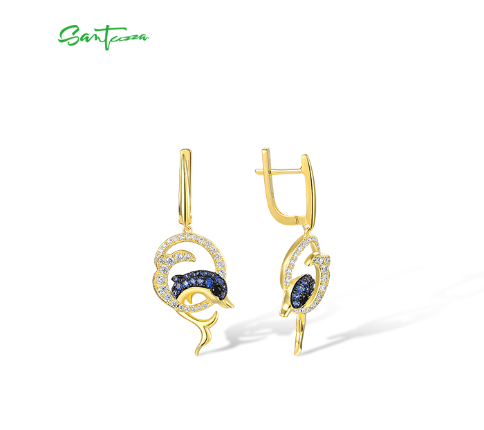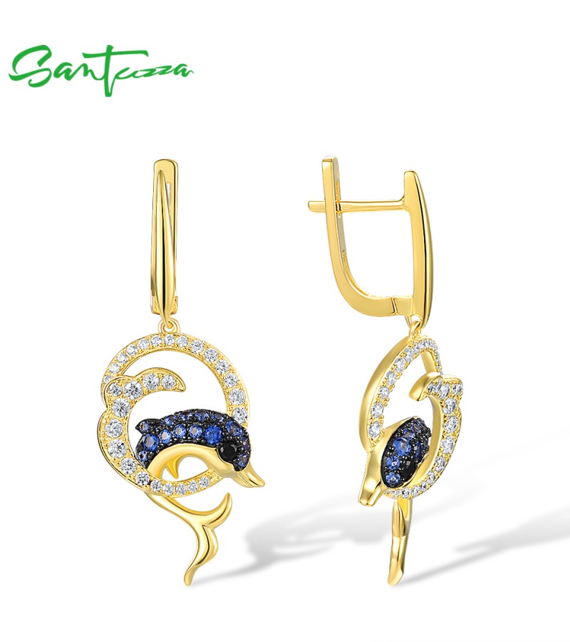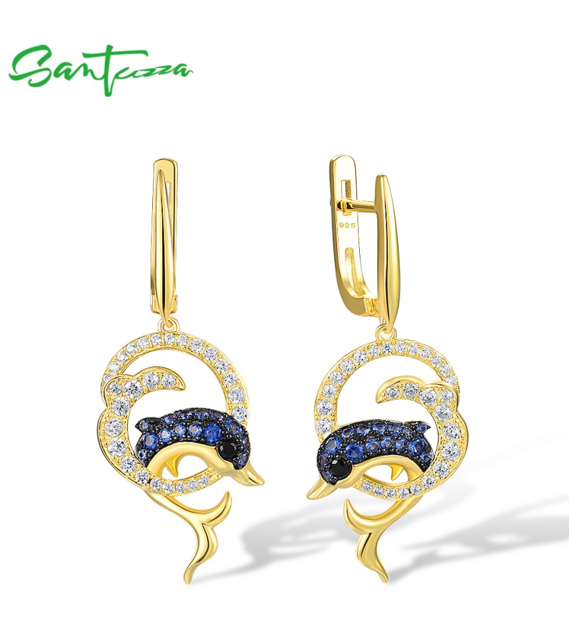 SANTUZZA 925 Sterling Silver Dangling Earrings Blue Nano White CZ Black Spinel Dolphin Fine Jewelry