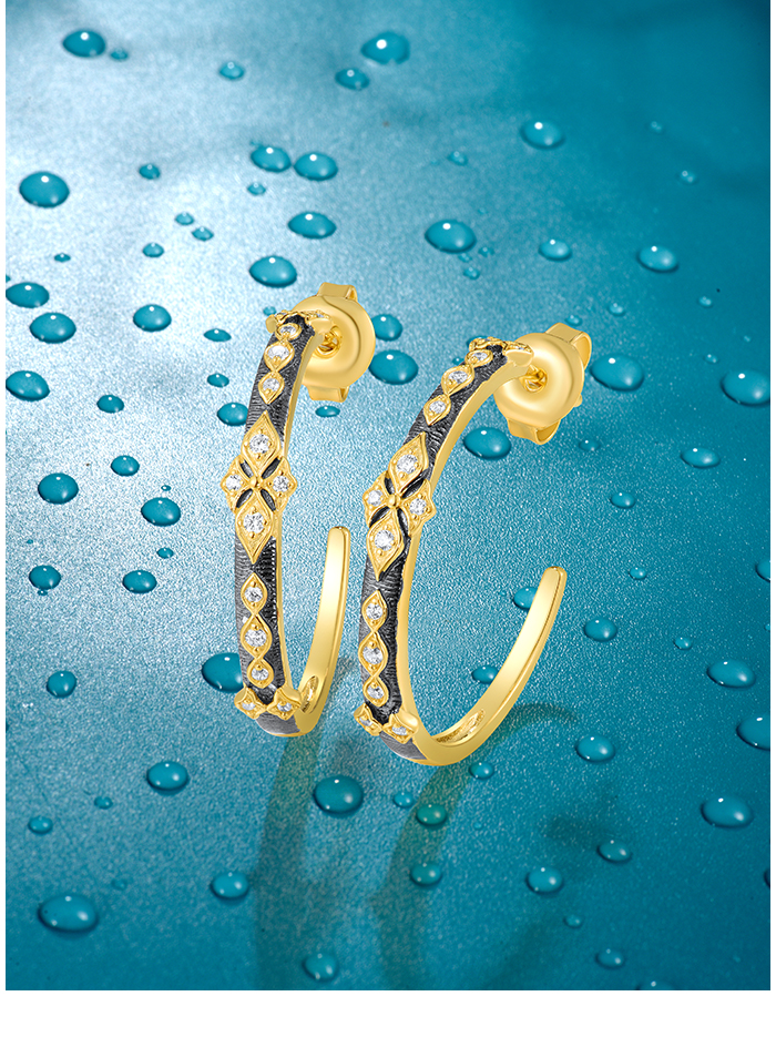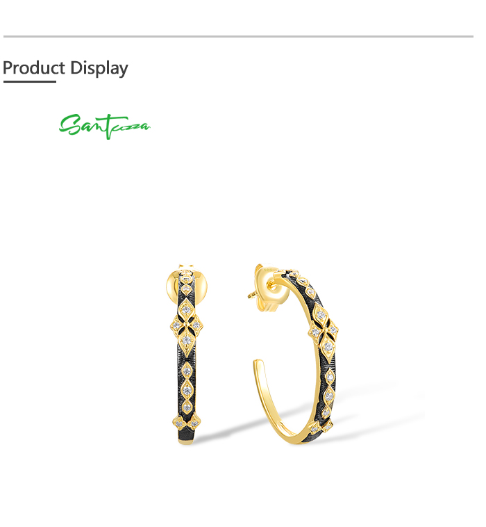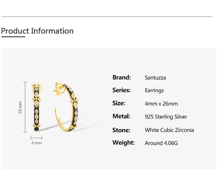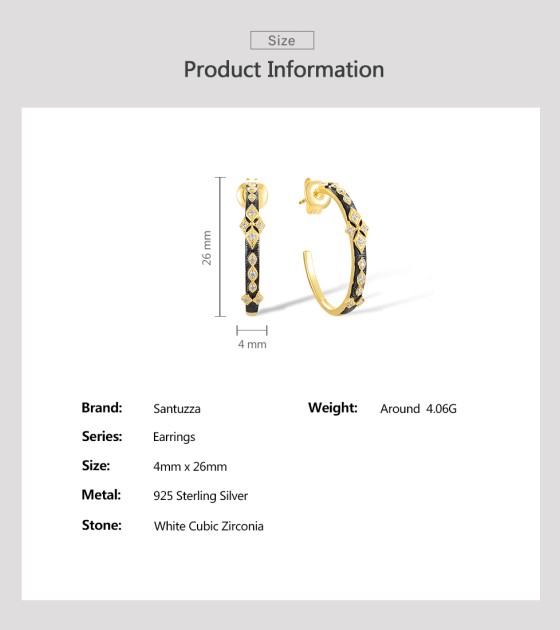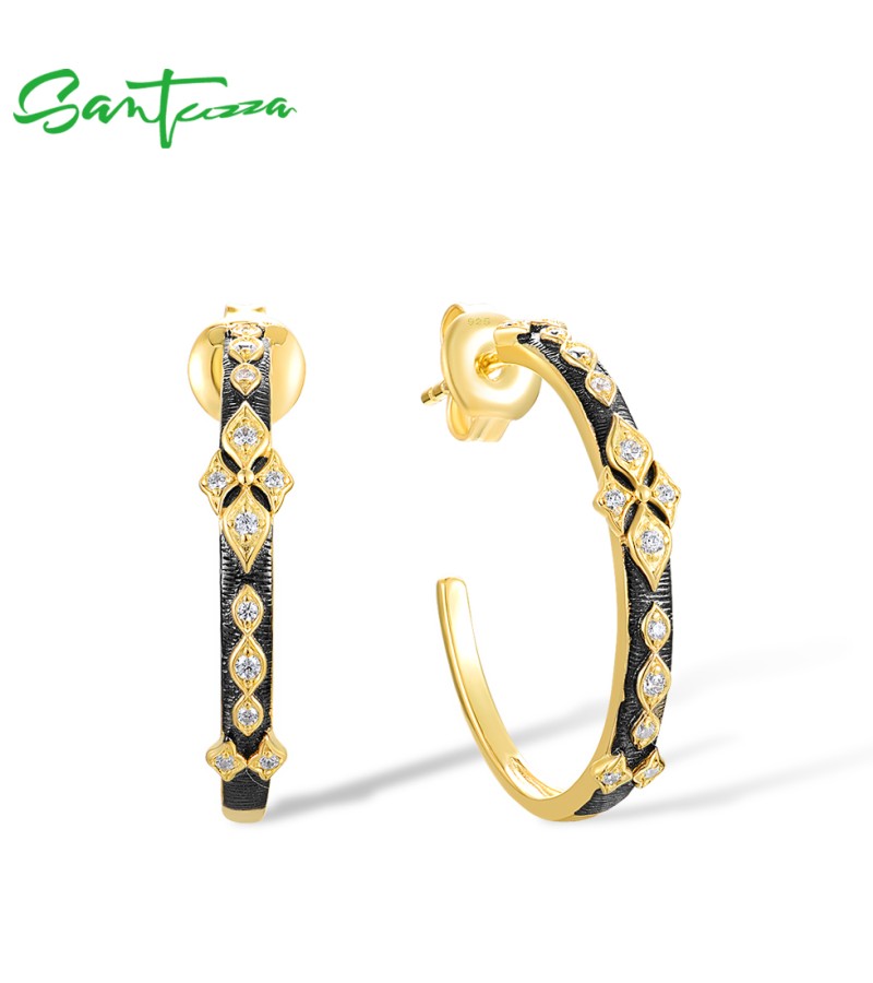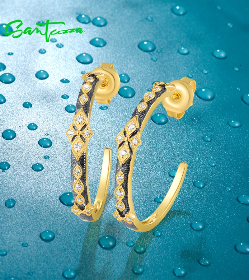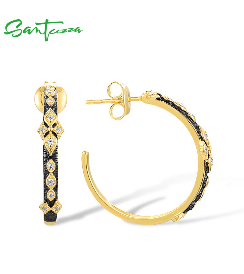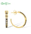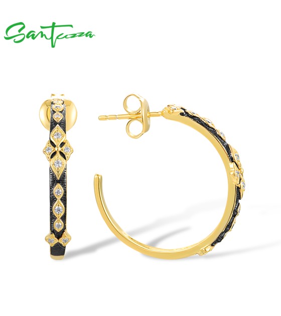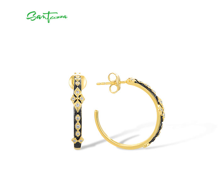 SANTUZZA Sterling Silver Circle Hoop Earrings White Zircons Yellow Black Plated Color Jewelry