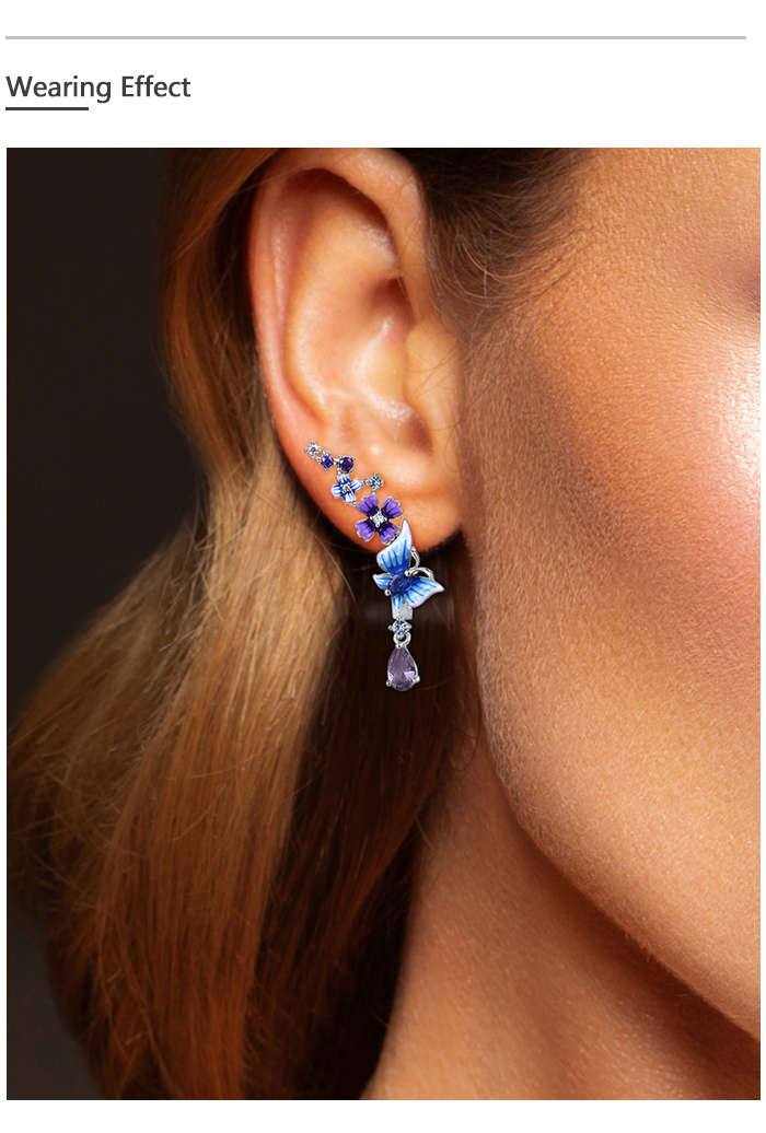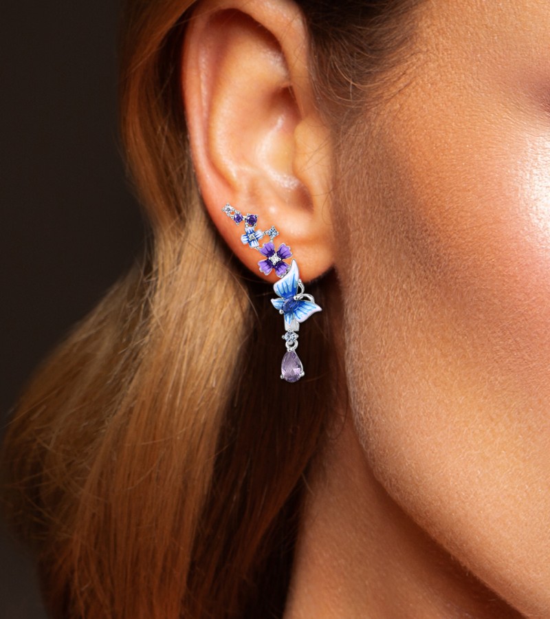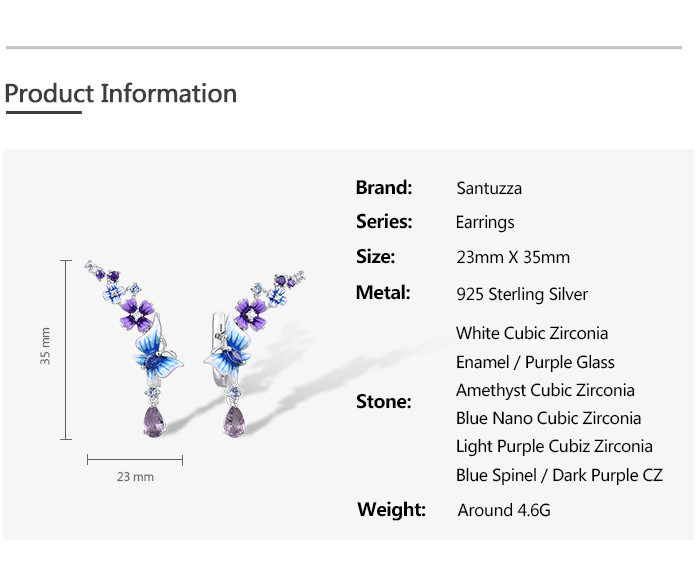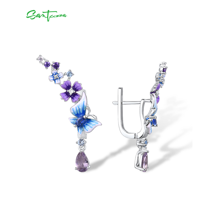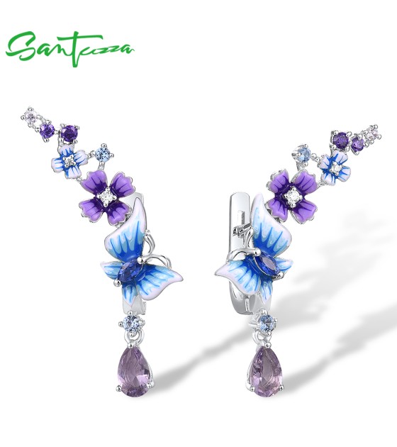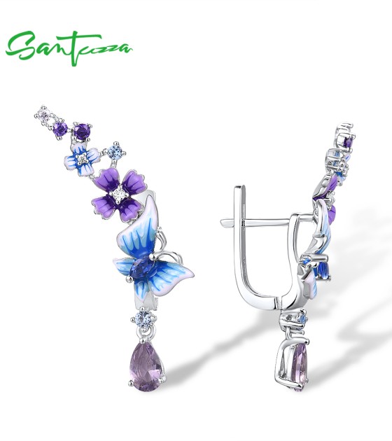 SANTUZZA 925 Sterling Silver Drop Earrings Purple Blue Stones Butterfly Flower Enamel Jewelry