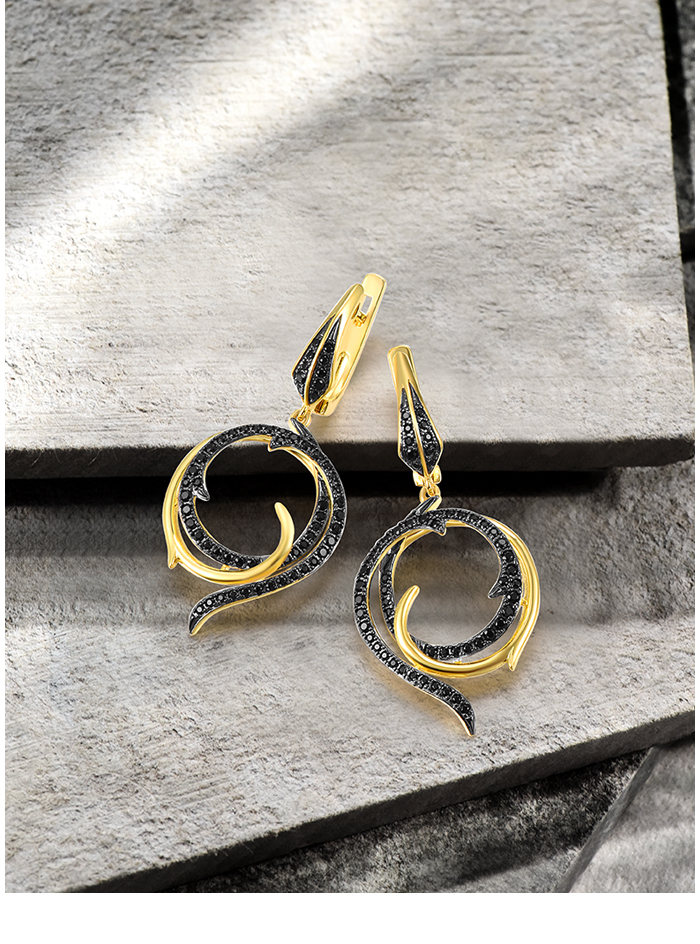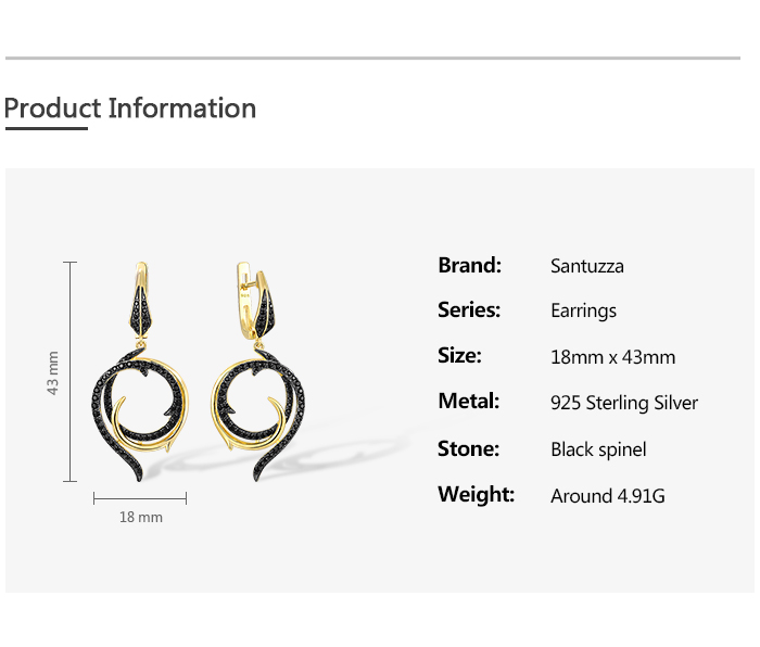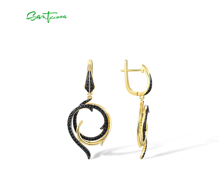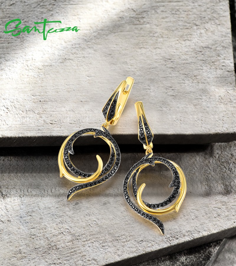 SANTUZZA 925 Sterling Silver Earrings Black Spinel Gold Color Fine Jewelry