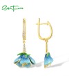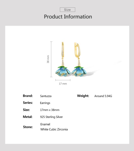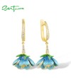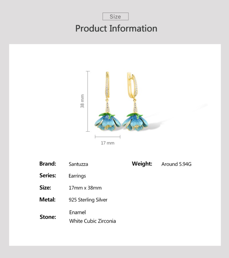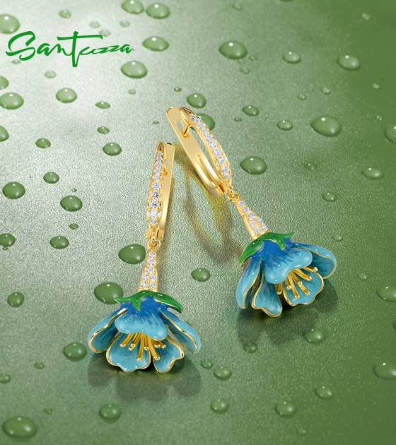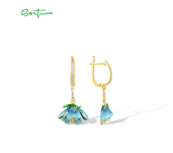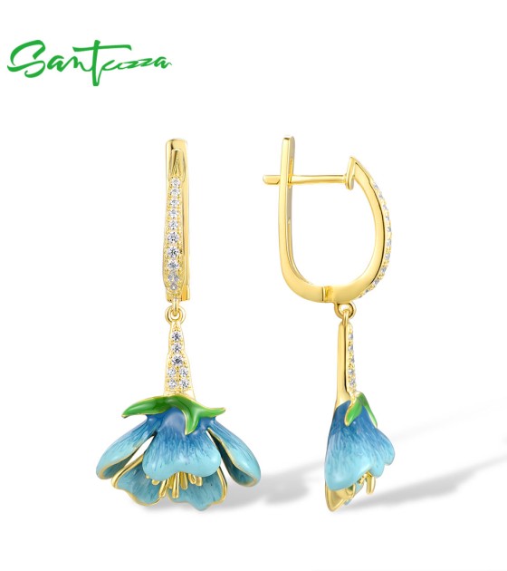 SANTUZZA 925 Sterling Silver Dangling Earrings White CZ Blue Flower Enamel Jewelry