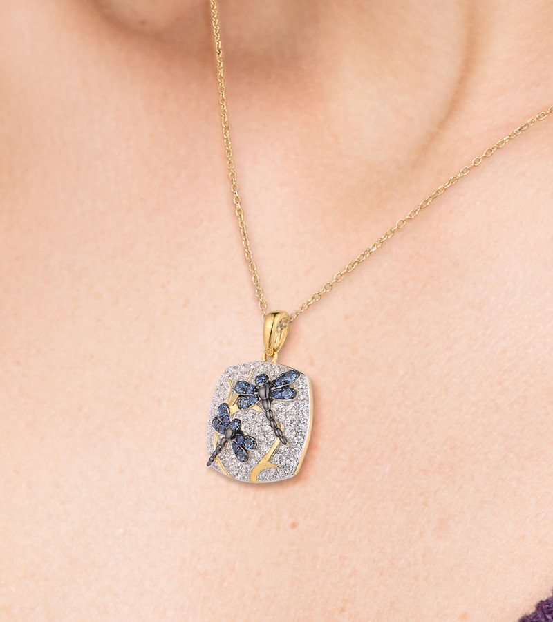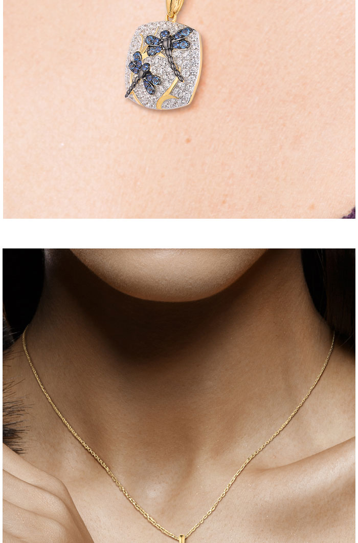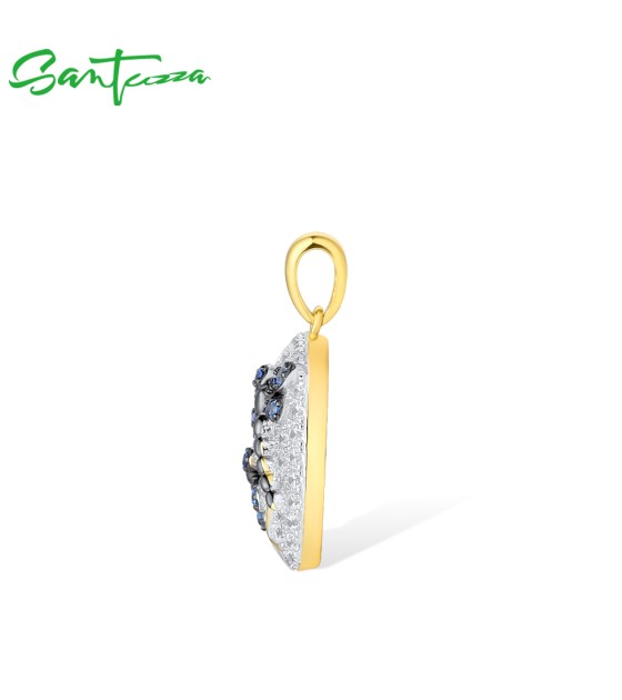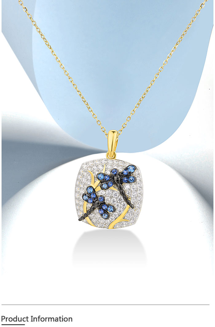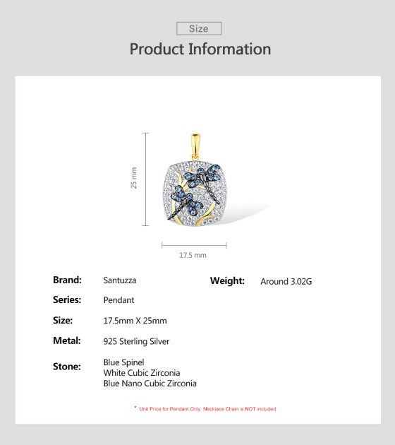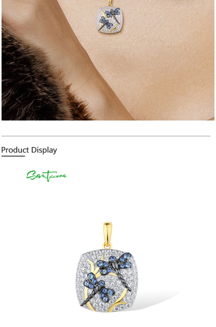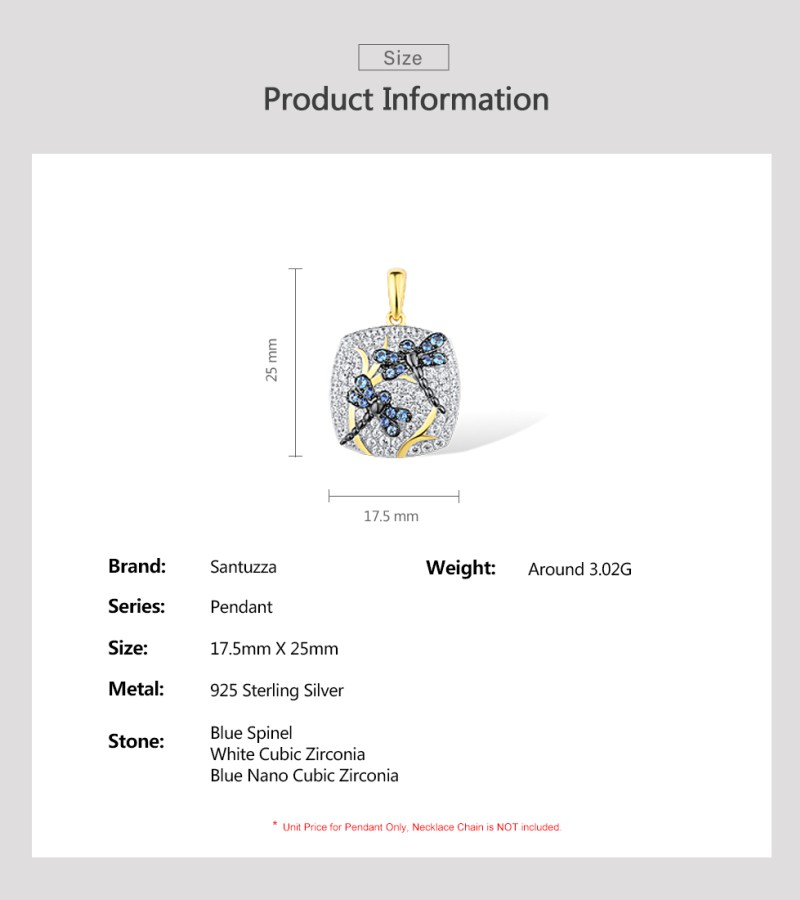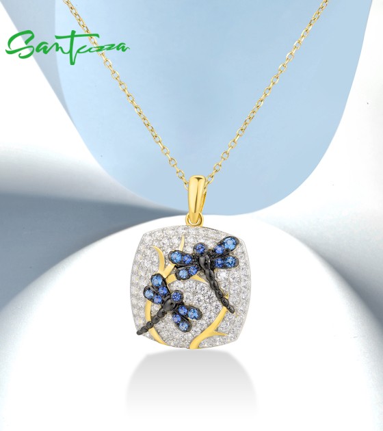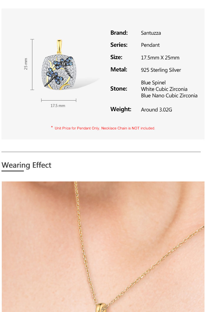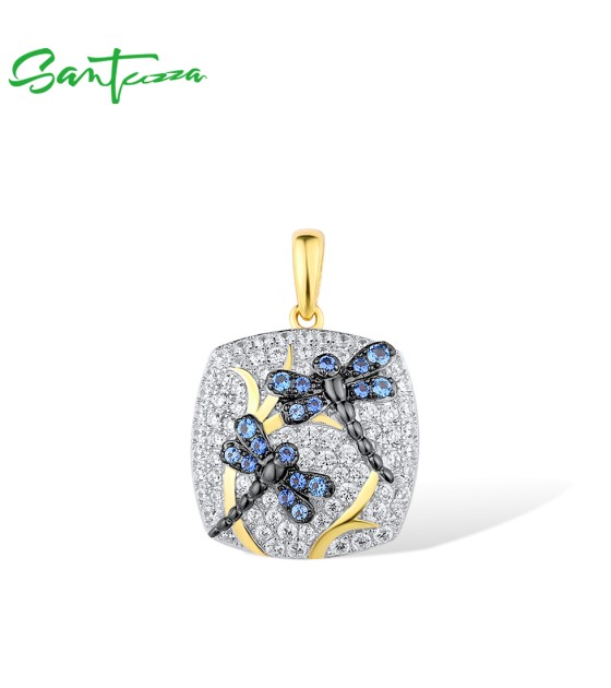 SANTUZZA 925 Sterling Silver Pendant CZ Elegant Blue Dragonfly Square Fine Jewelry