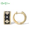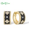 SANTUZZA 925 Sterling Silver Hoop Earrings White CZ Black Spinel Flower Fine Jewelry