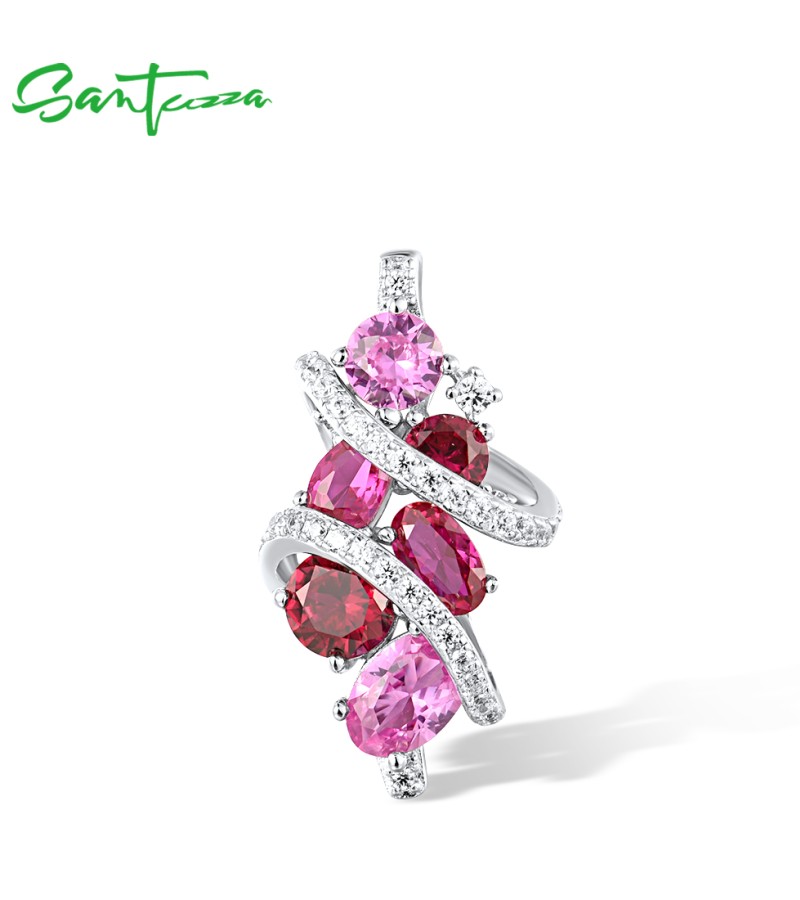 SANTUZZA 925 Sterling Silver Rings Created Pink Sapphire Ruby White CZ Fine Jewelry - US 7.5