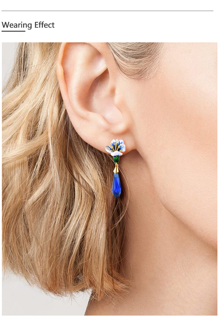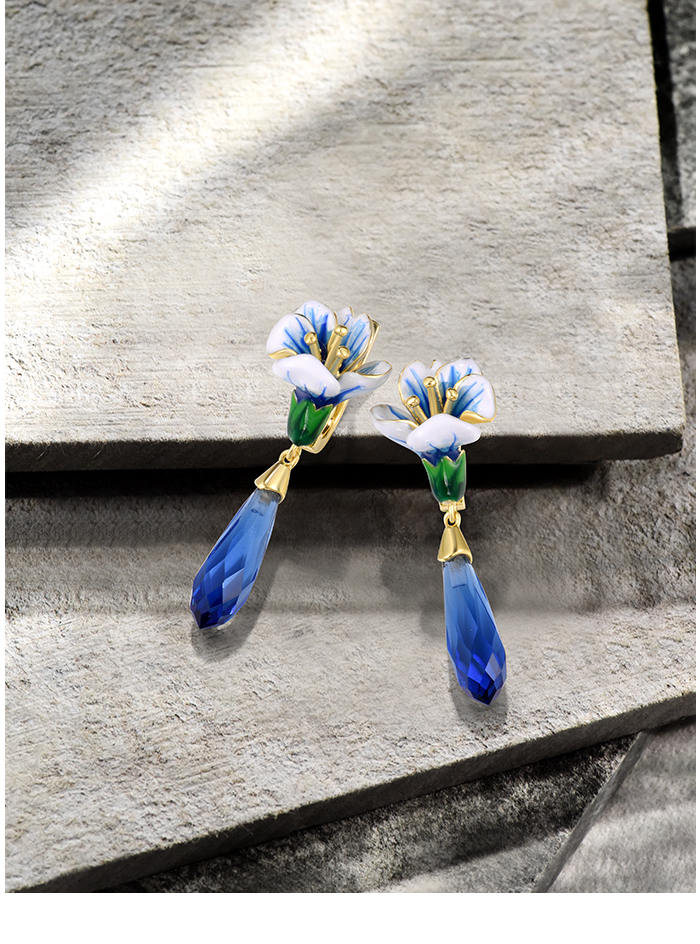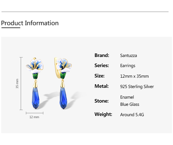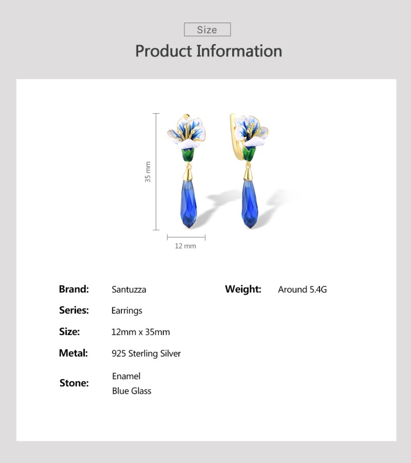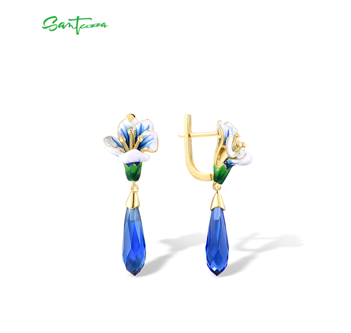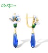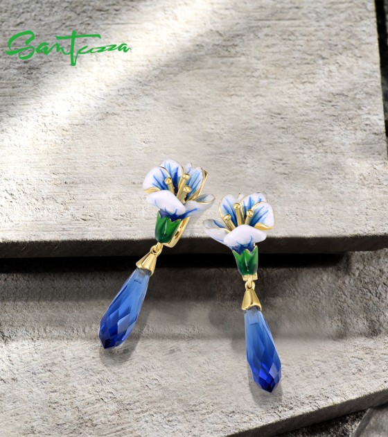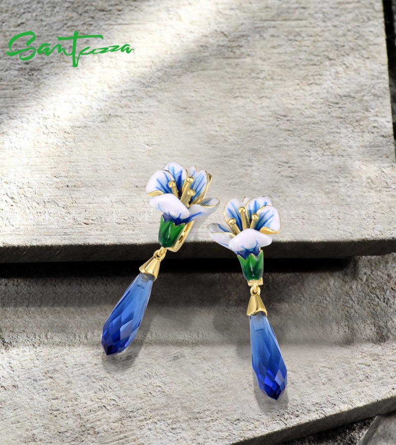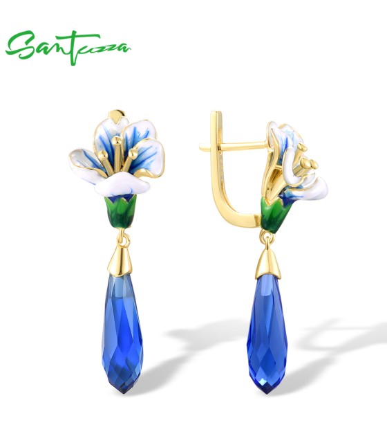 SANTUZZA 925 Sterling Silver Drop Earrings Blue Stones Handmade Enamel Flower Fine Jewelry