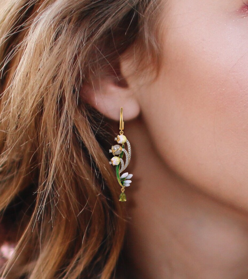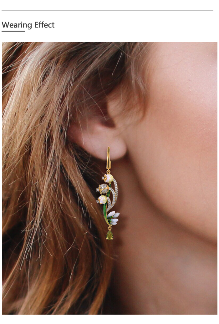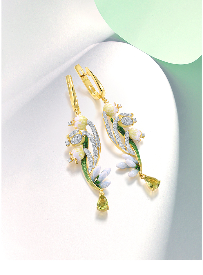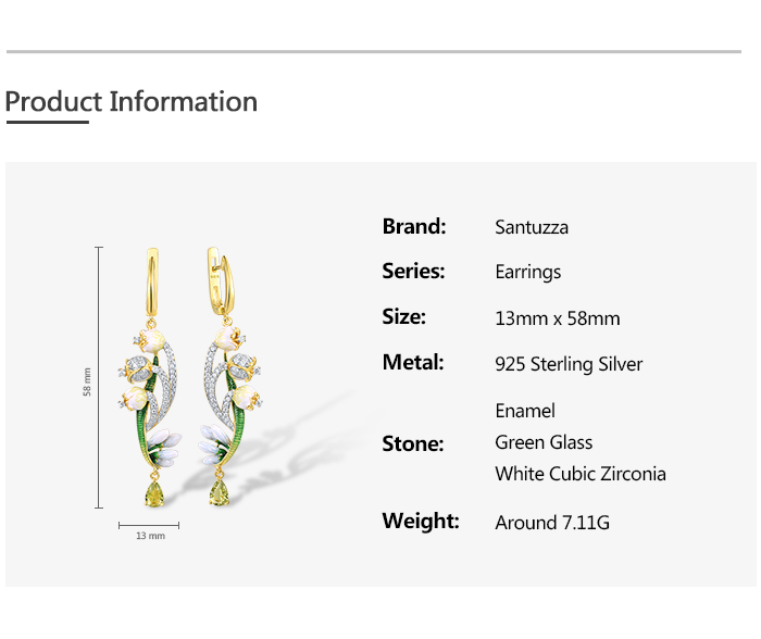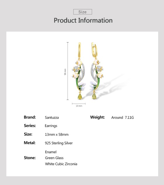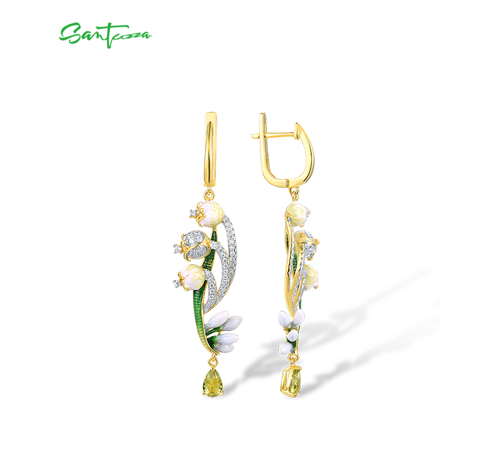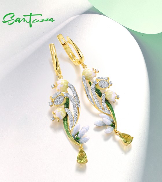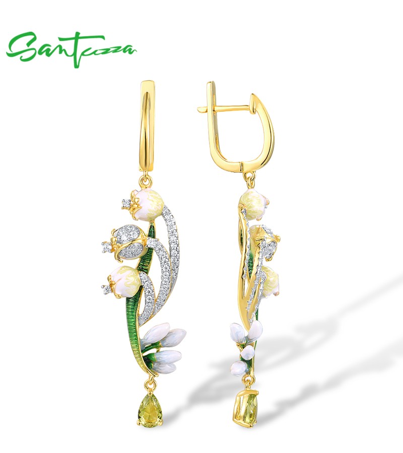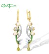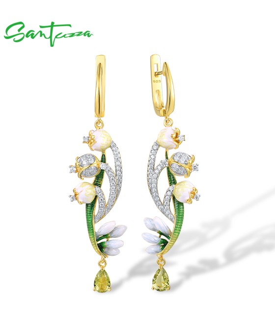 SANTUZZA 925 Sterling Silver Drop Earrings Green Stones White CZ Enamel Flower Fine Jewelry