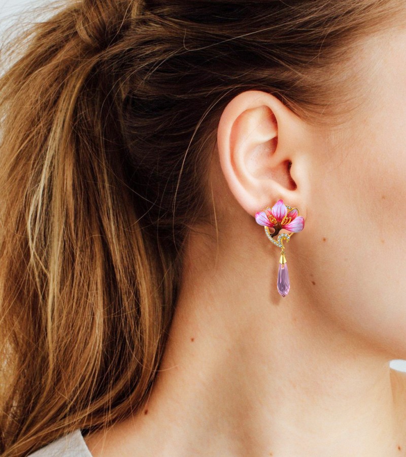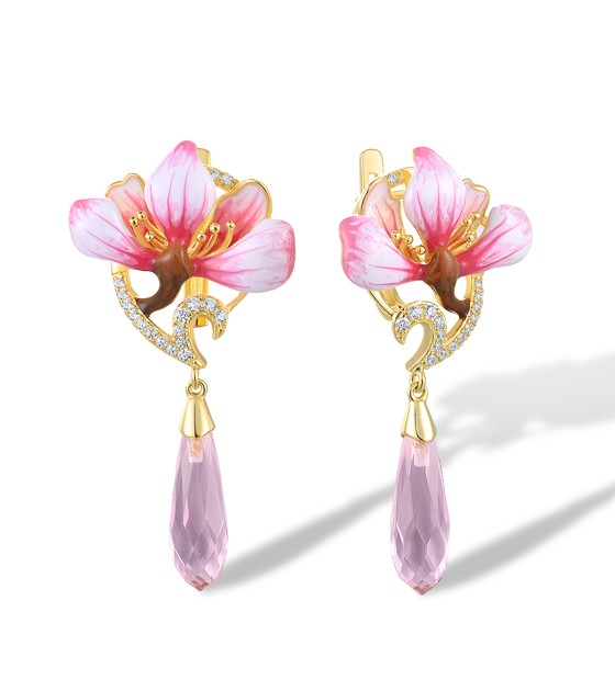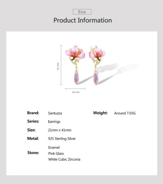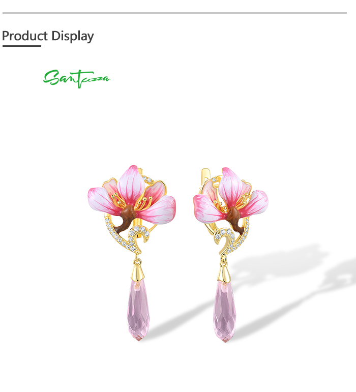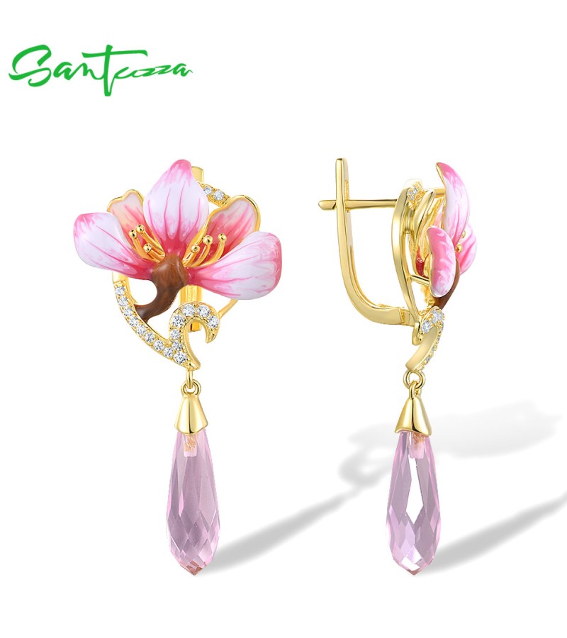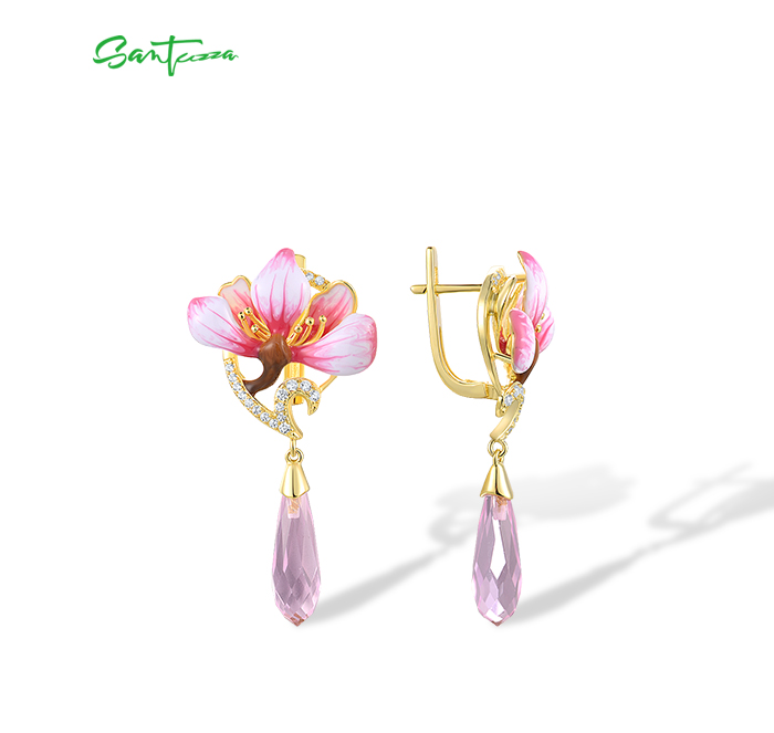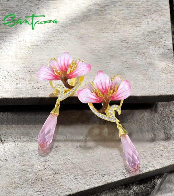SANTUZZA 925 Sterling Silver Drop Earrings Pink Stones White CZ Flower Enamel Fine Jewelry