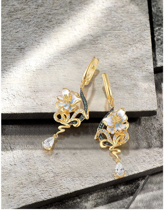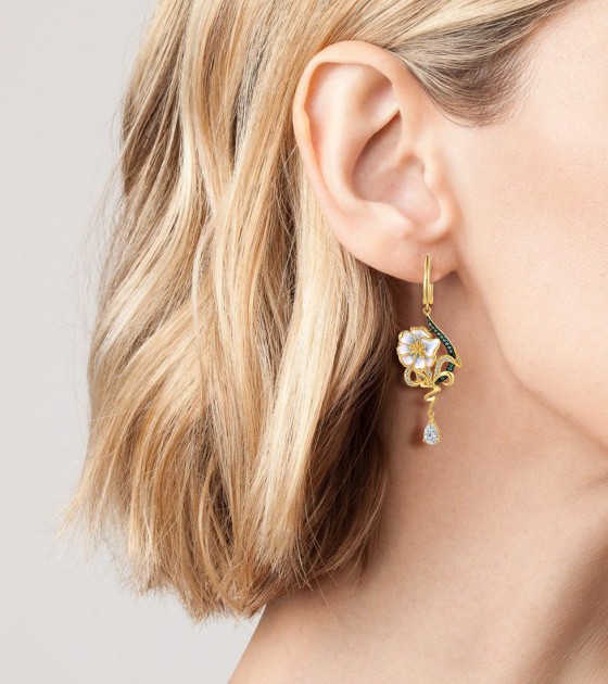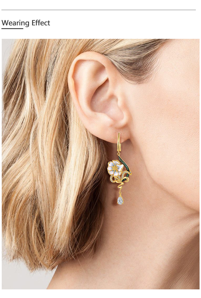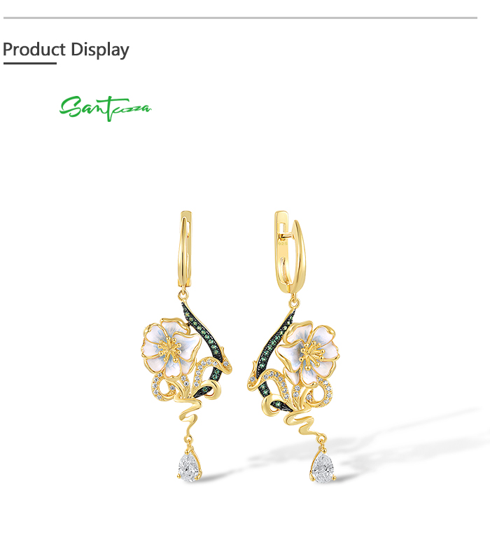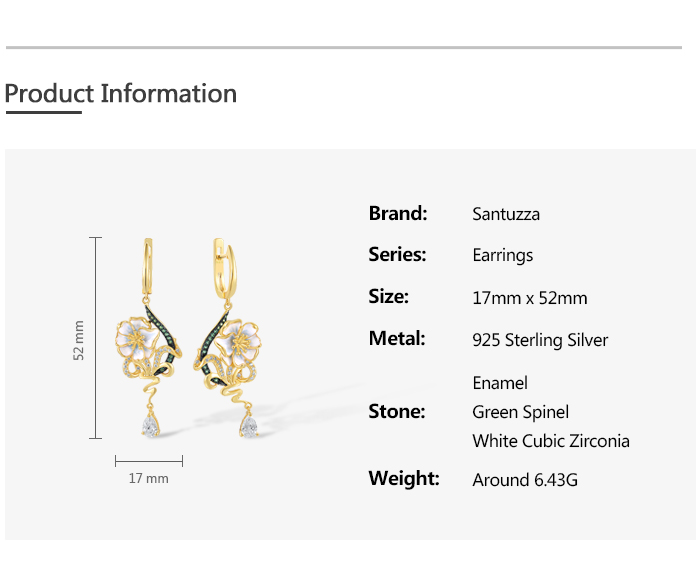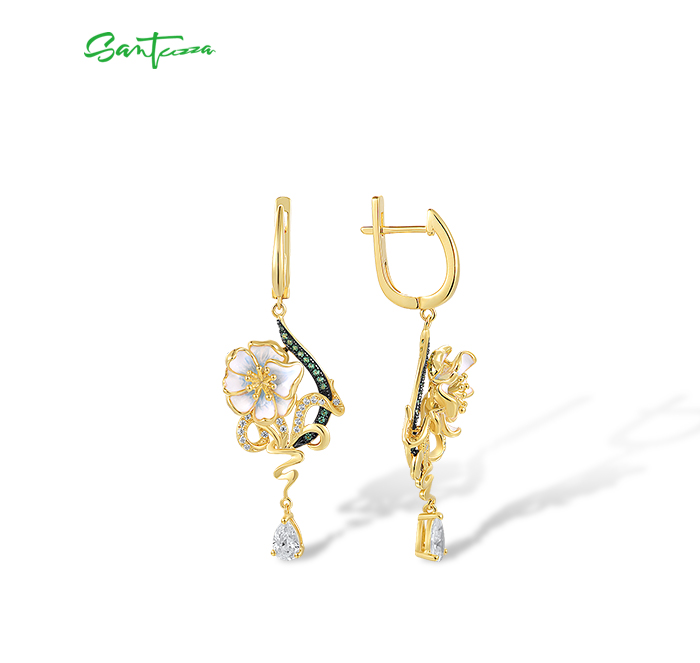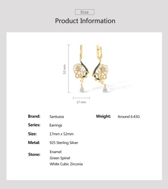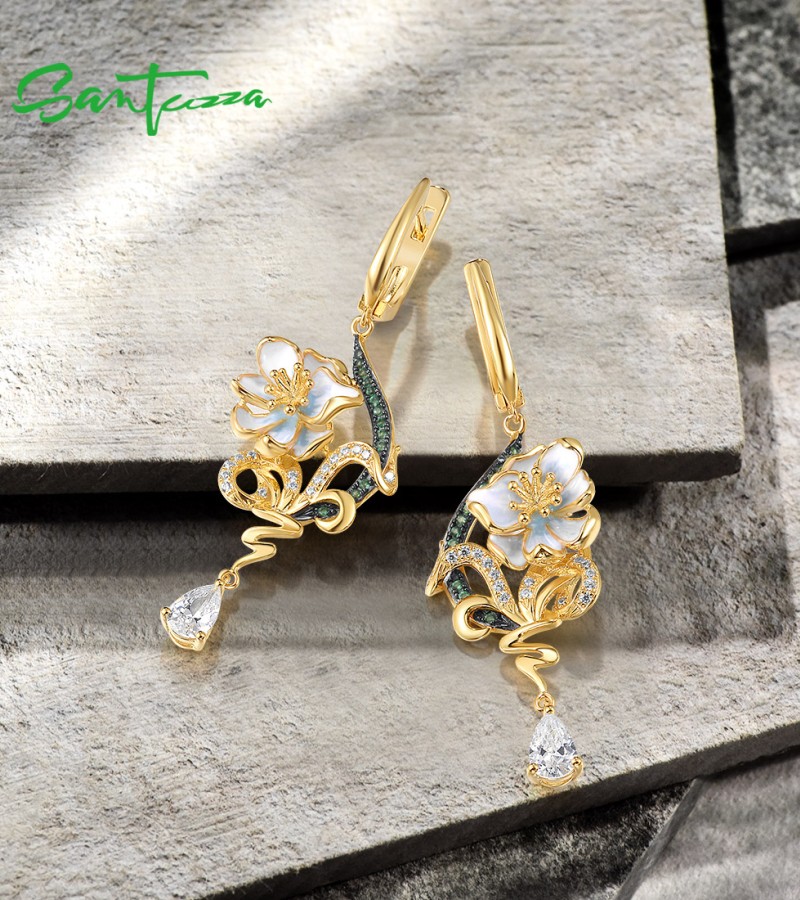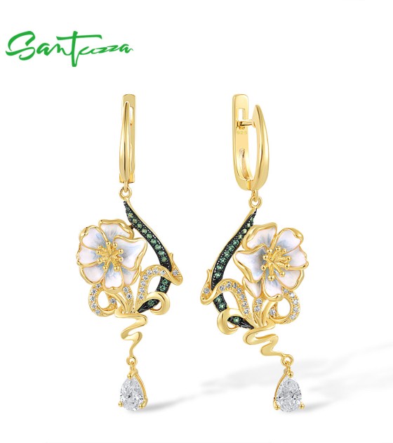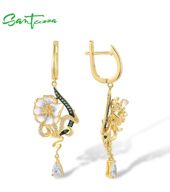 SANTUZZA 925 Sterling Silver Drop Earrings Green Spinel White CZ Enamel Flower Fine Jewelry