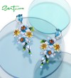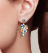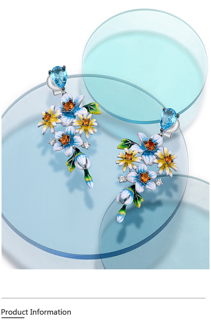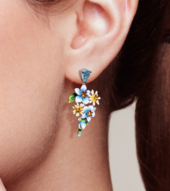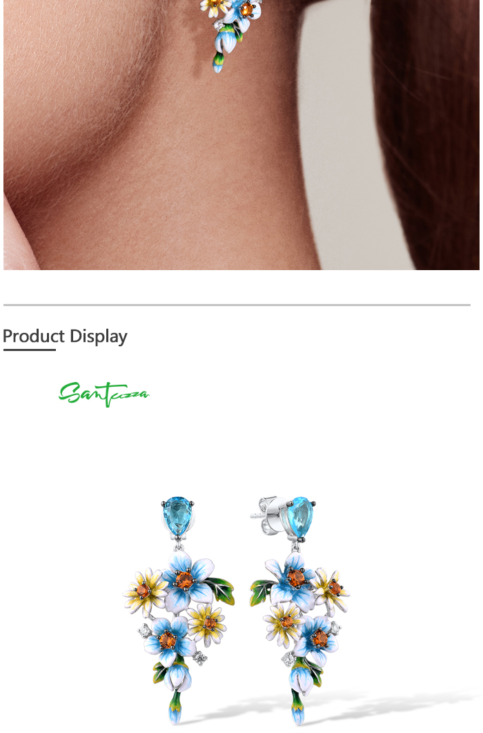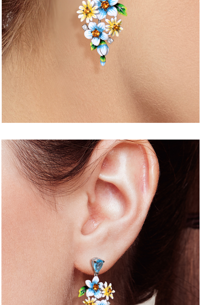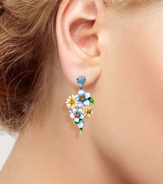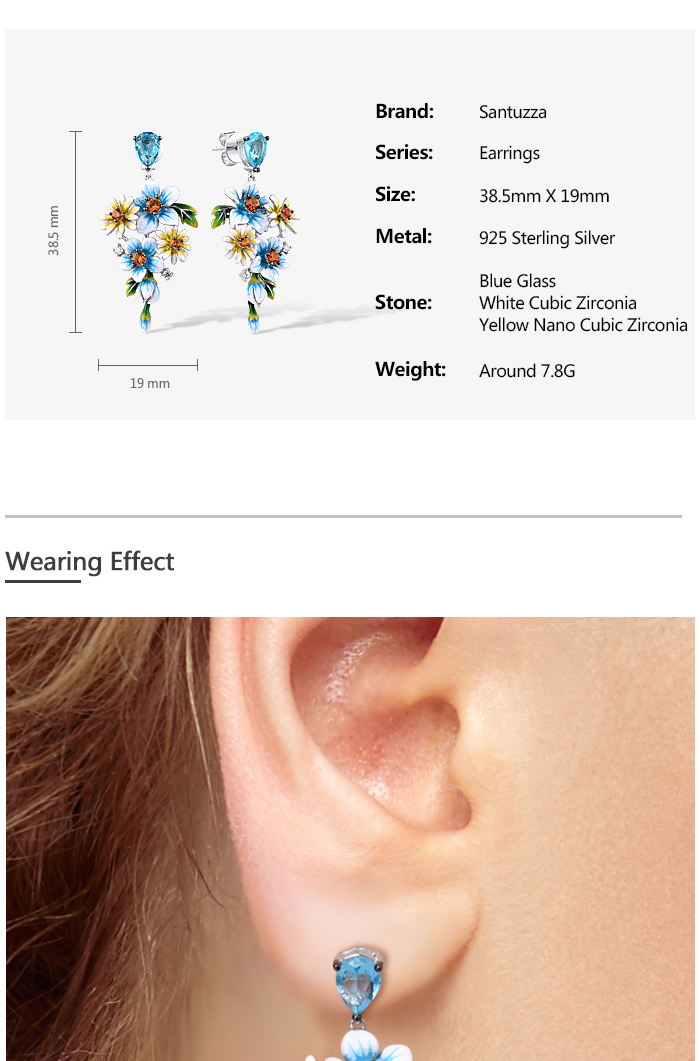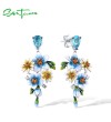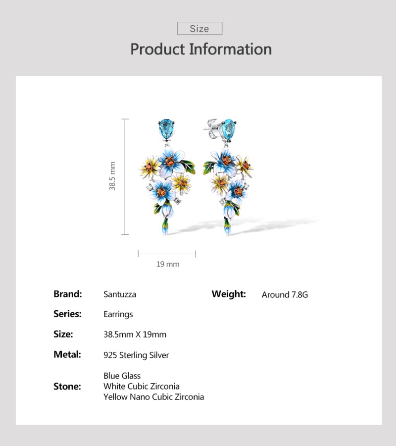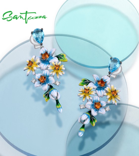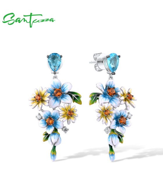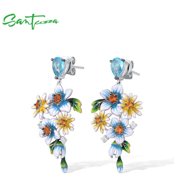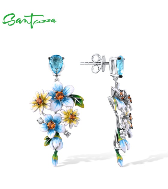 SANTUZZA 925 Sterling Silver Earrings Blue Yellow Flowers Cubic Zirconia Jewelry Enamel