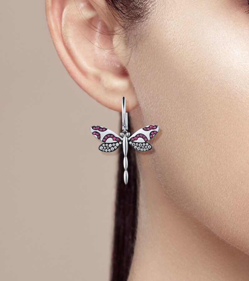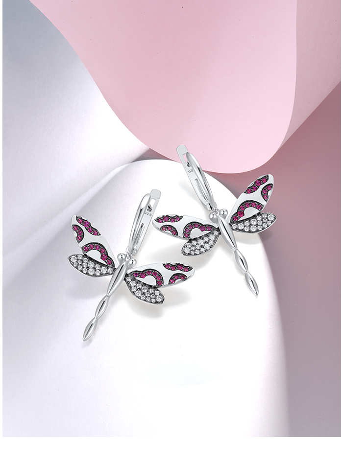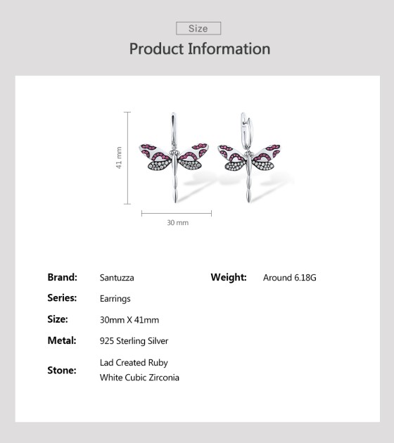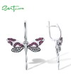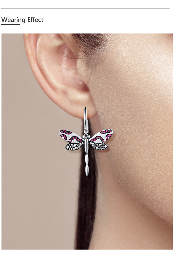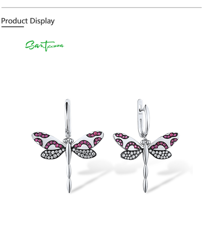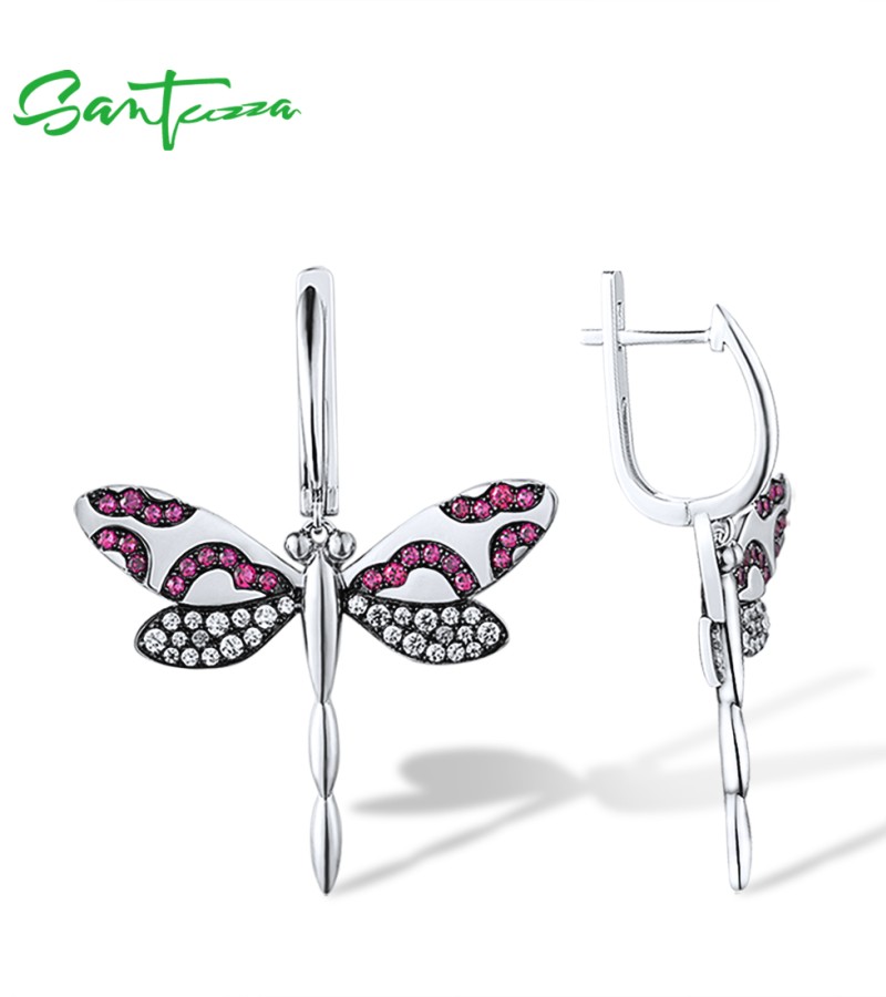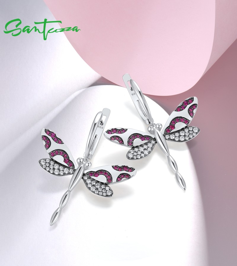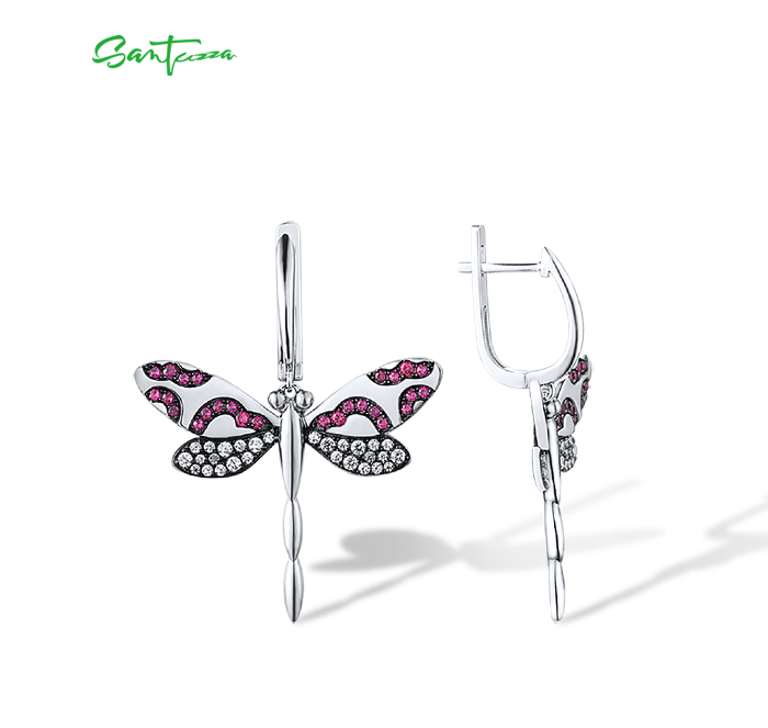 SANTUZZA 925 Sterling Silver Drop Earrings Lab Created Ruby White CZ Pink Dragonfly Fine Jewelry