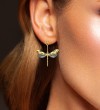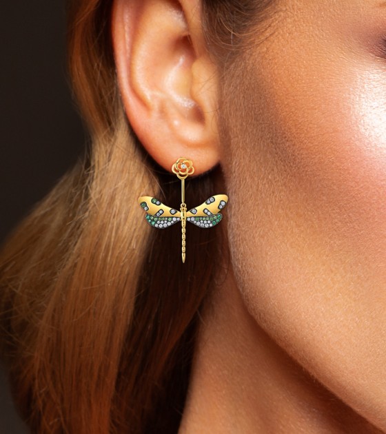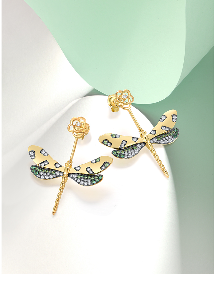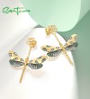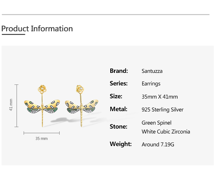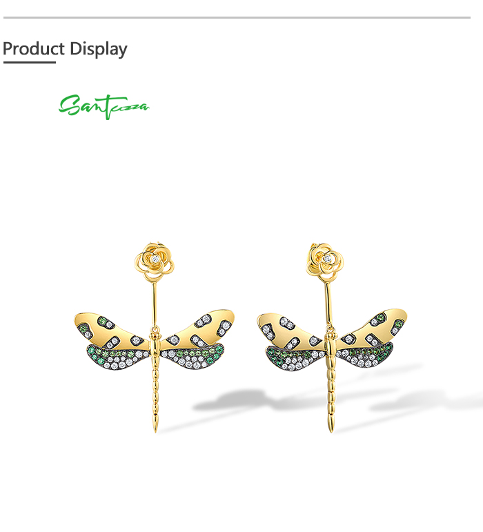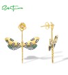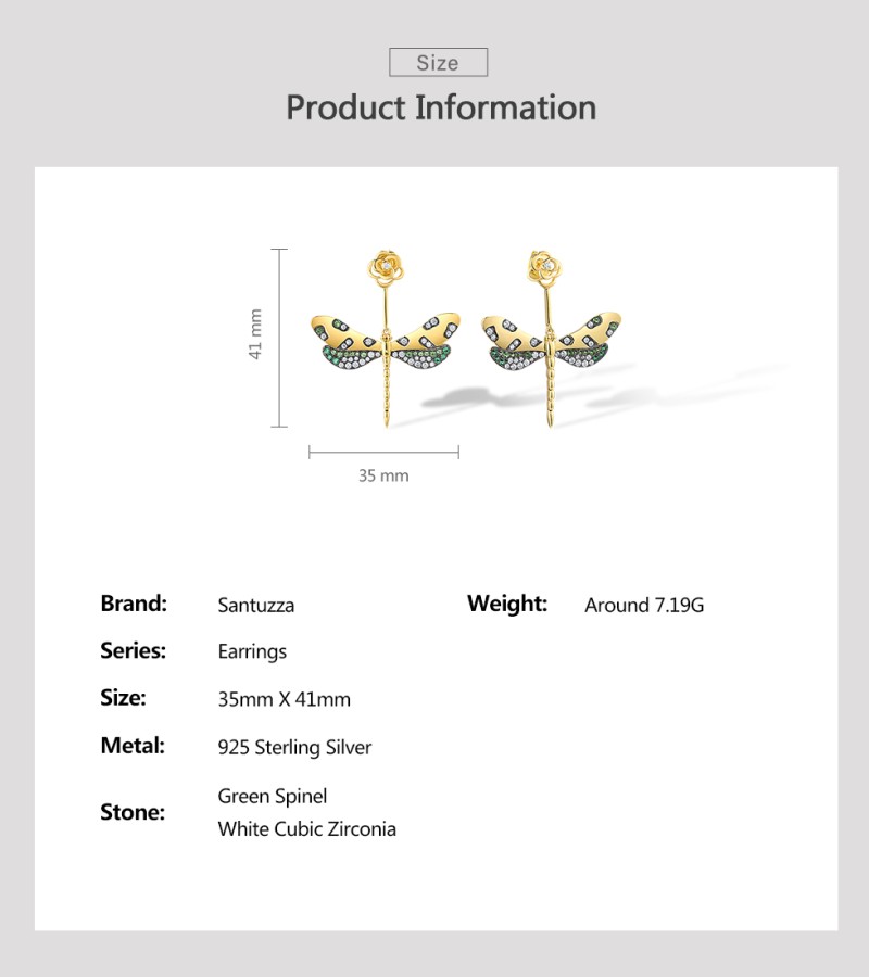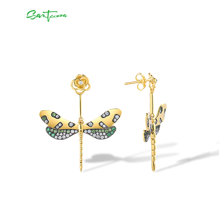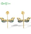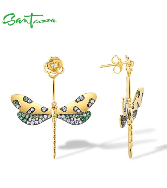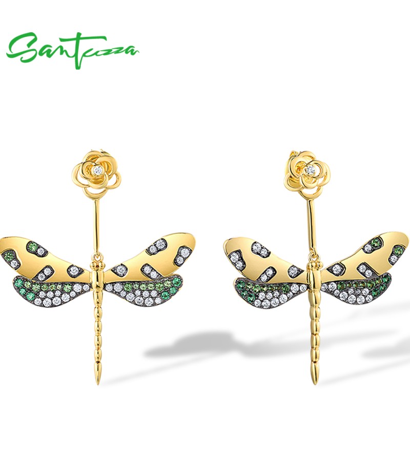 SANTUZZA 925 Sterling Silver Earrings Green Spinel White CZ Golden Dragonfly Flower Fine Jewelry