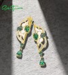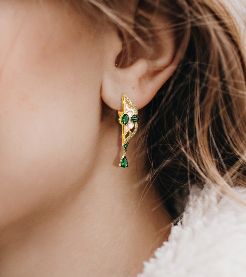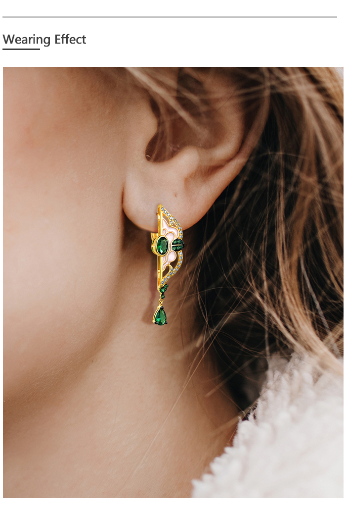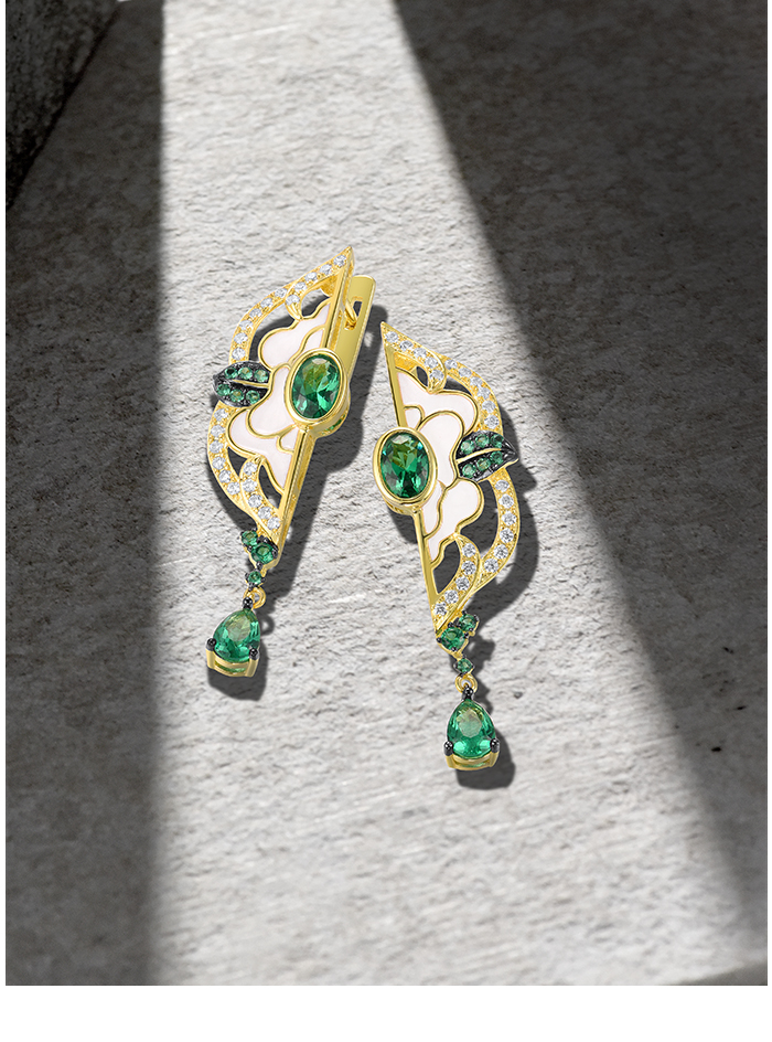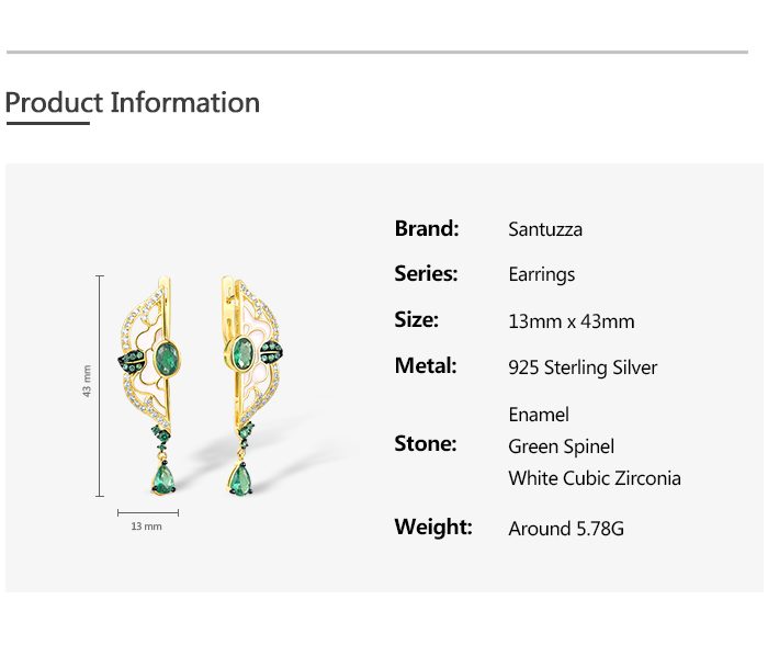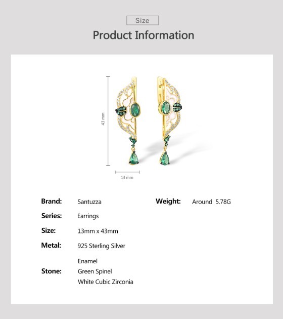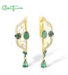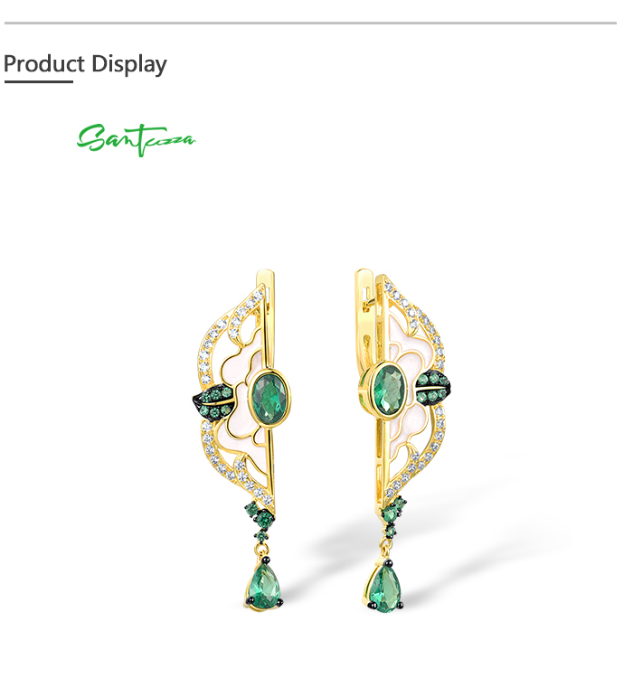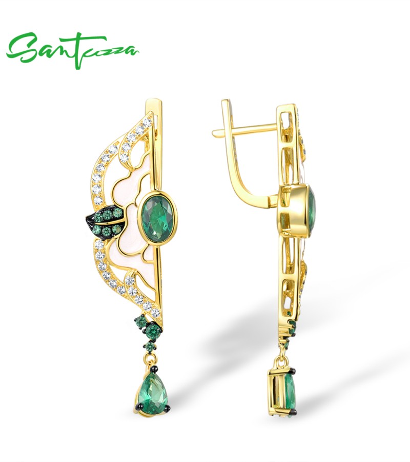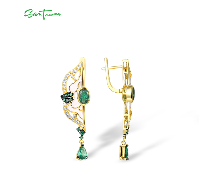 SANTUZZA 925 Sterling Silver Earrings White CZ Green Spinel Enamel Peony Gold Color Fine Jewelry