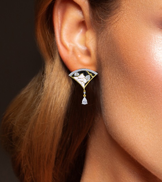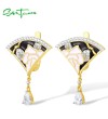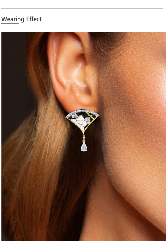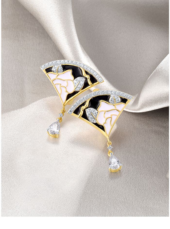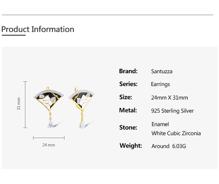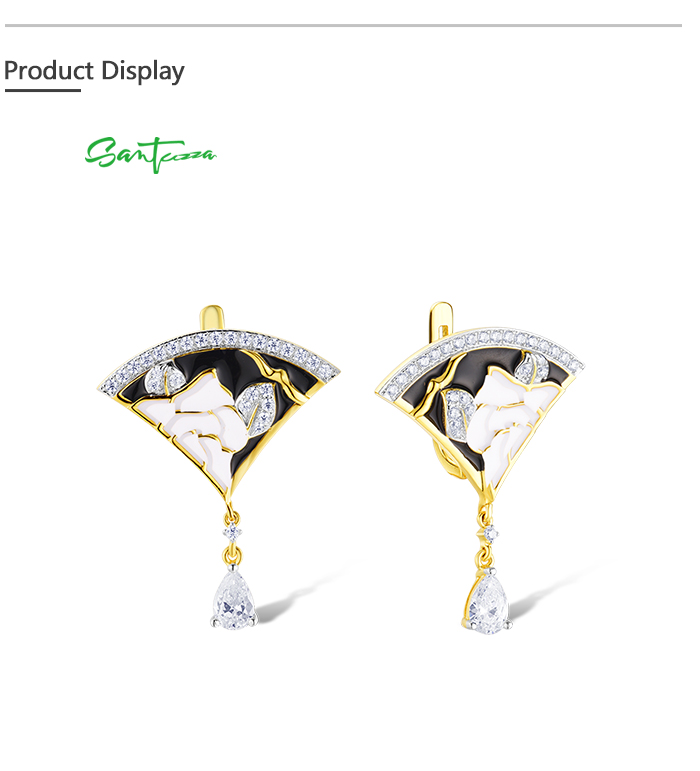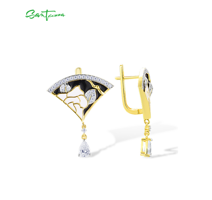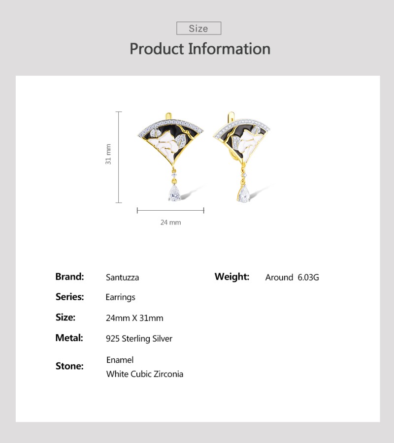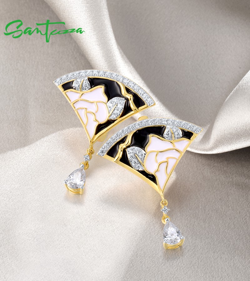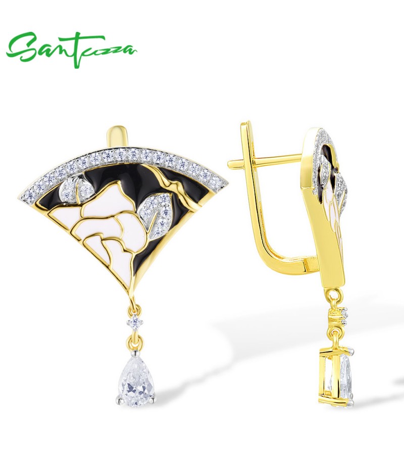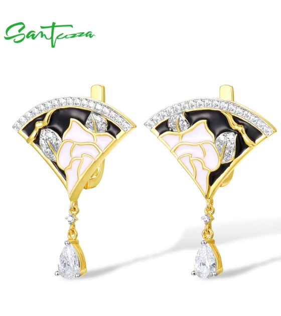 SANTUZZA 925 Sterling Silver Earrings Oriental Flower White/Black Enamel Fan Dangling Fine Jewelry
