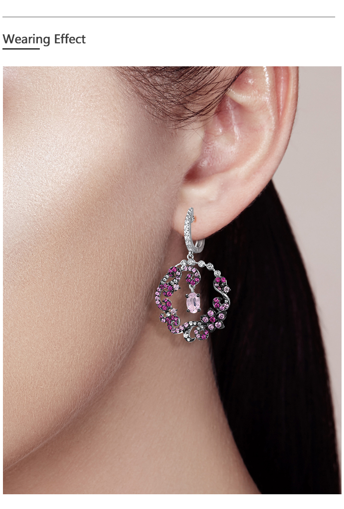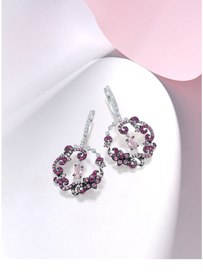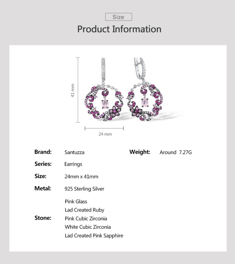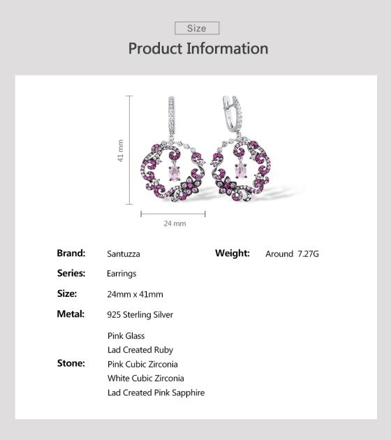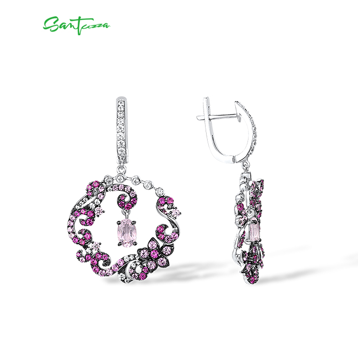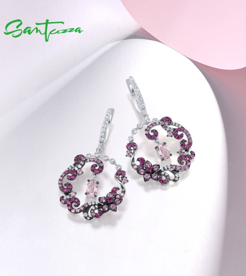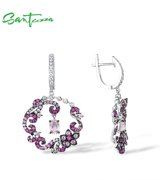 SANTUZZA 925 Sterling Silver Drop Earrings Red Pink Stones White CZ Round Flower Earrings Jewelry