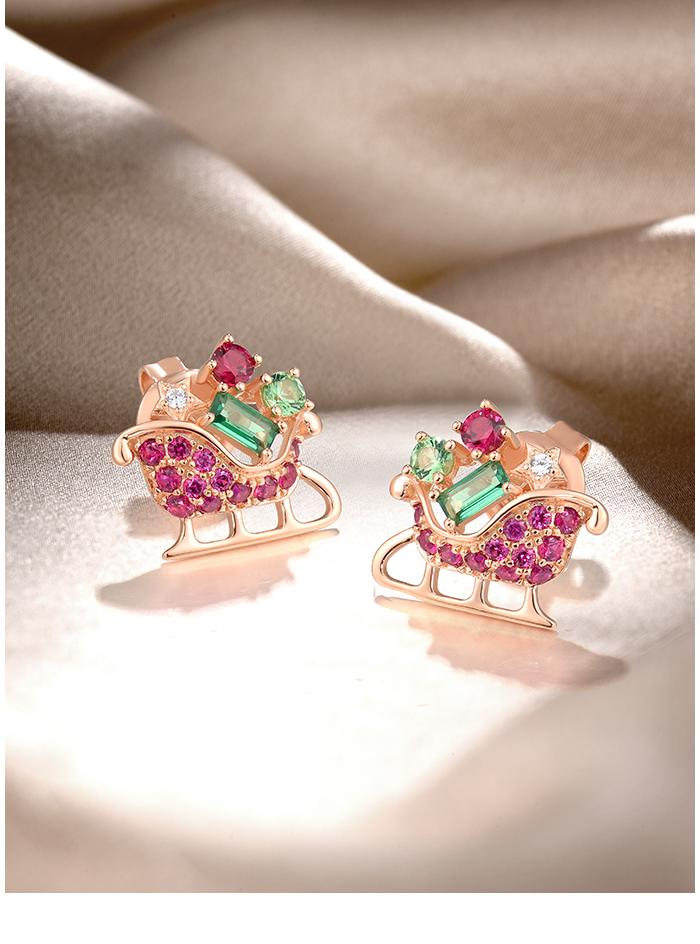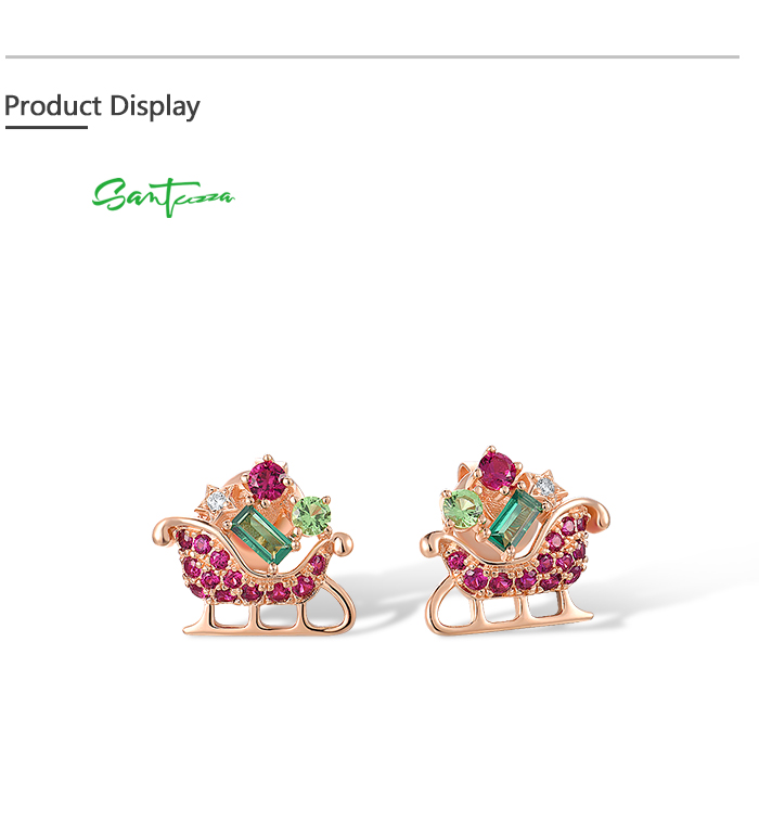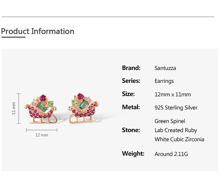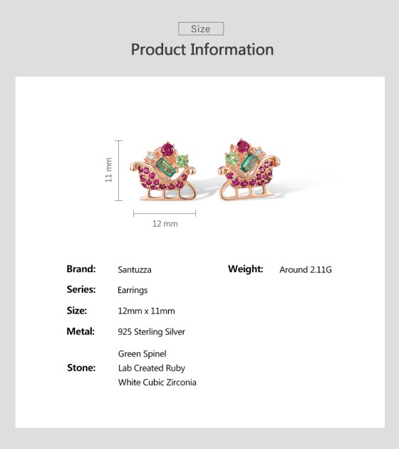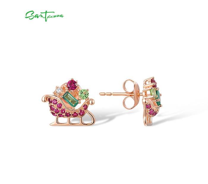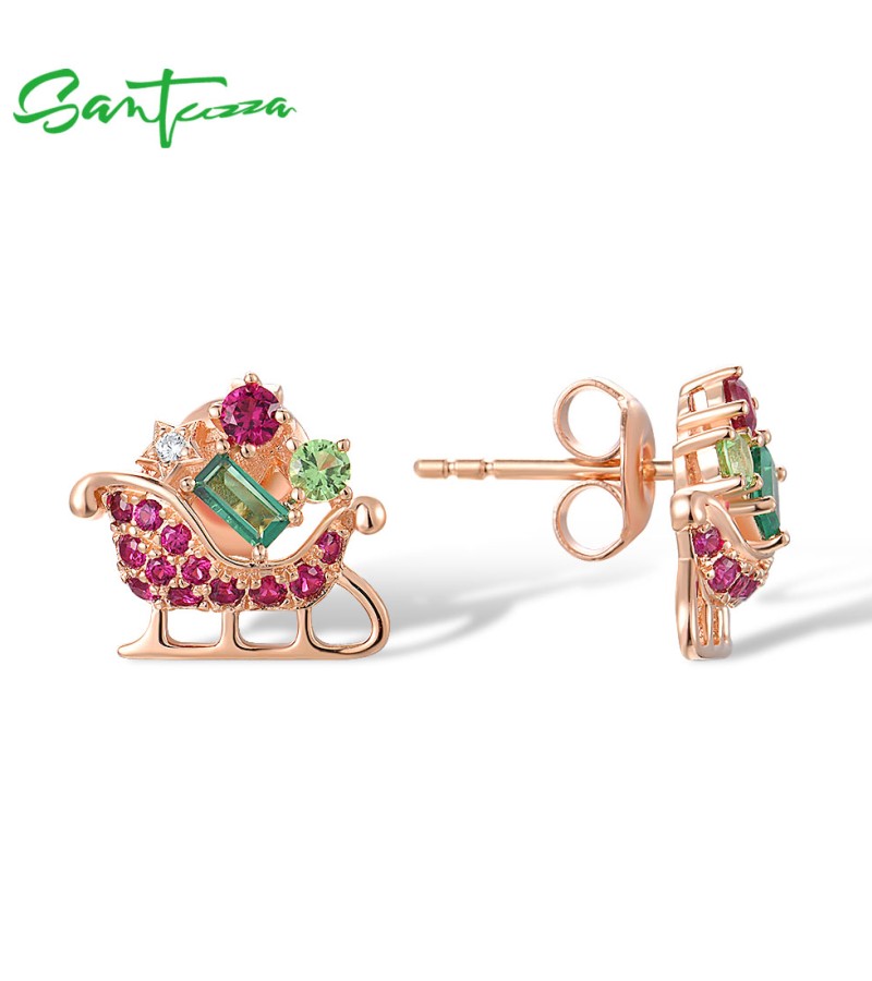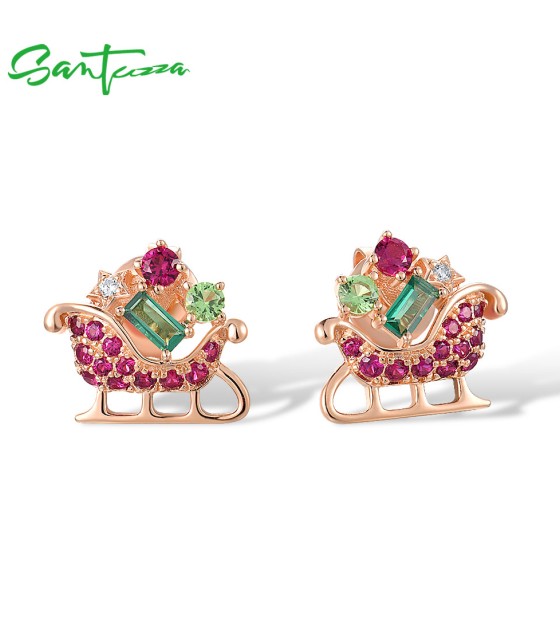 SANTUZZA 925 Sterling Silver Earrings Green Red Stones Exquisite Christmas Sleigh Jewelry