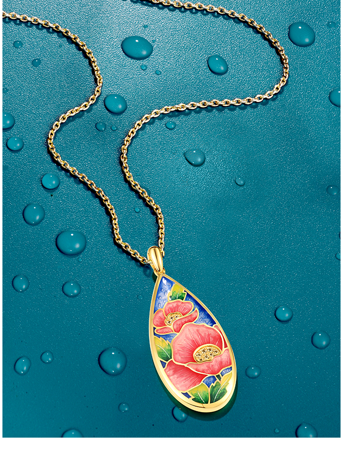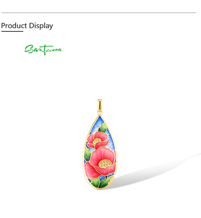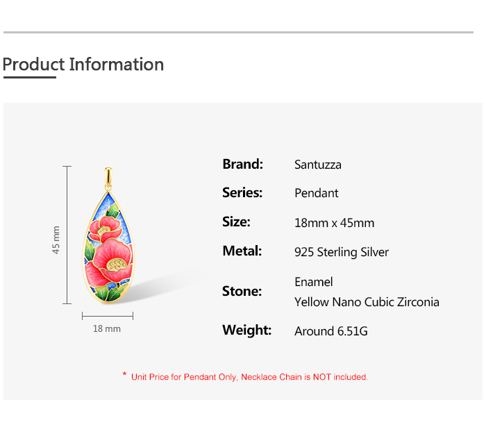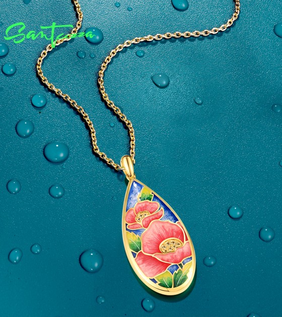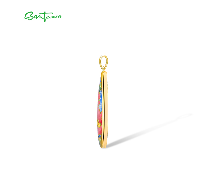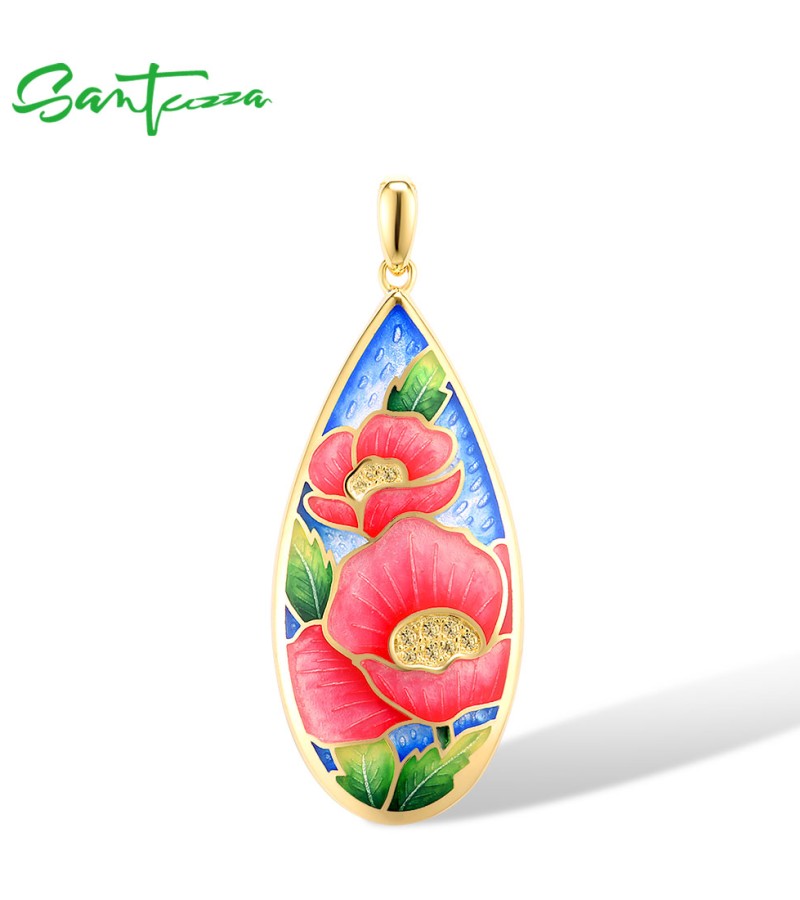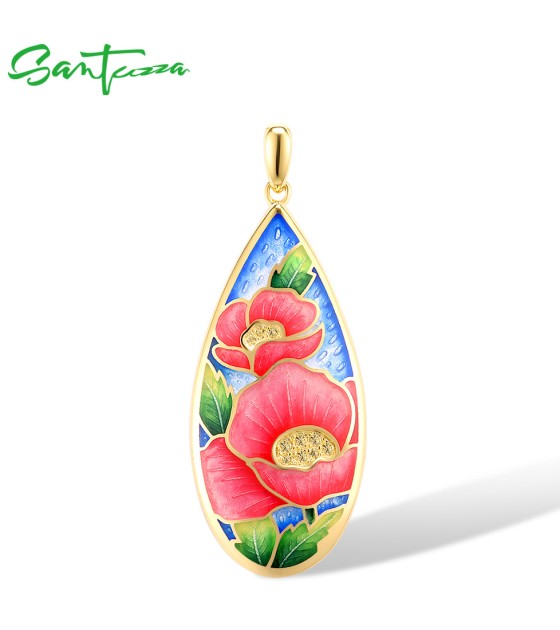 SANTUZZA 925 Sterling Silver Pendant Yellow Nano CZ Red Lotus Flower Jewelry Handmade Enamel