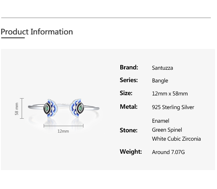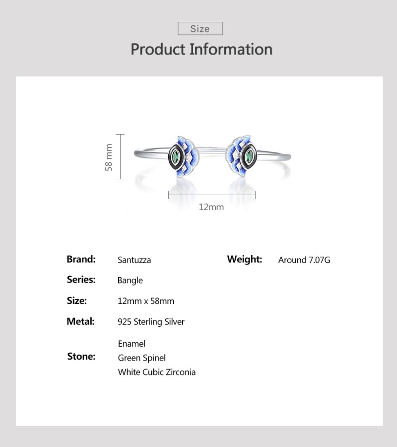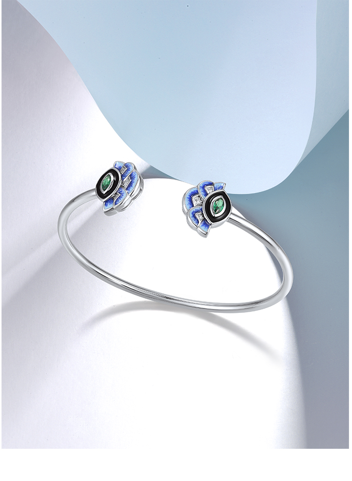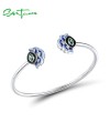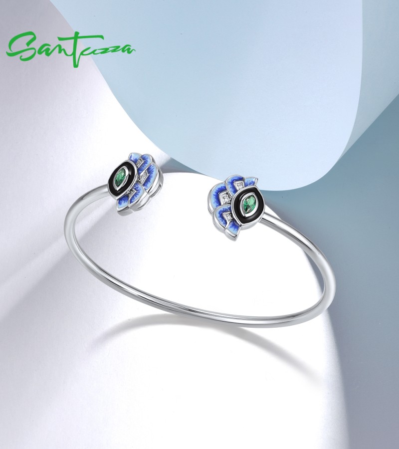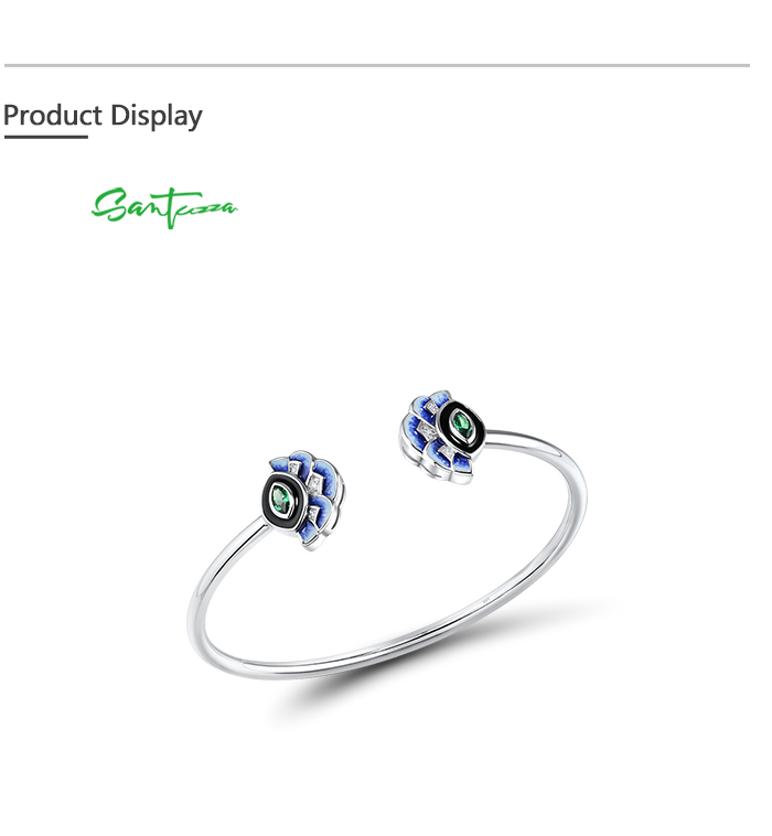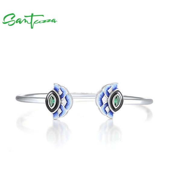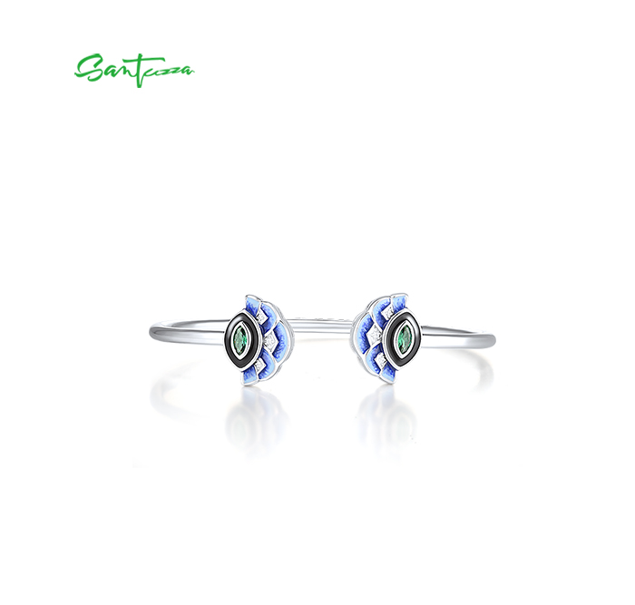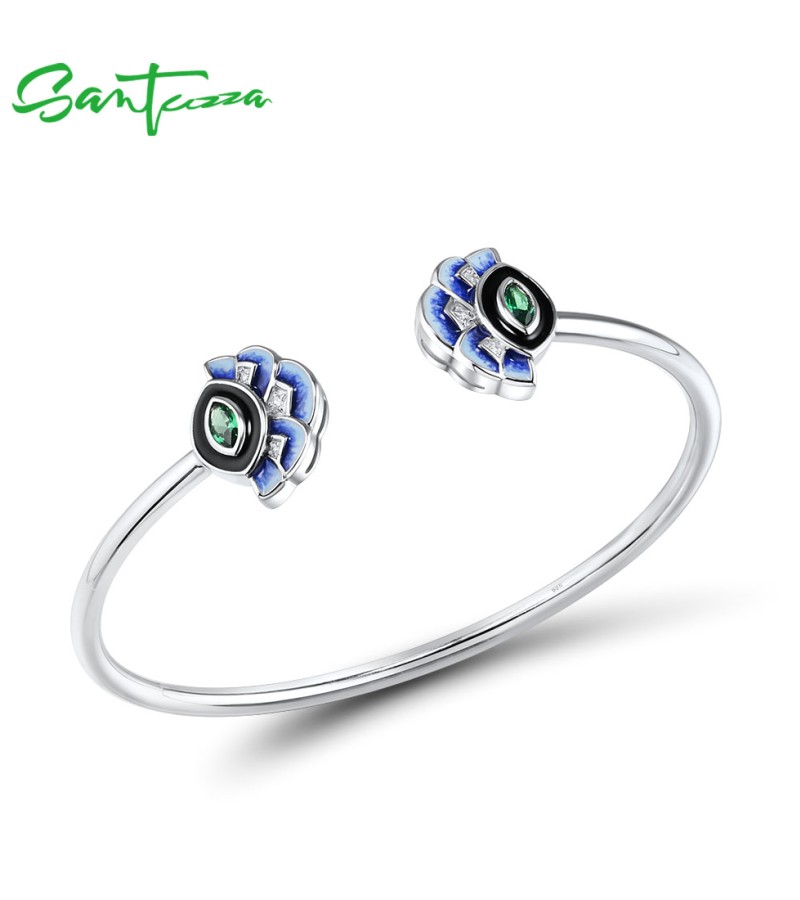 SANTUZZA 925 Sterling Silver Opened Bangle Delicate Blue Fan Shape Enamel Jewelry